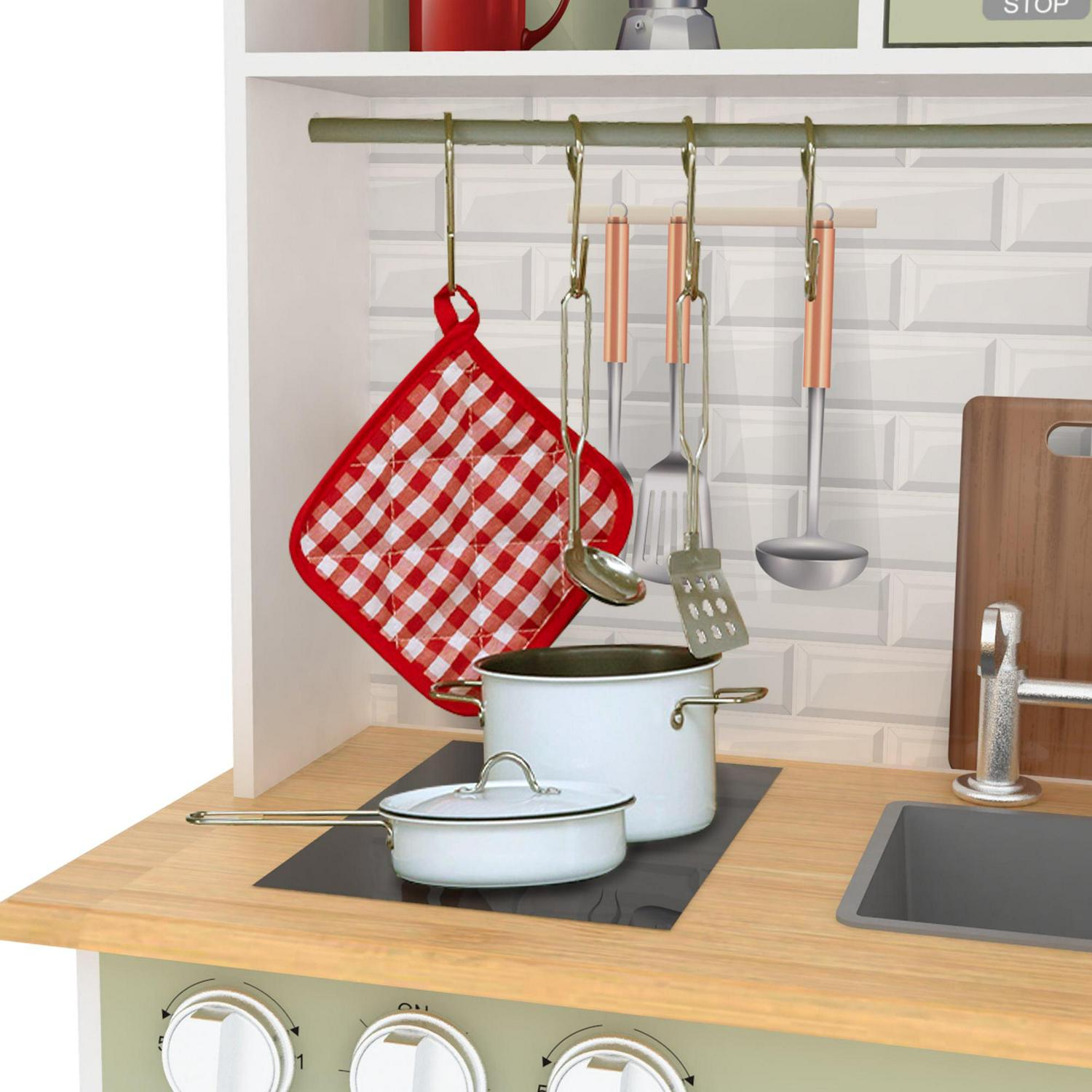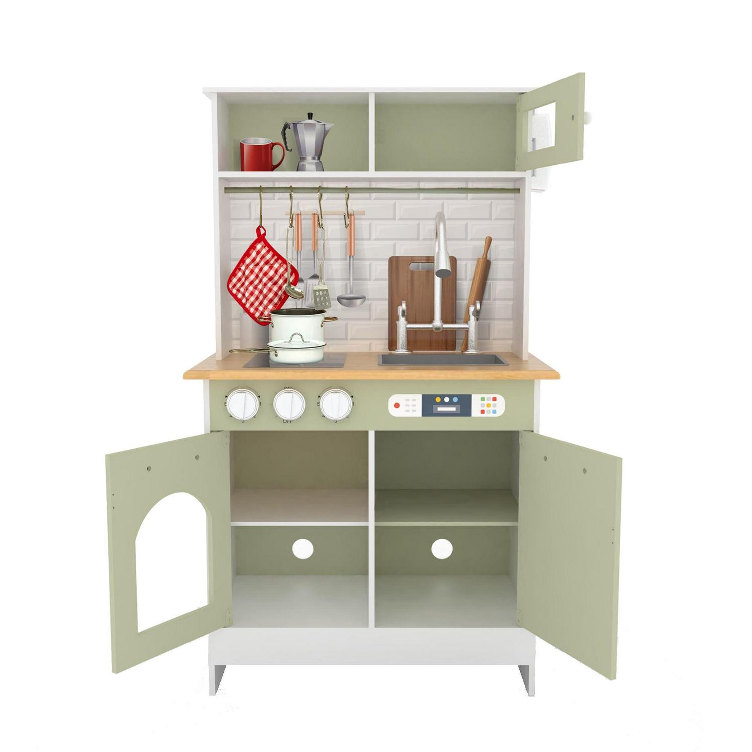 Give your little one their own cooking space with the Teamson Kids Little Chef Boston Kids Kitchen Playset. This modern play kitchen features white and light olive green finishes with a subway tile style backsplash and silver accents. making it great for both boys and girls. and it completes any home. classroom. preschool. or daycare playroom. The functional and interactive design features three openable doors. three rotating and clicking oven knobs. two printed induction burners. a sink with faucet. a storage shelf. and four hanging hooks to enhance your little one’s play time. With 9 included accessories a plastic pot with lid. a pan. a spatula. a ladle. salt and pepper shaker bottles. and a phone this toddler kitchen encourages role play and lights up your little chef s imagination and creativity.
