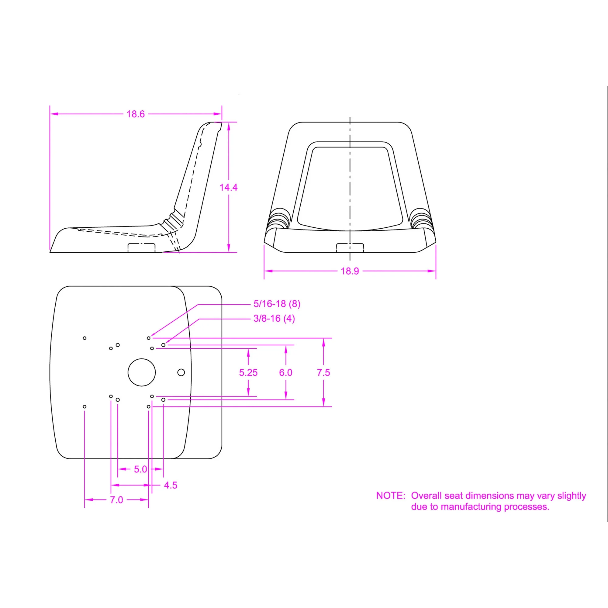 - Universal bolt pattern 5.25" x 4.5"; 6" x 5"; 7.5" x 7"; 1/2" center bolt