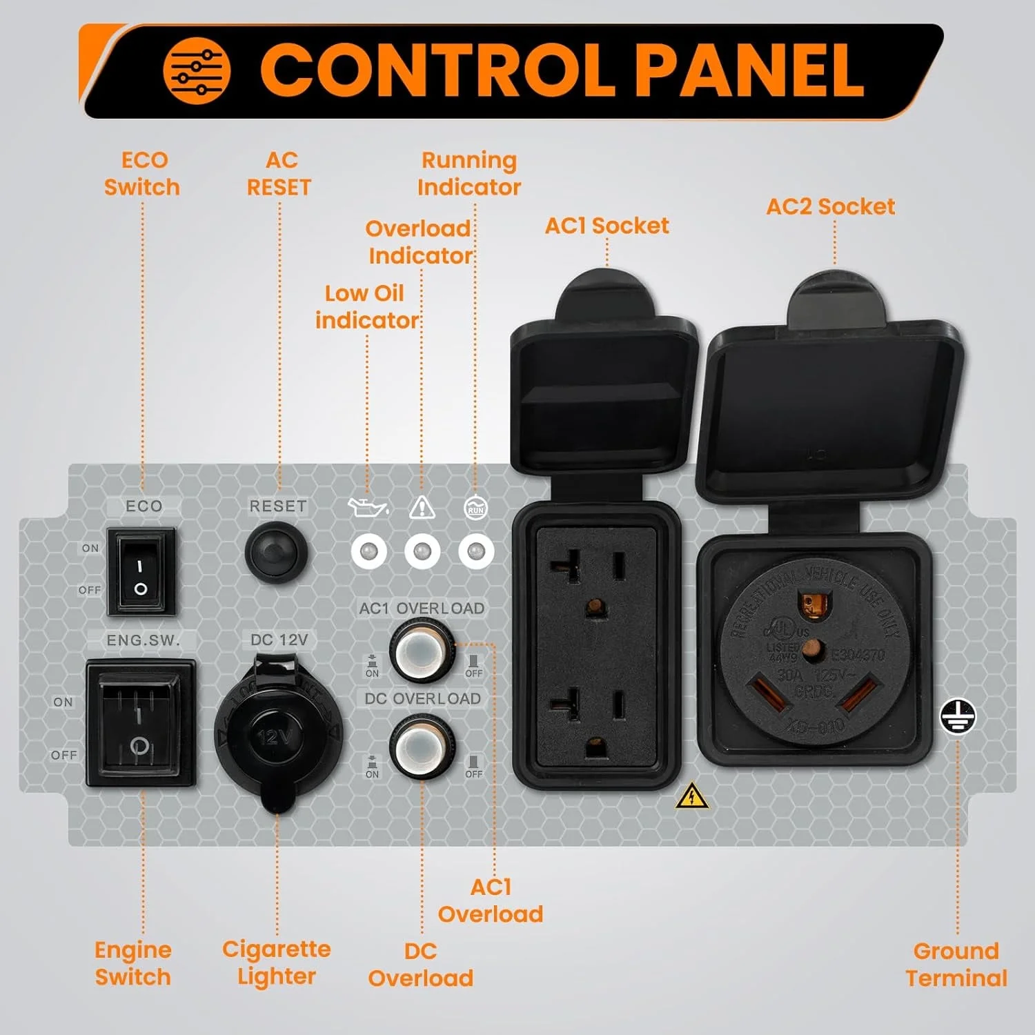 - Extended Runtime: Featuring a 3.2 gallon tank with ECO mode, it delivers an impressive 14 hours of runtime at 25% load, providing reliable long-term operation with infrequent refueling needs. Automatically adjusts engine speed to save fuel and extended working time under a low demand.