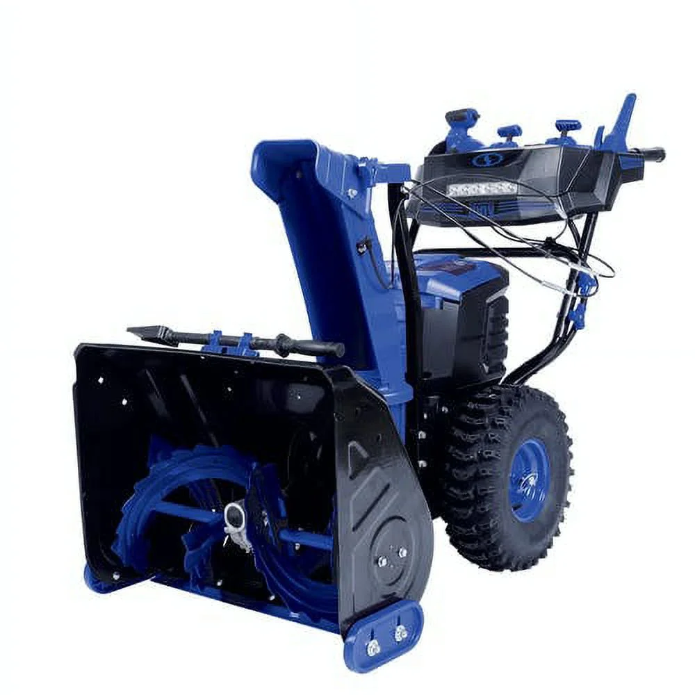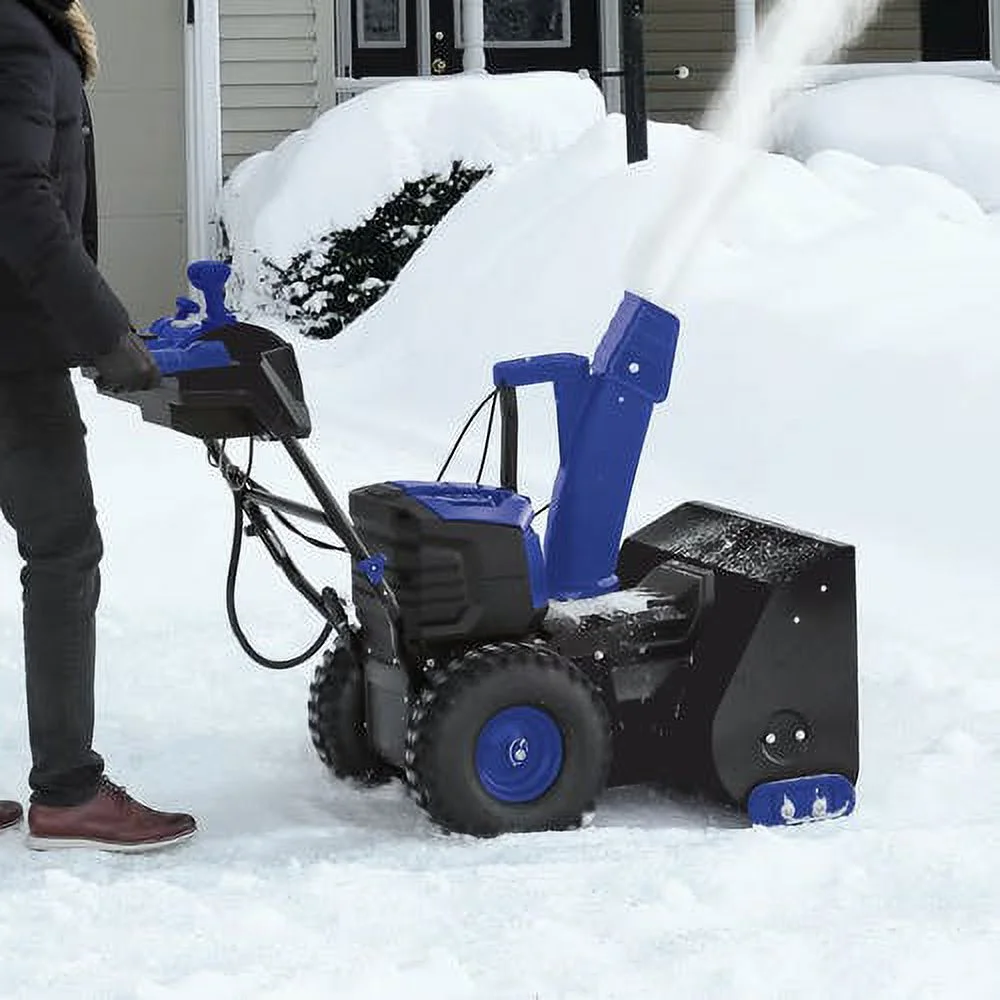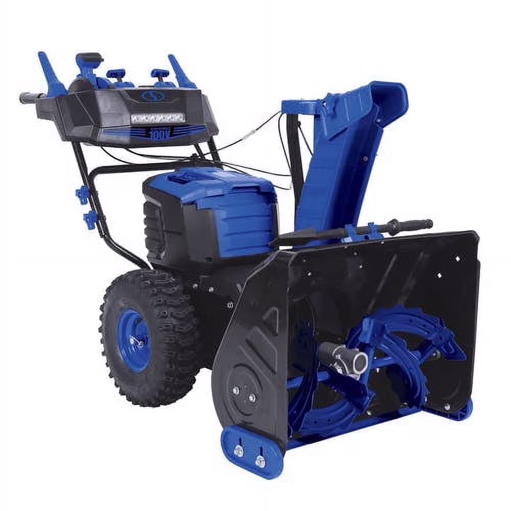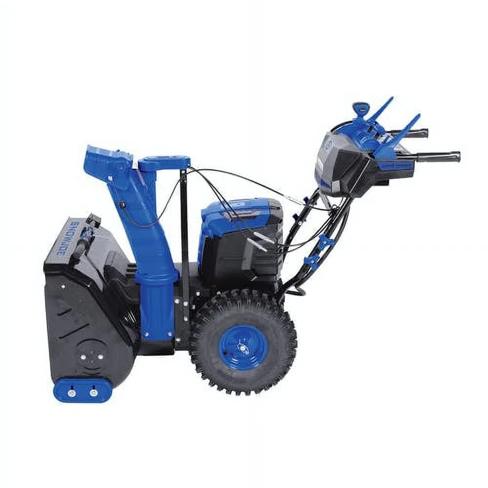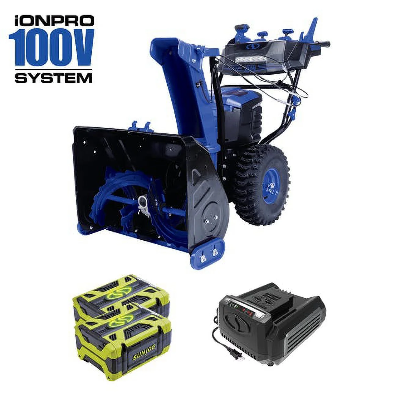 The next-generation winter-weather warrior meets the legendary line-up of iONPRO snow-clearing tools with the 100-Volt 24 in. Cordless Dual-Stage Snow Blower from Snow Joe. iONPRO features 2 high-capacity 100-Volt, 5.0 Ah lithium-ion cells that deliver no-fade power plus performance. iONPRO's 4000-Watt brushless plowing motor is engineered for efficiency, providing you with maximum performance. And the self-propelled, 500-Watt brushless drive motor saves you time and energy, moving the unit forward to minimize the strain of pushing through heavy, dense snow. iON's control panel gives you automatic speed control, chute rotation, reverse drive, and an LED headlight. Equipped with a variable-speed, heavy-duty 2-blade serrated steel auger, iON's powerful 4000-Watt brushless motor effortlessly clears a path 24 in. W and 17.5 in. D in a single pass. iON's dual serrated steel blades shreds through up to 1720 lbs./min, to clear over 3200 sq. ft. of snow on a single charge. Snow Joe's 180 auto-rotate chute lets you throw snow up to 52 ft. away in any direction at the push of a button. The 15 in. W textured TracAssist rubber tires provide increased traction, for slip-free and slide-free performance every time. And the scraper bar at the base of the unit lets you clear right to the ground for a clean path on the first pass.