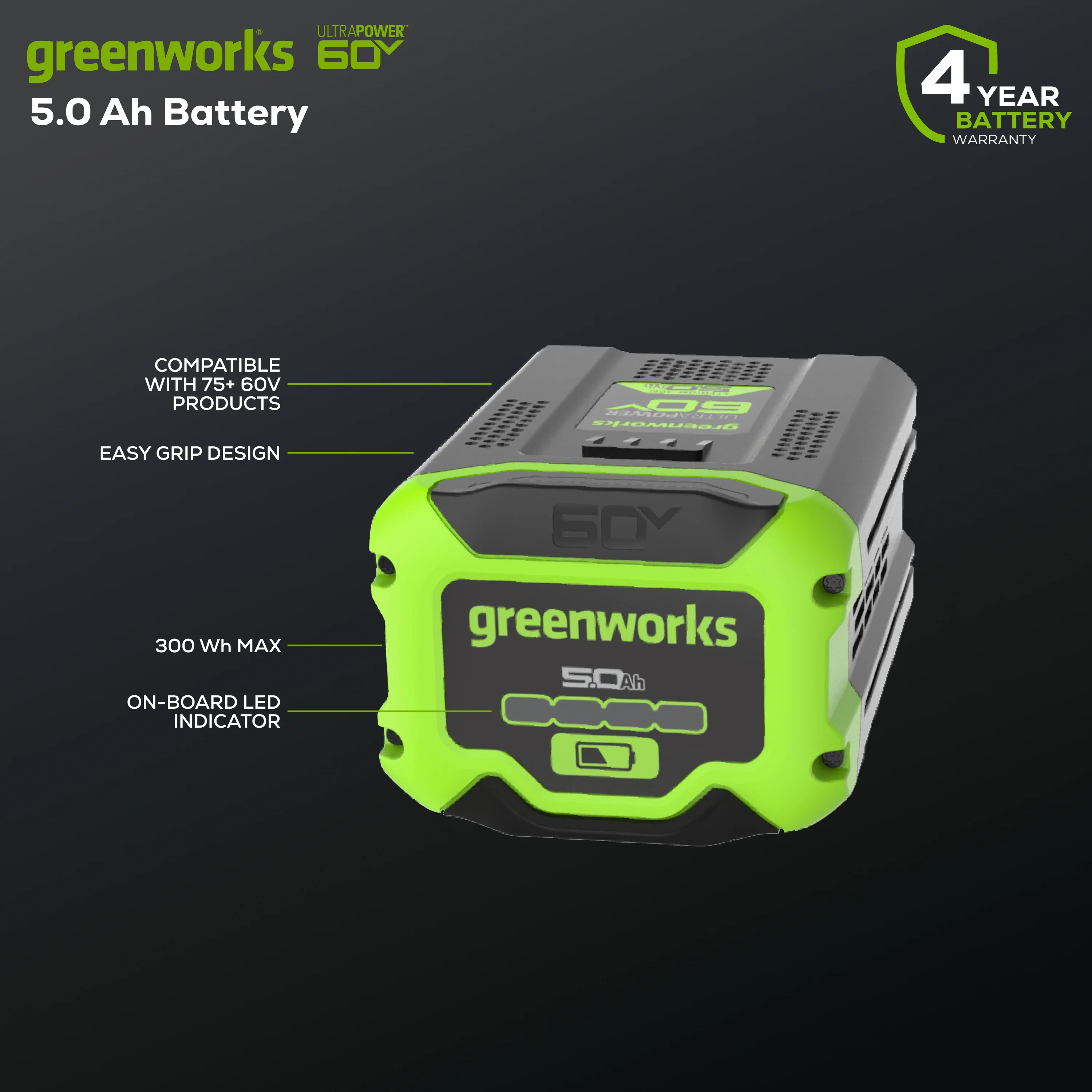 - New Greenworks 60V 5.0 Ah HC Battery: