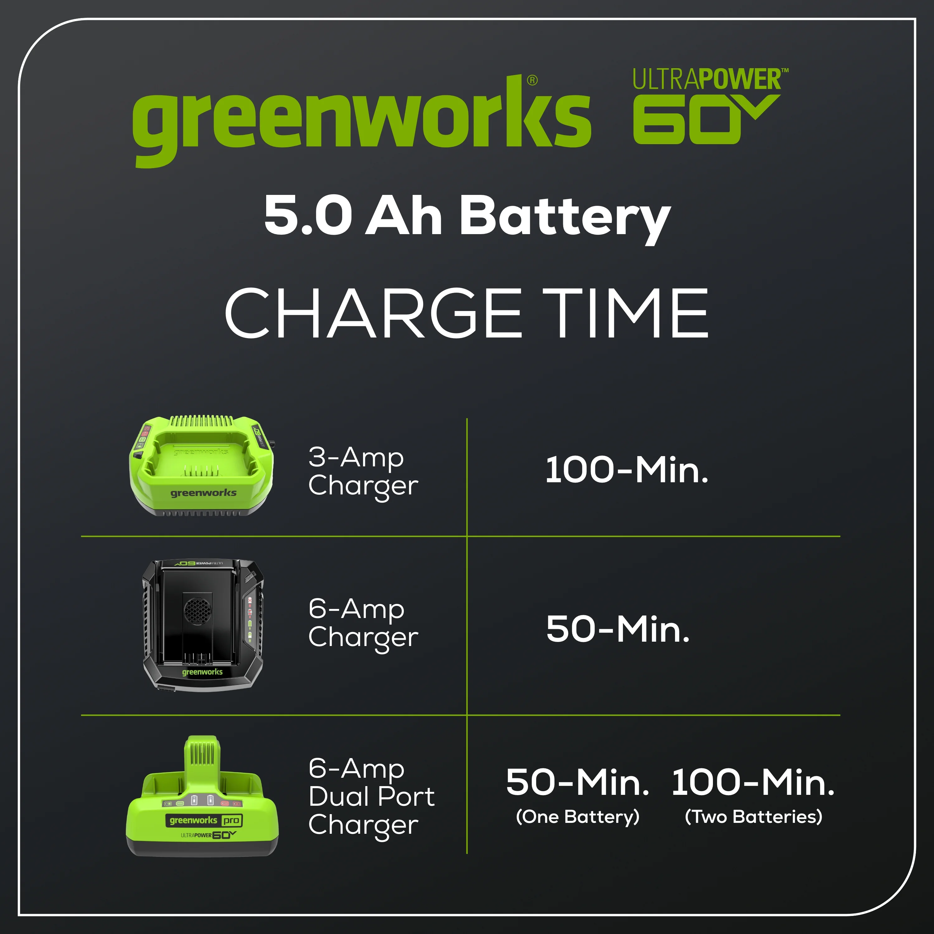 - Compatible with all Greenworks 60V tools