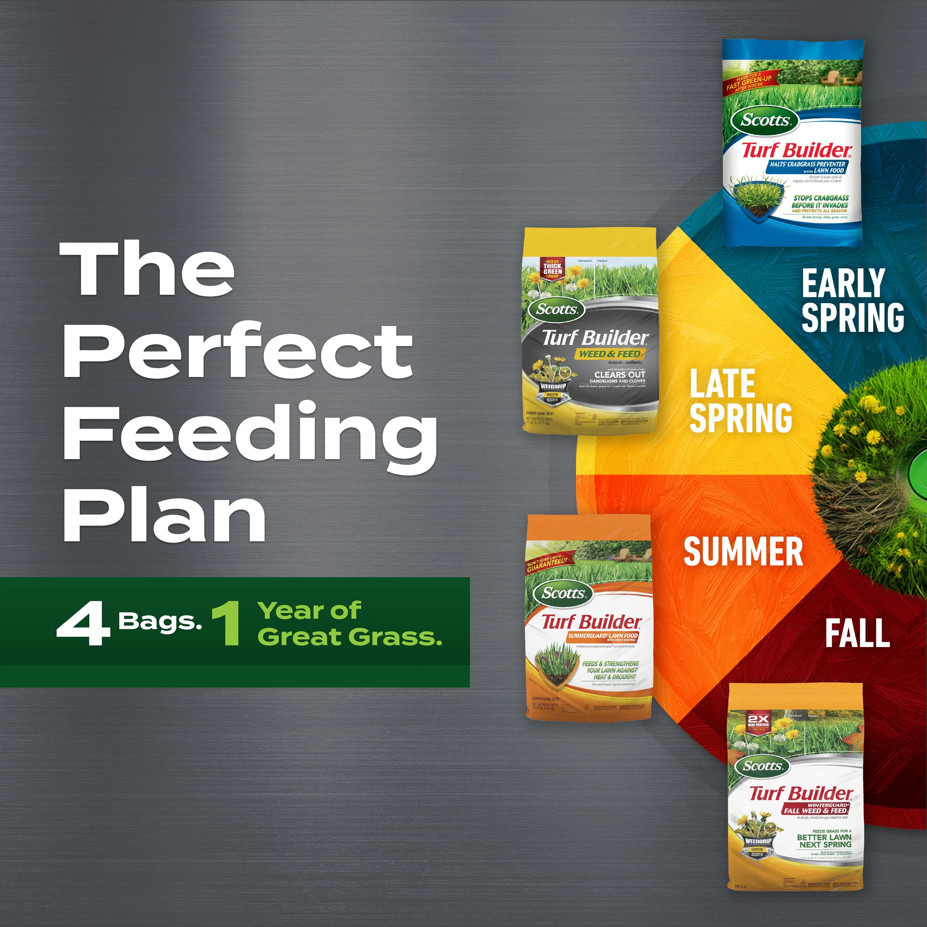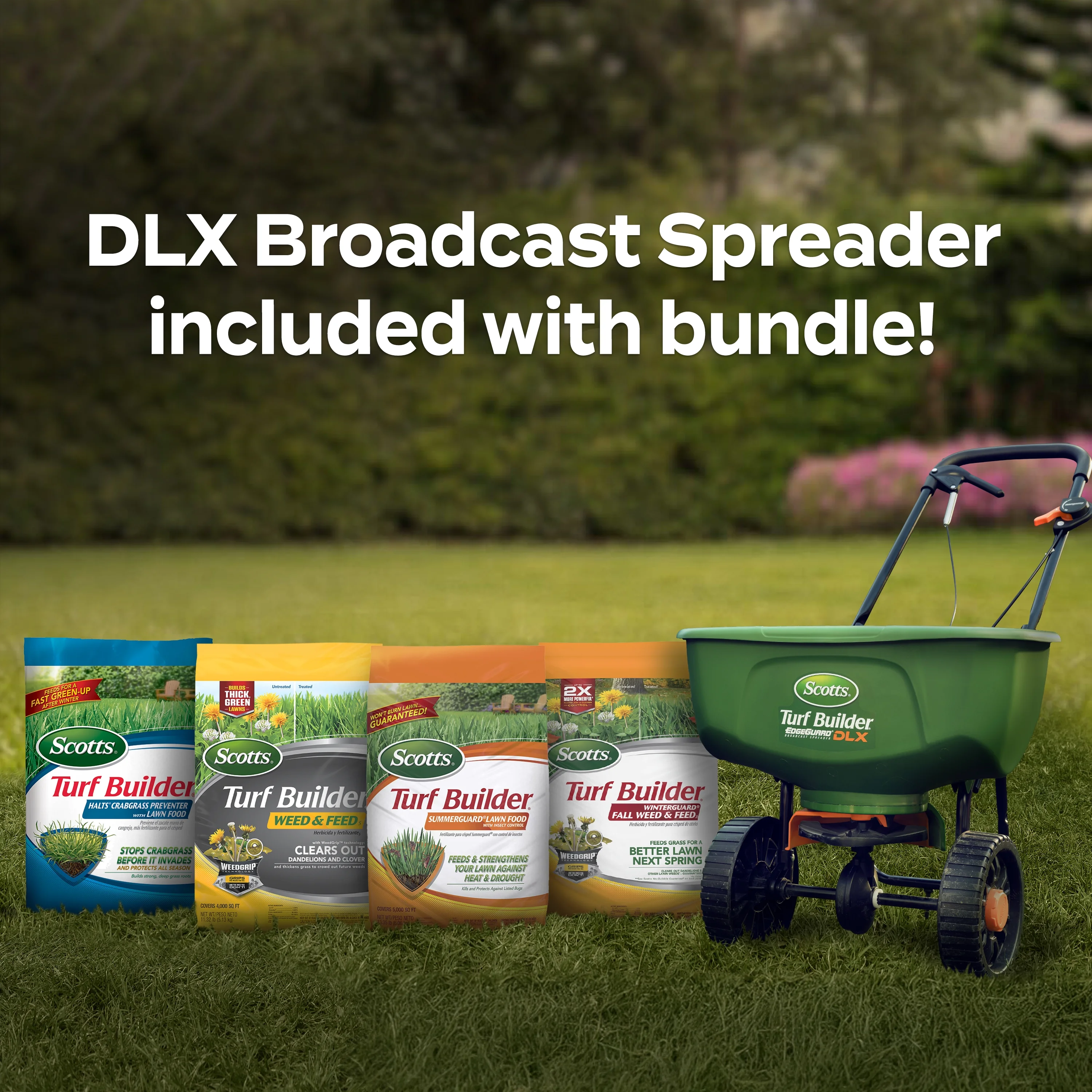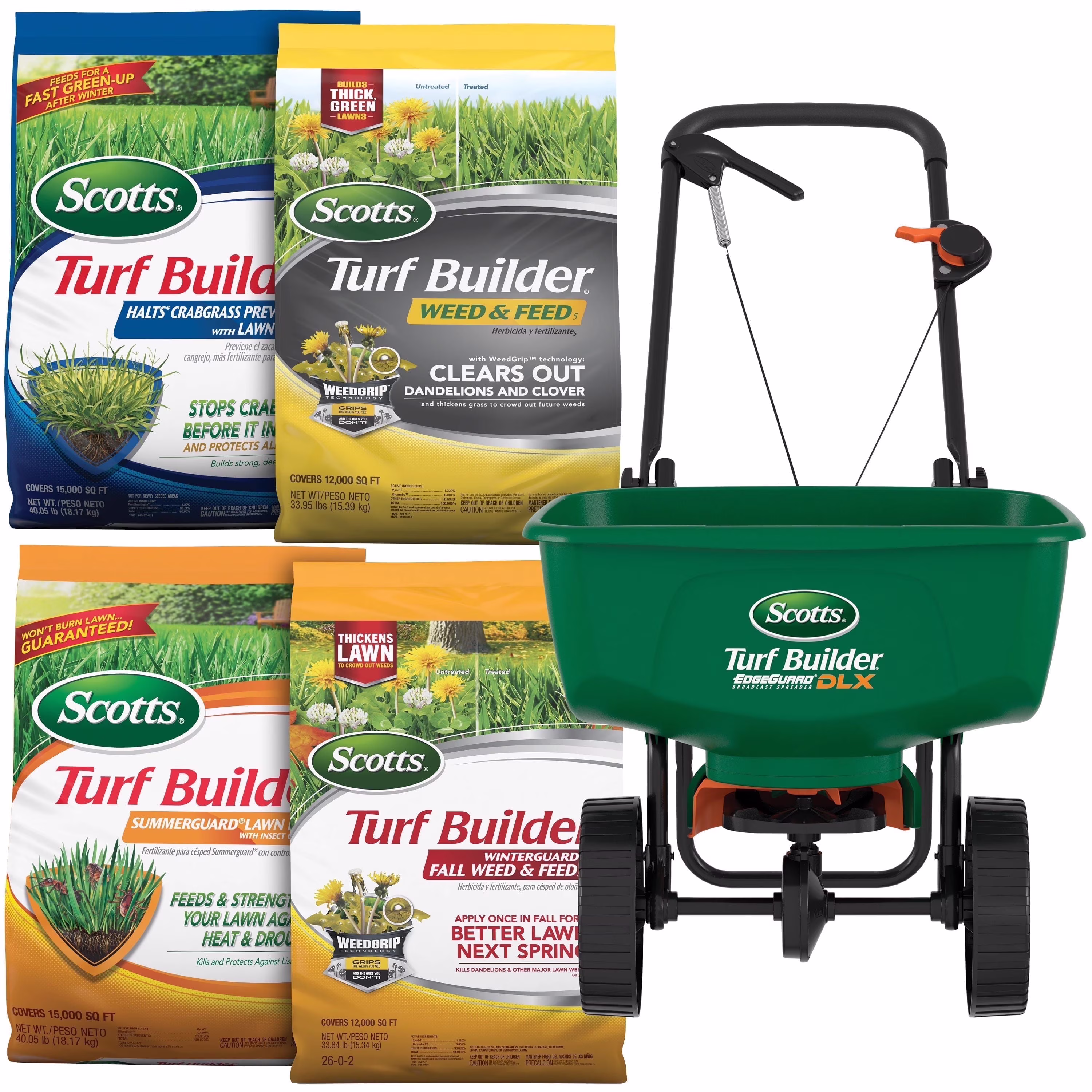 - Includes 4 Scotts? Turf Builder? lawn products, one application for each season, plus a Scotts? Turf Builder? EdgeGuard? DLX Broadcast Spreader for more consistent coverage