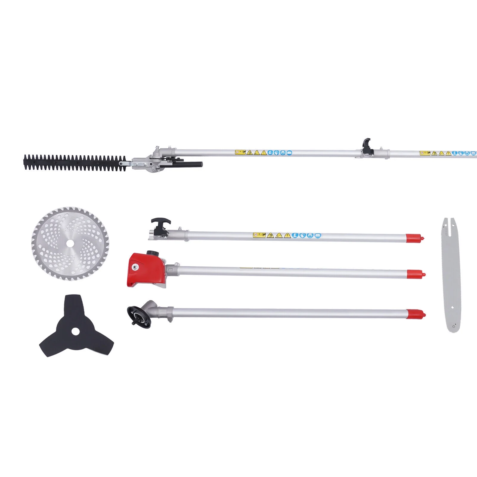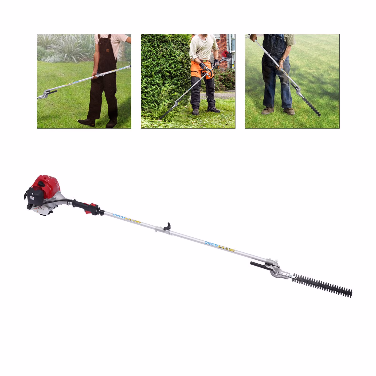 4-in-1 Function: Thanks to the quick fasteners, this product can be easily converted from lawn edge cutter to brush cutter, hedge trimmer, or chainsaw to meet your different needs and can be stowed away to save space. Meanwhile, the 4-in-1 function design allows you to have many different working functions by purchasing one product, which is very economical. - Extension Function: The extension bar can extend the product to a fabulous height to help you trim high branches and grass in the distance.