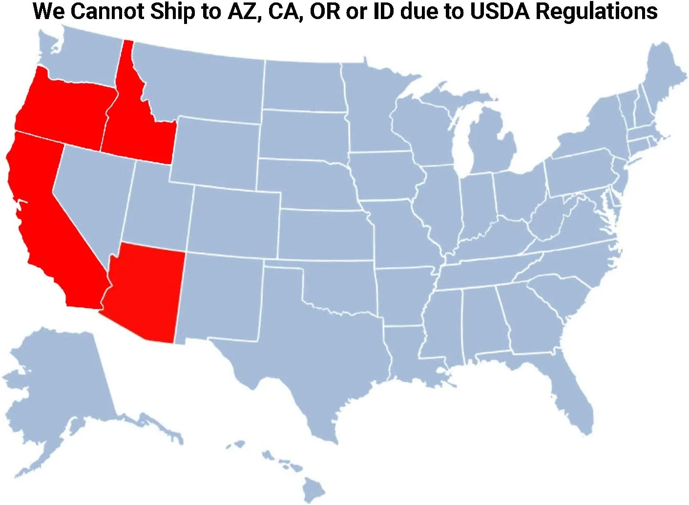 - Due to agricultural restrictions, we cannot ship to AZ, ID, OR, CA