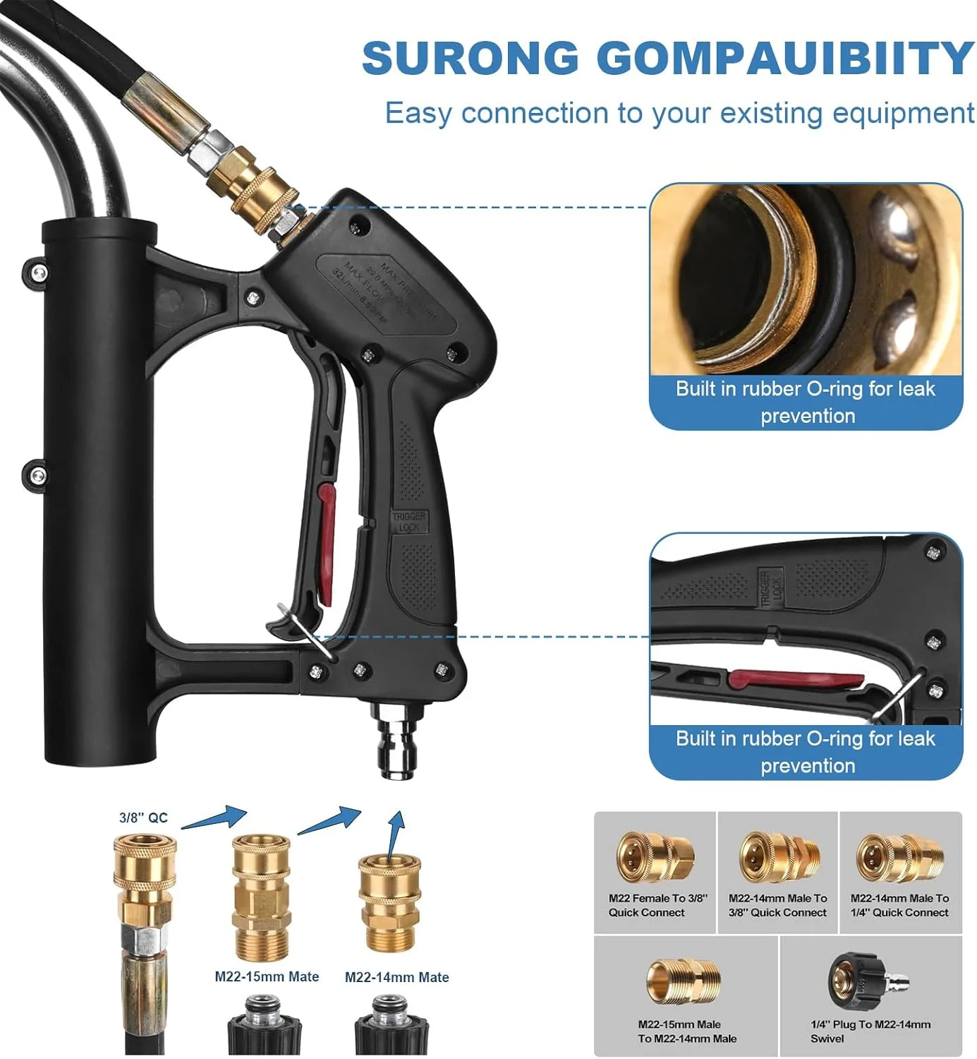 - Compatible with pressure washers above 2000 PSI 2 GPM
