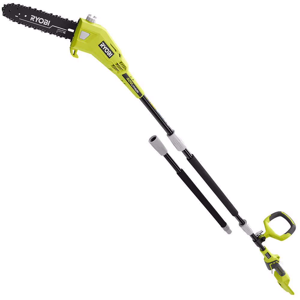Product overview tackle all of your pruning and lambing jobs with the ryobi 40-volt pole saw. This saw easily extends from 6.5 ft. To 9.5 ft, allowing you to trim hard to reach places. The powerful in-line motor and angled cutting head allow for precise cutting with the 10 in. Bar and chain. This pole saw features an automatic bar and chain oiler, for convenient operation and maintenance. This tool is compatible with all 40-volt batteries. The ryobi 40-volt pole saw is backed by a 5-year warranty. California residents 6.5 ft. Or 9.5 ft. Adjustable length in-line motor for precision pruning better cut control with the angled head 10 in. Bar and chain automatic oiler for smooth operation compatible with all ryobi 40-volt batteries 5-year warranty specifications dimensions bar length (in.) 10 in. Chain size 10 in. Maximum cut diameter (in.) 8 maximum pole length (ft.) 9.5 details battery amp hours no battery power type lithium ion battery size 40-volt battery/charger tool only chain pitch 3/8 in. Chain speed (mps) 5.4 chainsaw bar size small chainsaw type pole chainsaw/ pruner charger included charger not included condition new drive links 40 features antivibration handle, automatic chain oiler gauge .043 included chain, scabbard number of batteries included 0 power type battery product weight (lb.) 9.5 refurbished no returnable 30-day torque maximum (nm) 2.52 voltage (volts) 40.