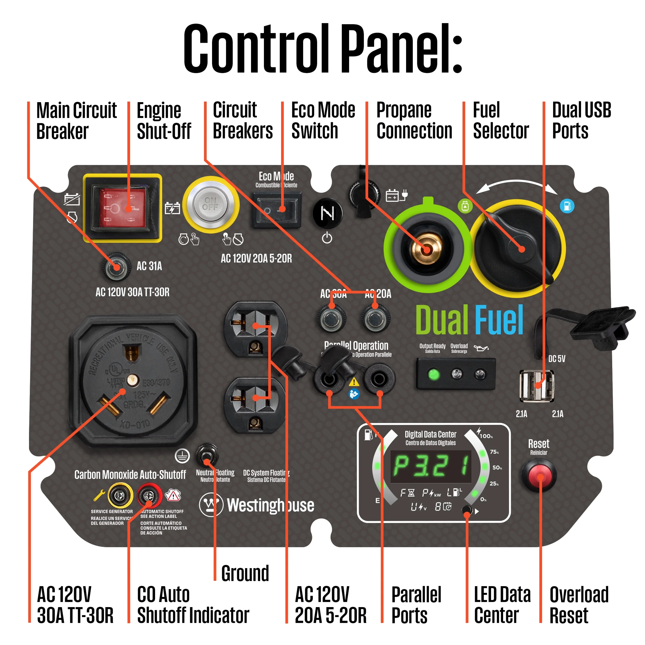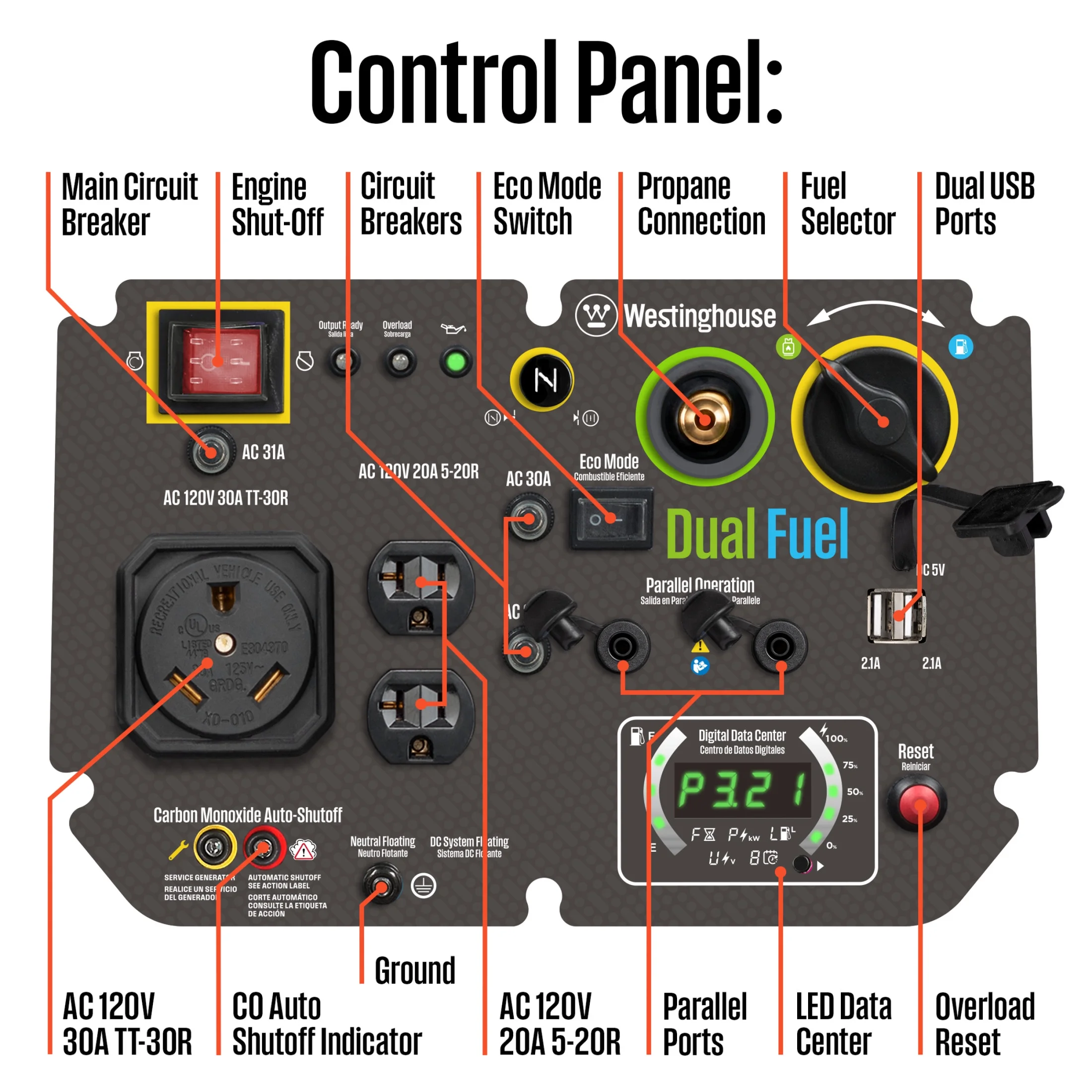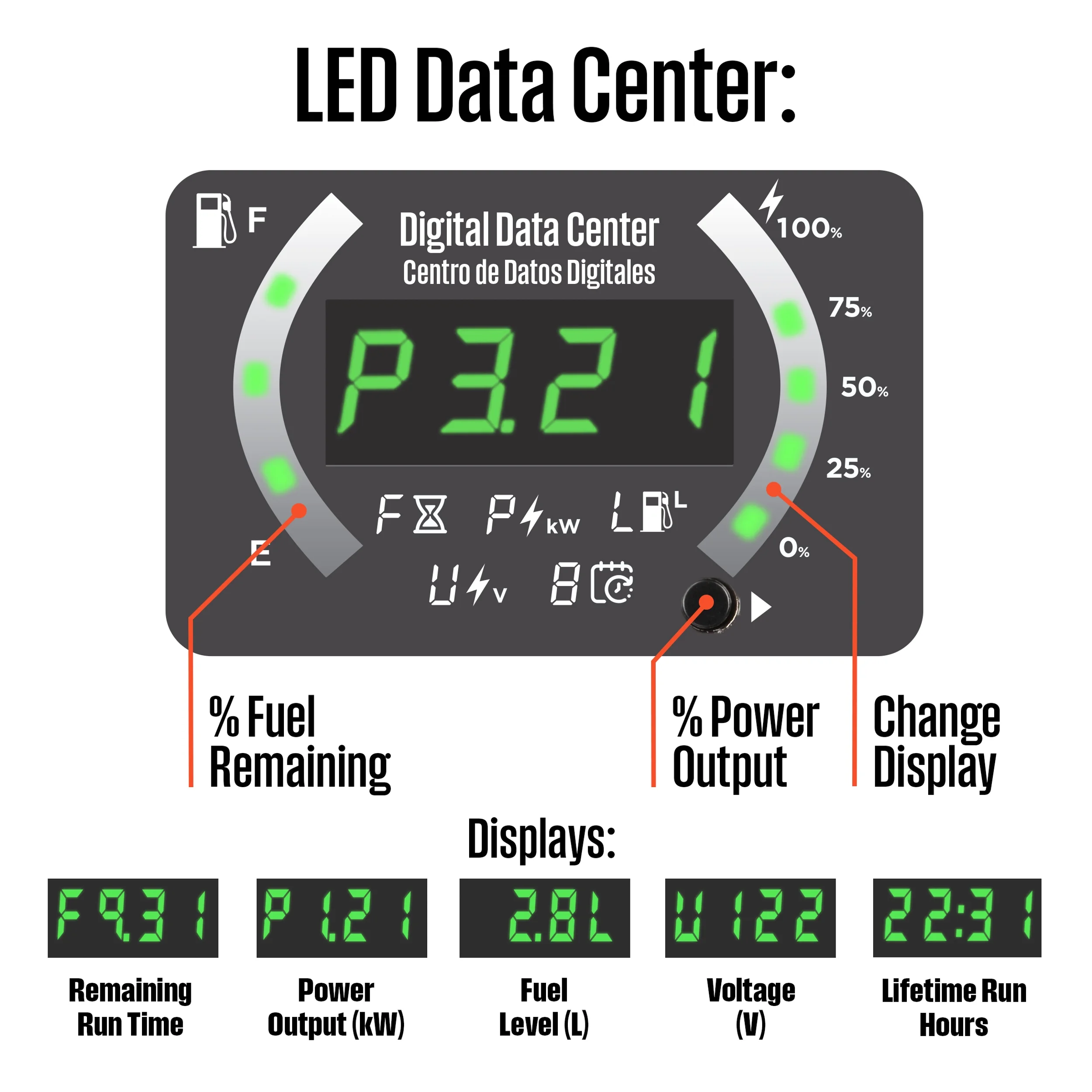 - Real-time LED display with runtime, remaining fuel, load/output, volts and lifetime hours data