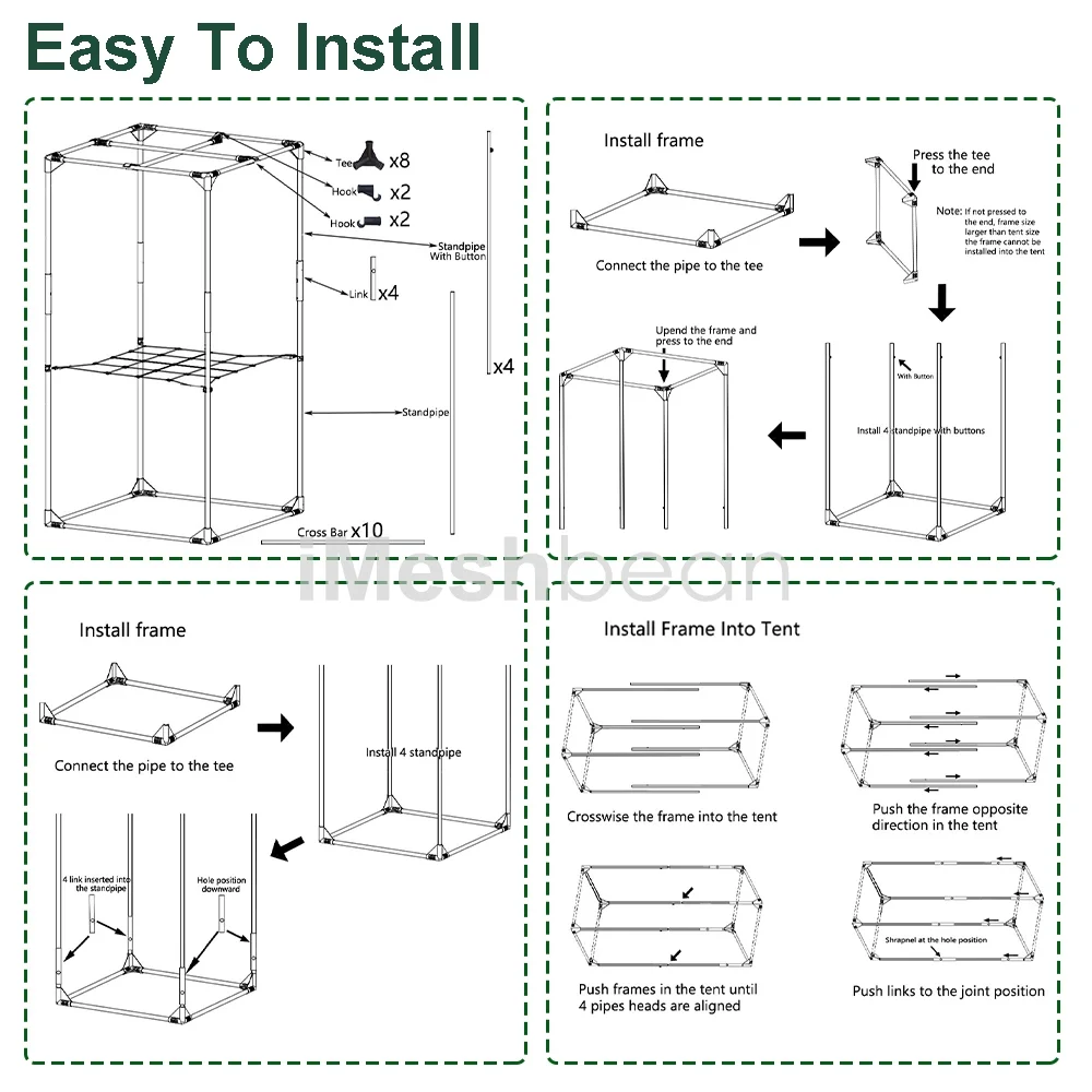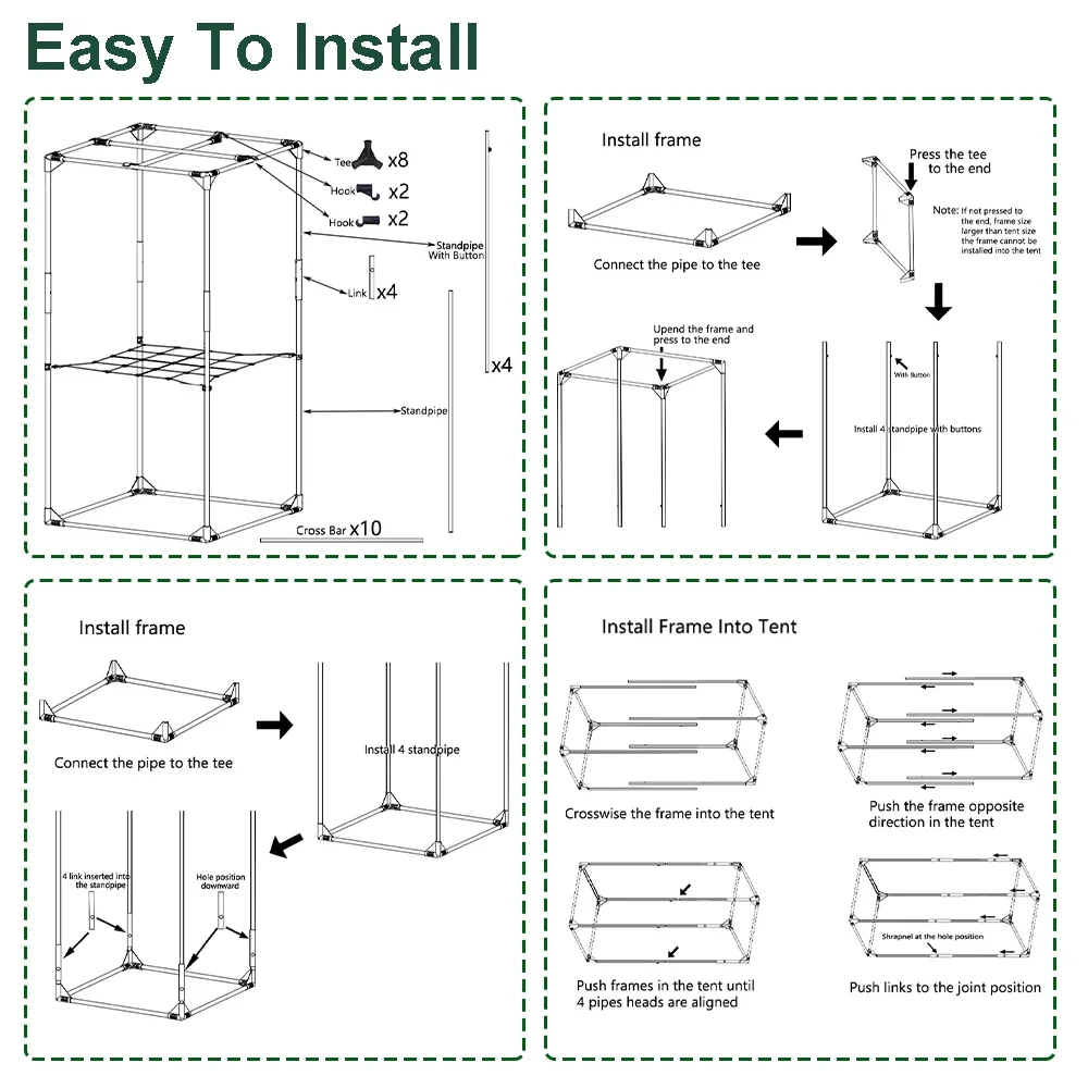 - Sturdy: Frame and all corner supports are crafted from powder-coated, high-grade, high-capacity tubular steel; won't crack like plastic tubing/fittings and won't collapse or sag like aluminum. Removable upper rails provide overhead support for lighting, odor control and ventilation systems.