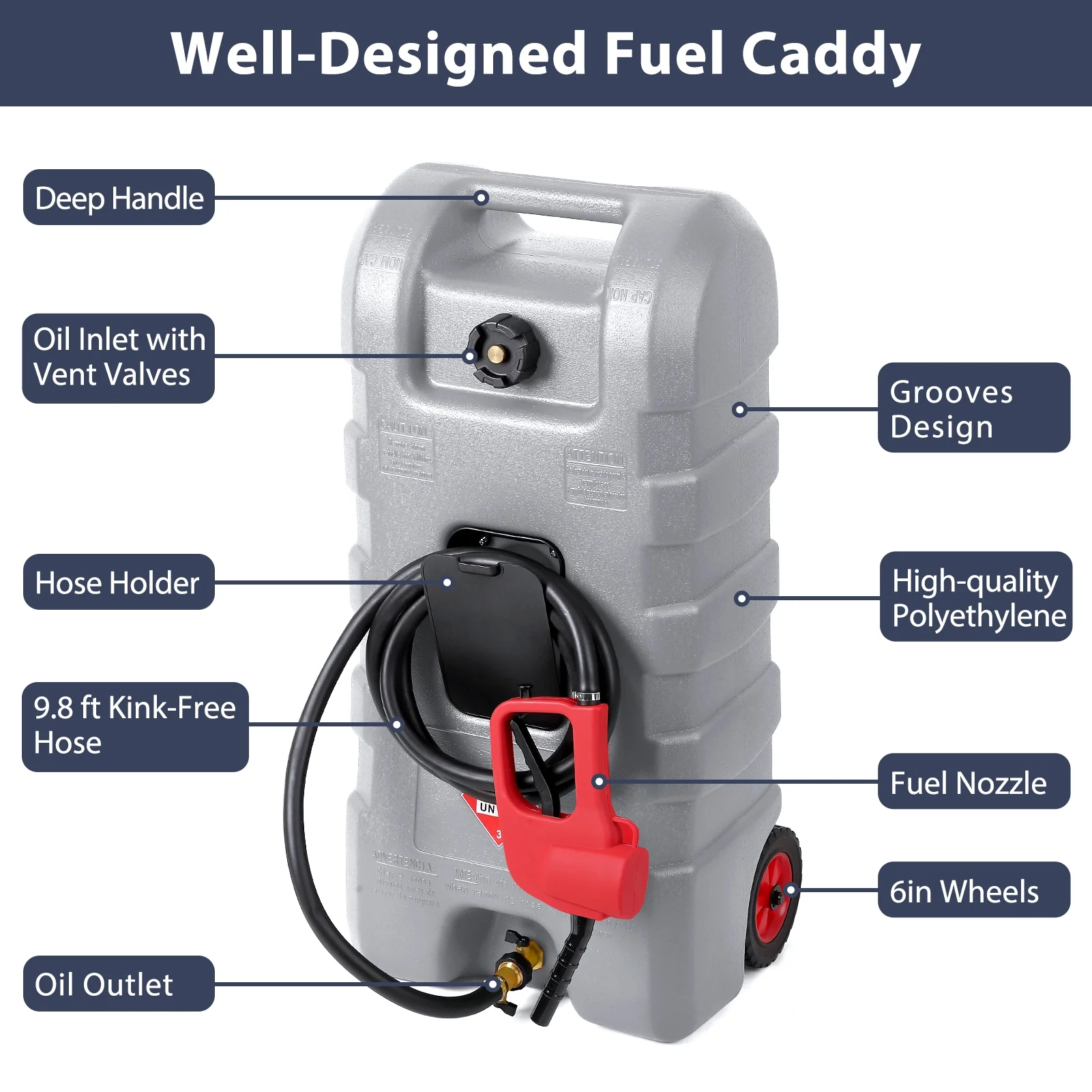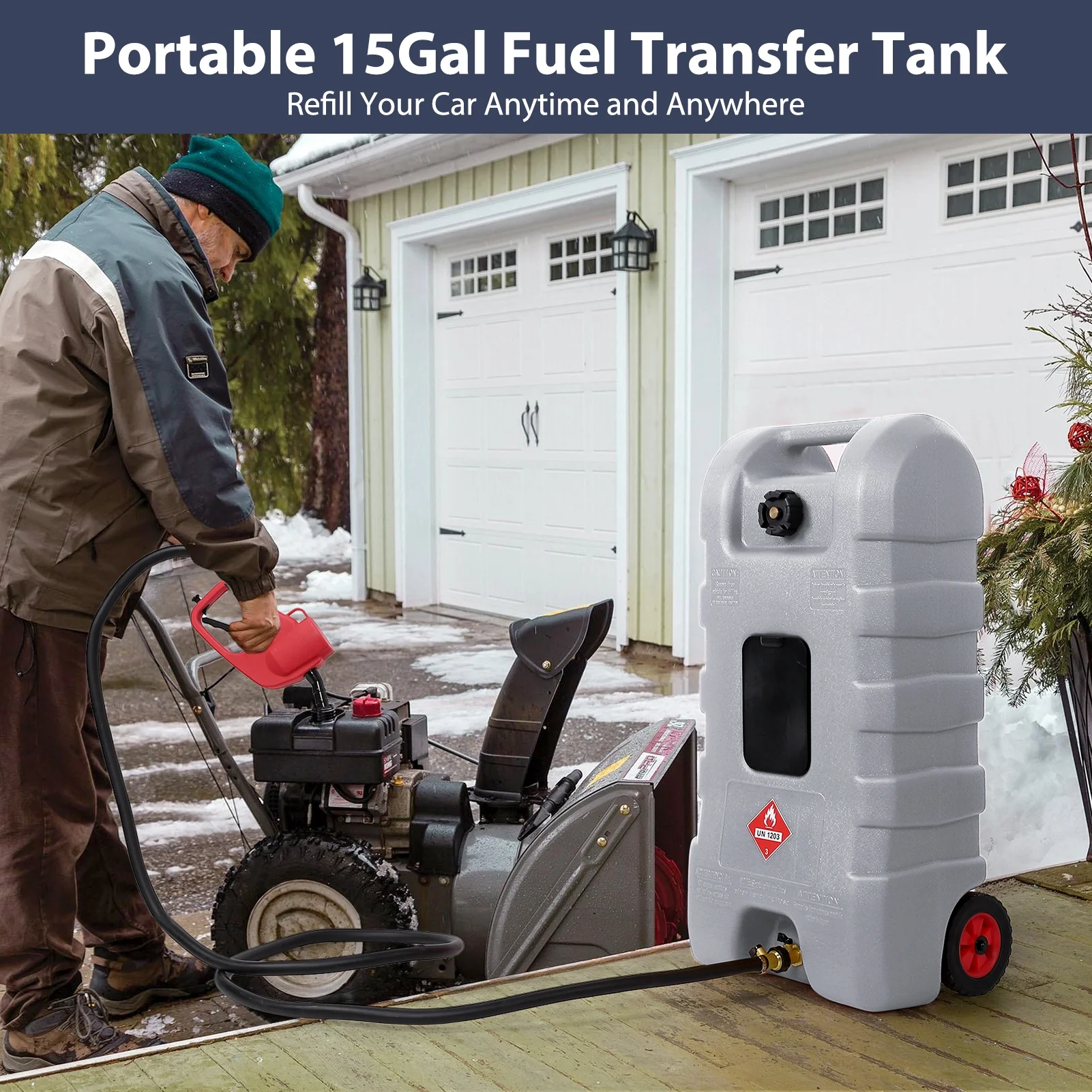 15 Gallon Fuel Caddy, Portable Gas Fuel Tank Container with LE Fluid Transfer Siphon Pump and 10ft. Delivery Hose, Diesel Storage Can on - Wheels for Cars, Lawn Mowers, Atvs, Boats, Gray