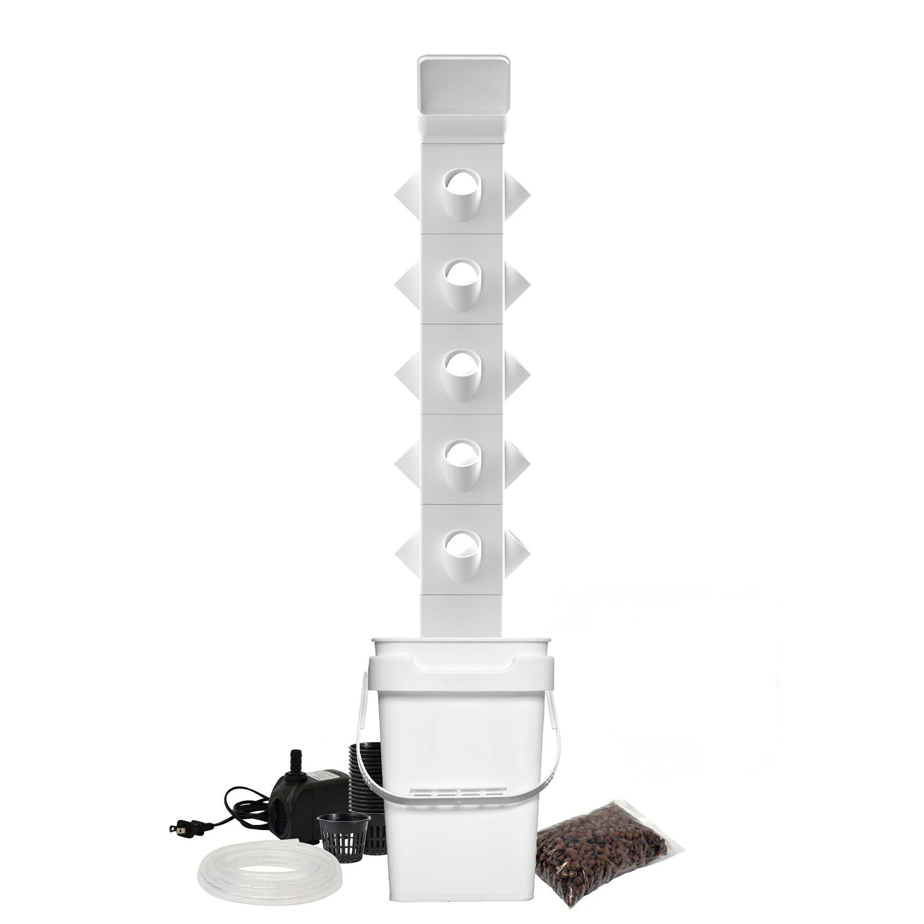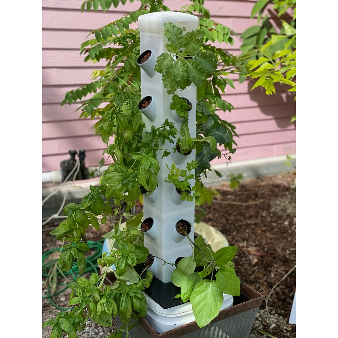 - Includes: Each vertical garden planter tower set includes 1 irrigation block (which can hold 6.5 gallons of water) and a lid that is adjoined to the 6' of irrigation tubing; also includes 1 Irrigation module and lid, water pump, 20 net cups, hydroponic clay rocks, and 6 months of formulated plant food