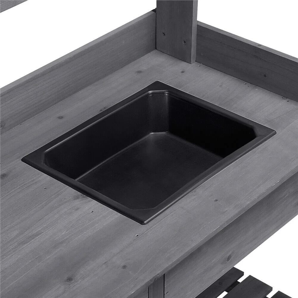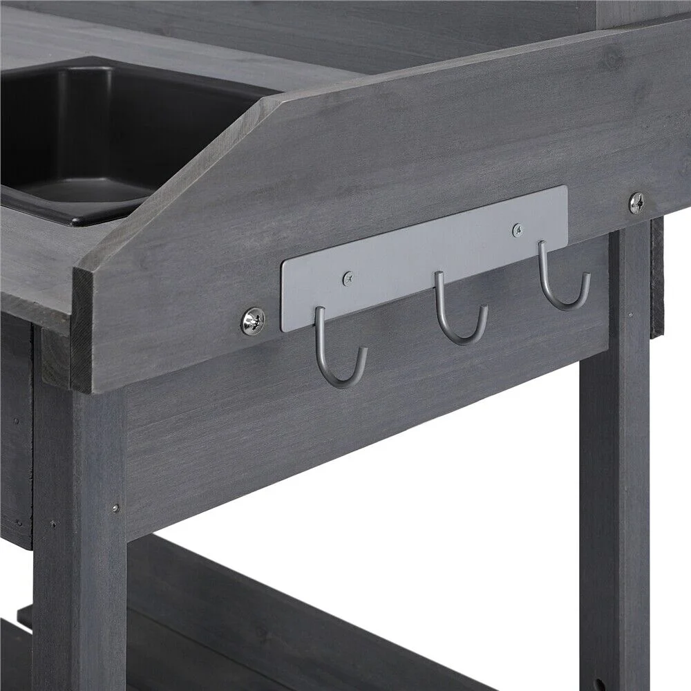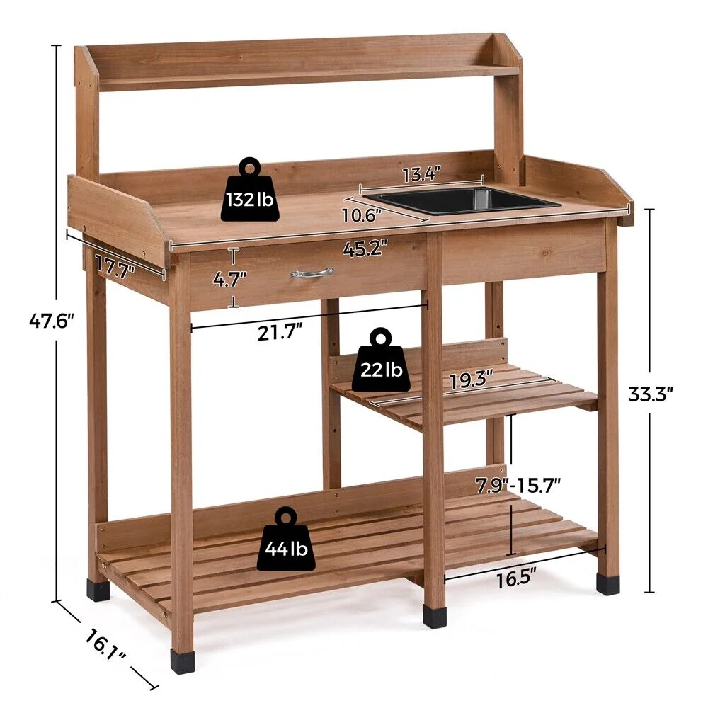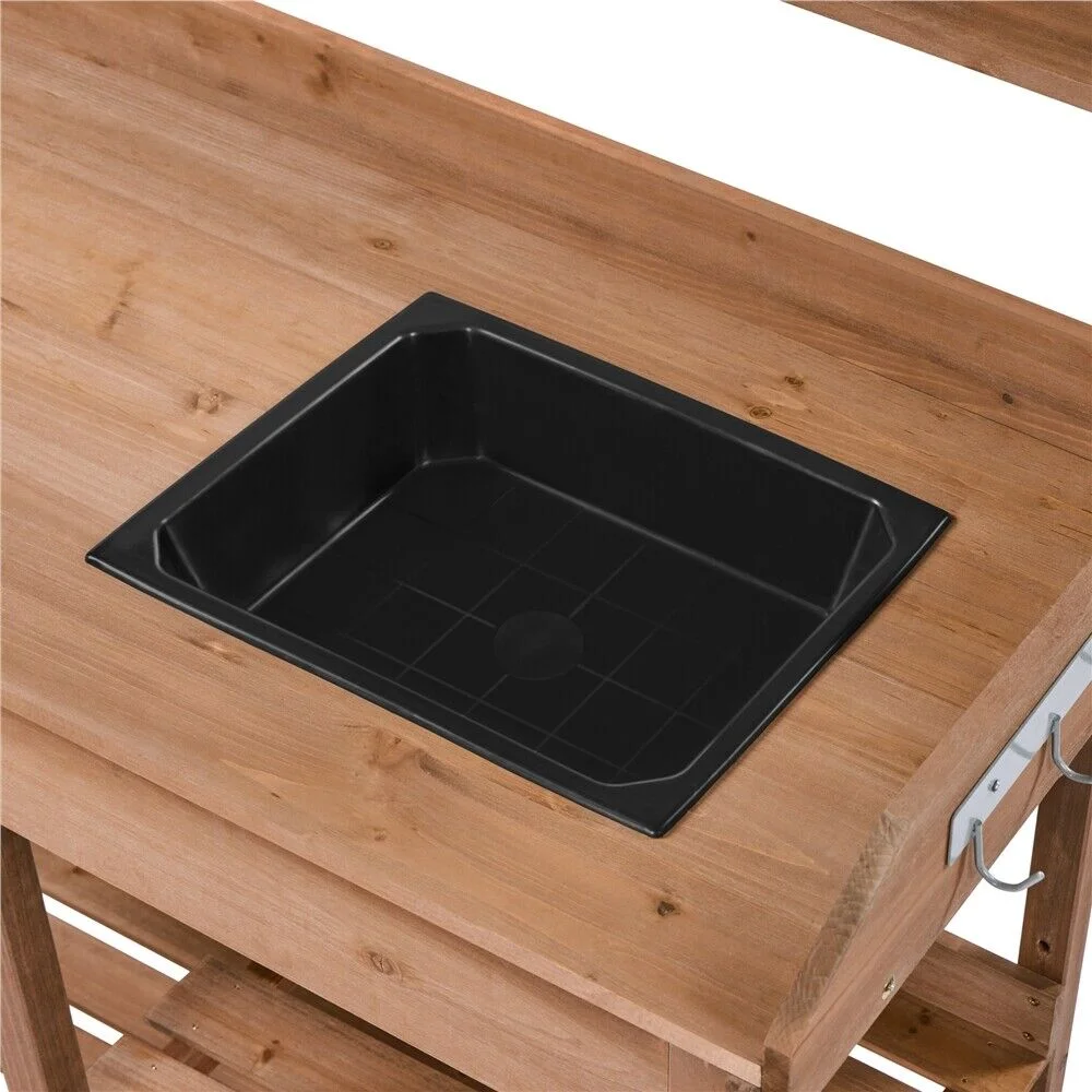 Solid wood potting table with plastic sink: Apart from looking great, 100% fir wood all over the structure has substantial fade resistance. Made of quality plastic, the 3�� deep sink of 13x11�� (LxW) sink is designed in square to serve your watering/washing needs. You can DIY a drain if necessary.