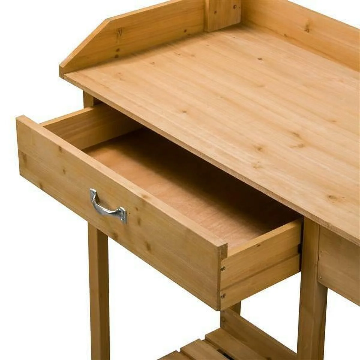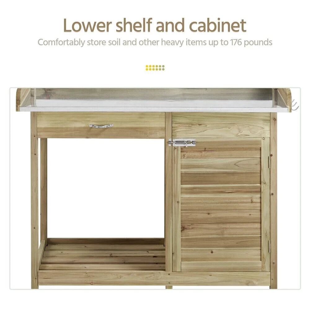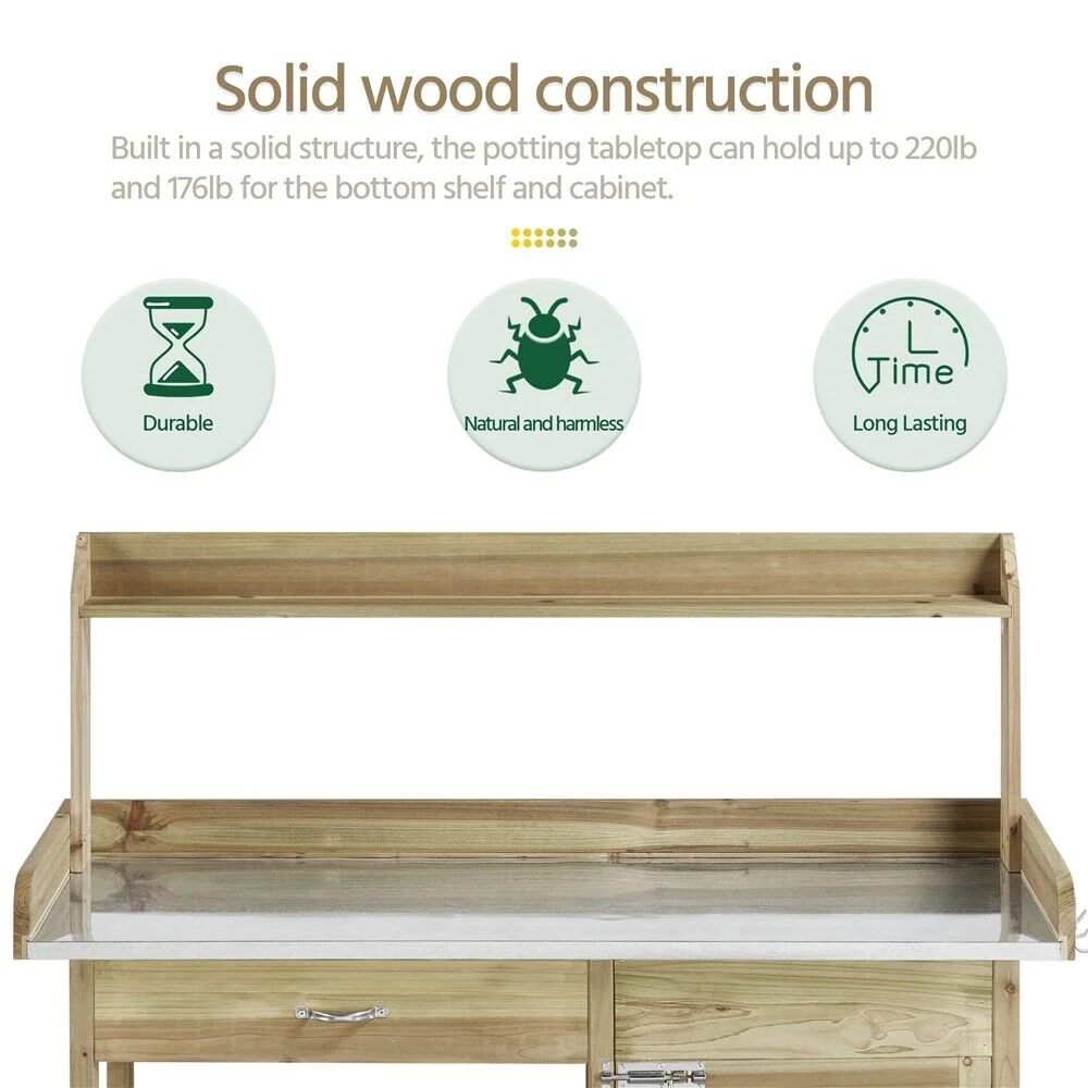 Solid wood potting table with plastic sink: Apart from looking great, 100% fir wood all over the structure has substantial fade resistance. Made of quality plastic, the 3�� deep sink of 13x11�� (LxW) sink is designed in square to serve your watering/washing needs. You can DIY a drain if necessary.