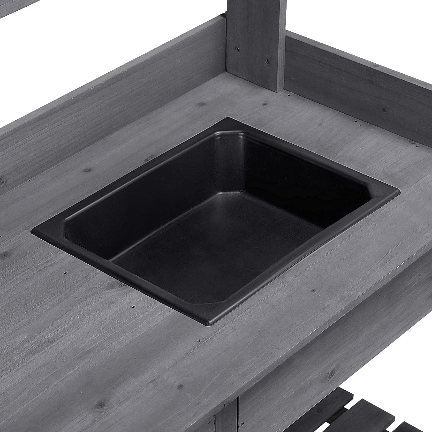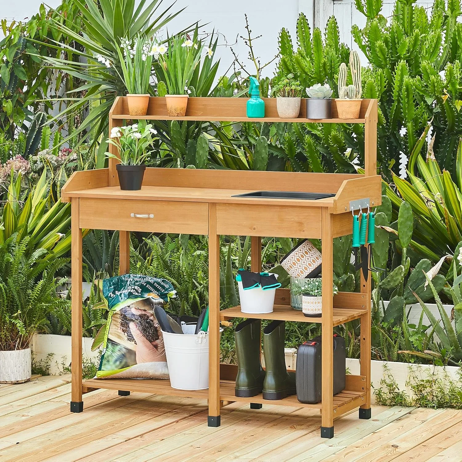 - PRACTICAL & CONVENIENT DESIGNS FOR HORTICULTURE: This waist-height garden potting bench embraces a working and storage area for horticulture. The spacious console features a removable plastic sink, and the storage area comprises a drawer, a 2-layer shelf, an elevated top shelf, and 3 side hooks for ease of use
