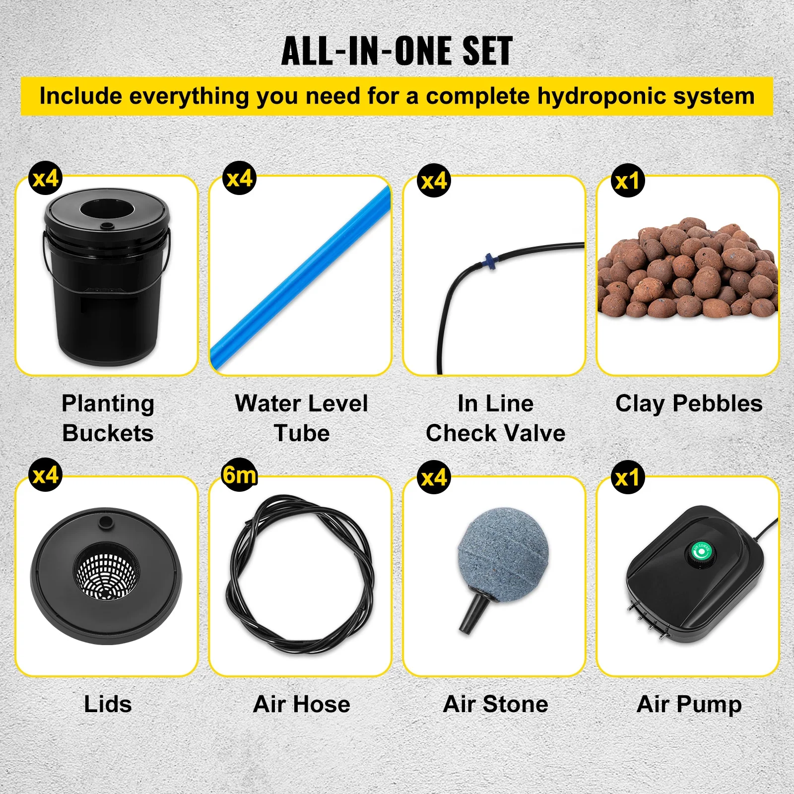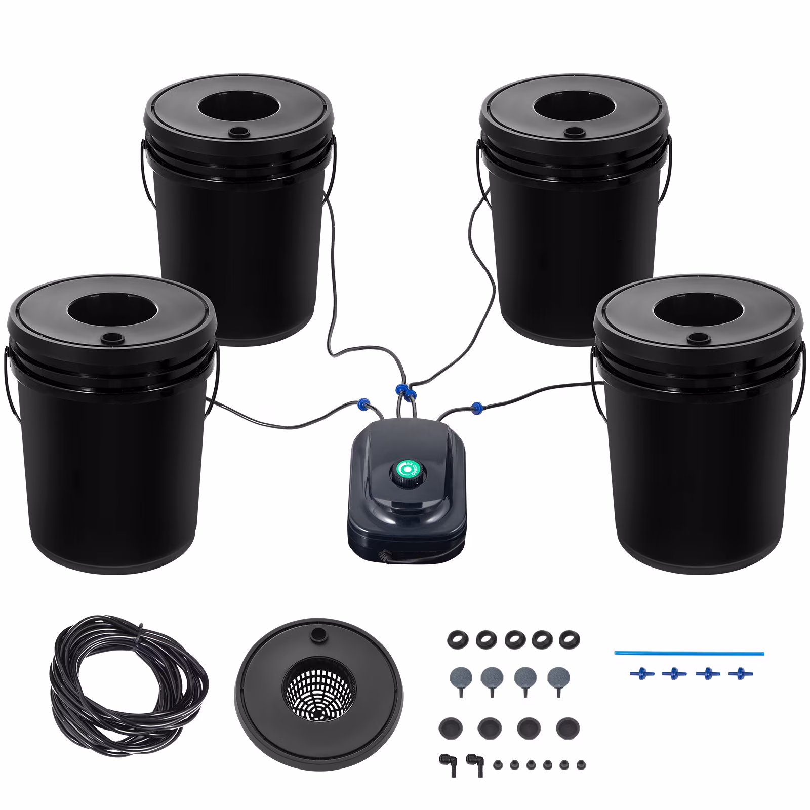 - Complete Hydroponic System: The DWC bucket system is easy to use and comes complete with accessories, including 4 planting buckets, 6m air hose, 1 connector kit, 4 water level devices, 4 check valves, 4 air stones, 1 Air pump, clay pebbles. and 1 instruction manual.