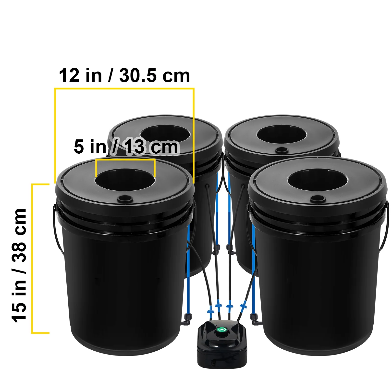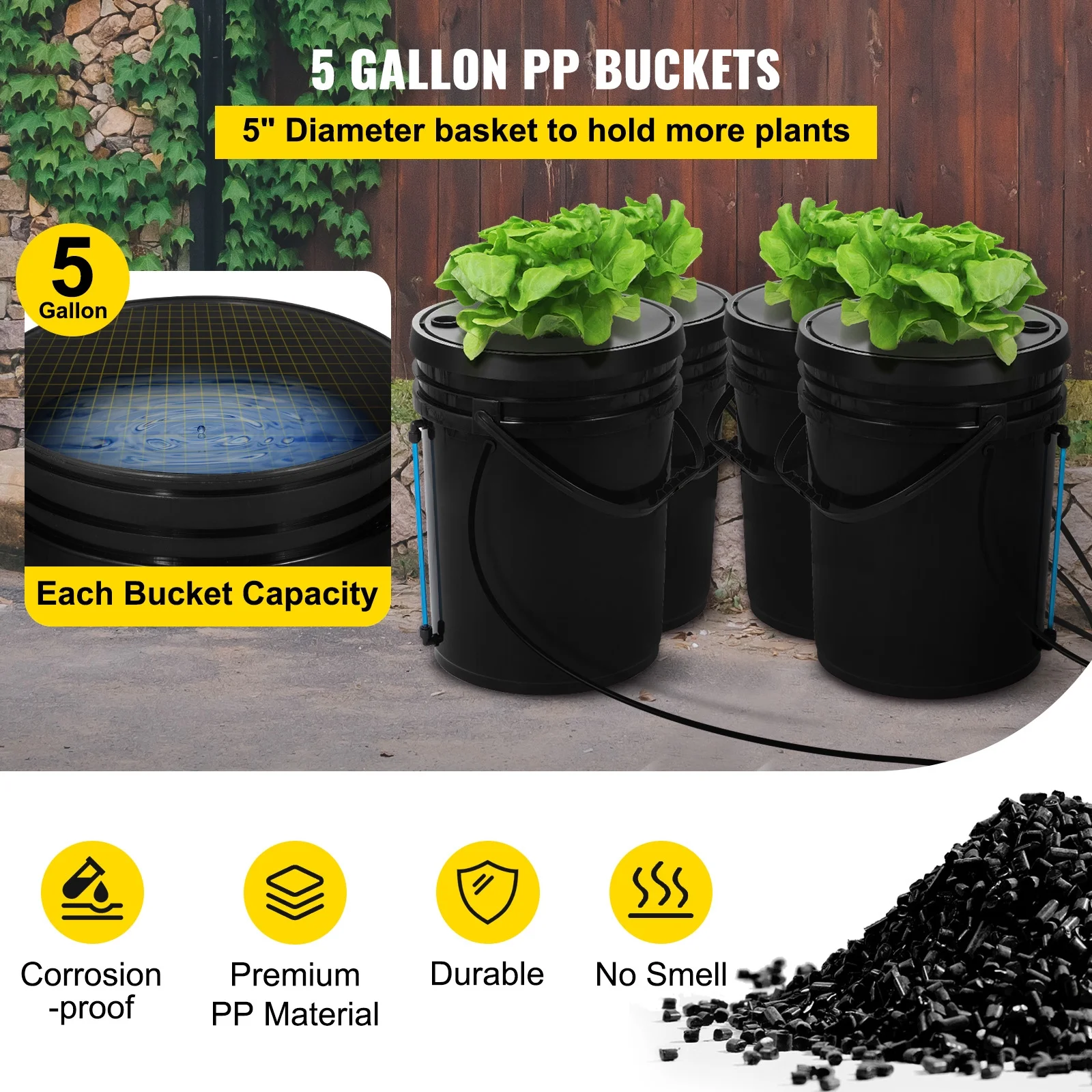- 4PCS PP Buckets: Our DWC hydroponic system comes with 4 plant buckets made of high-quality PP material for long-term use. Each plant bucket has a 5-inch basket that holds 5 gallons, enough to grow multiple plants at once.