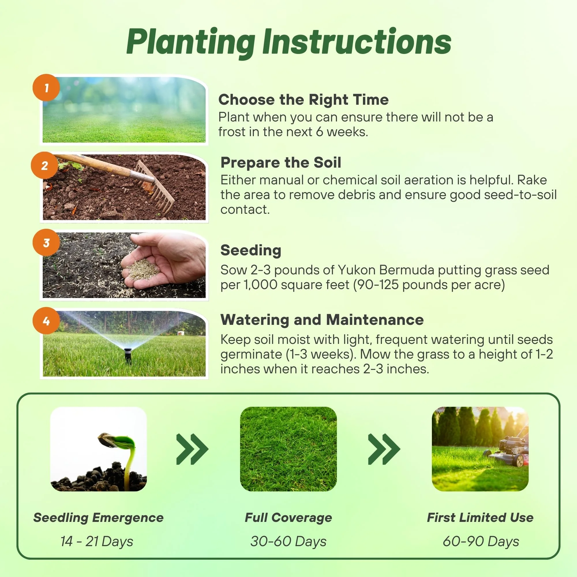 - PREMIUM QUALITY BERMUDA SEED: Our Yukon Bermuda grass seed is ideal for turf managers seeking superior Bermuda grass in any growing and transition zones. It delivers unmatched performance and quality, making it the best choice for lawns and sports fields.