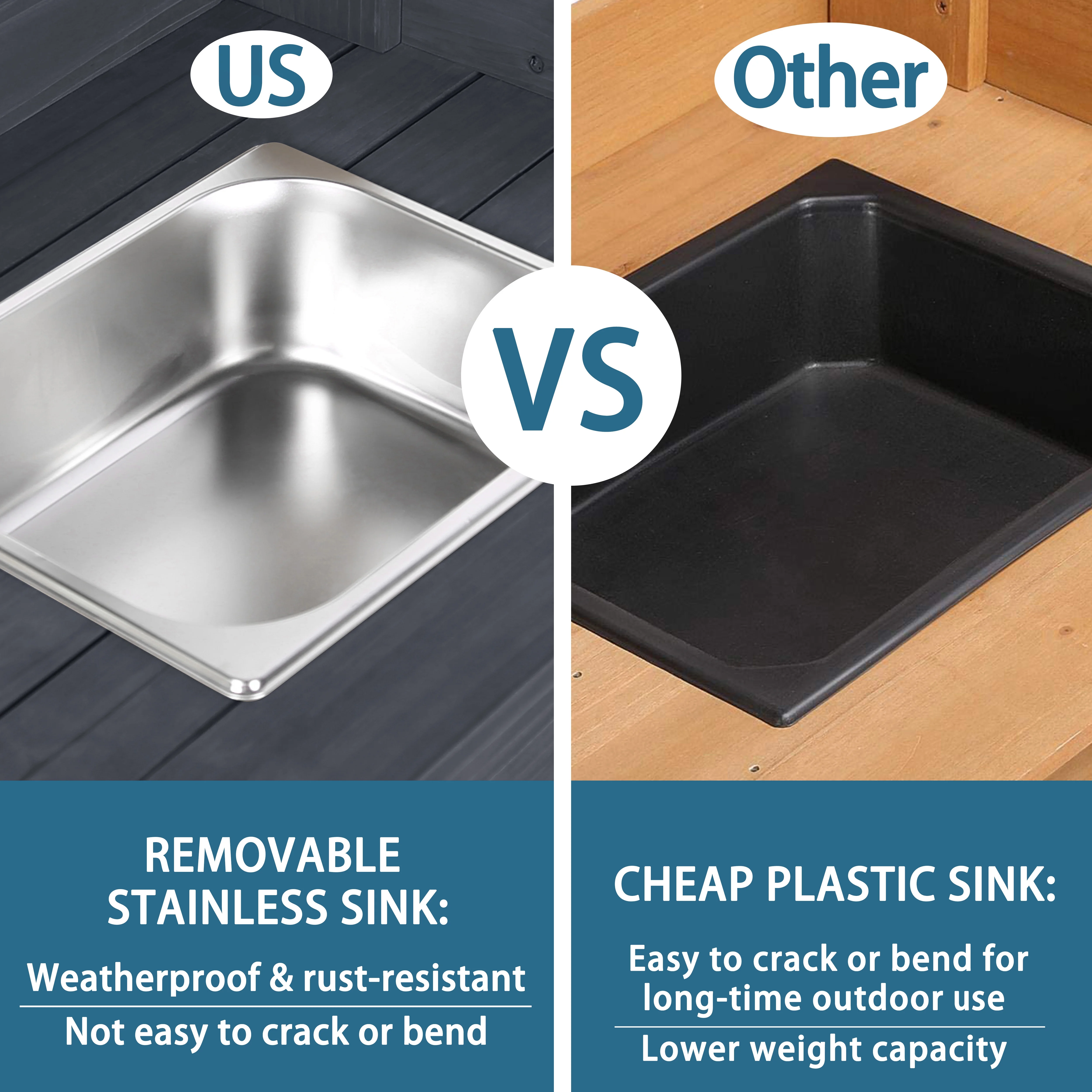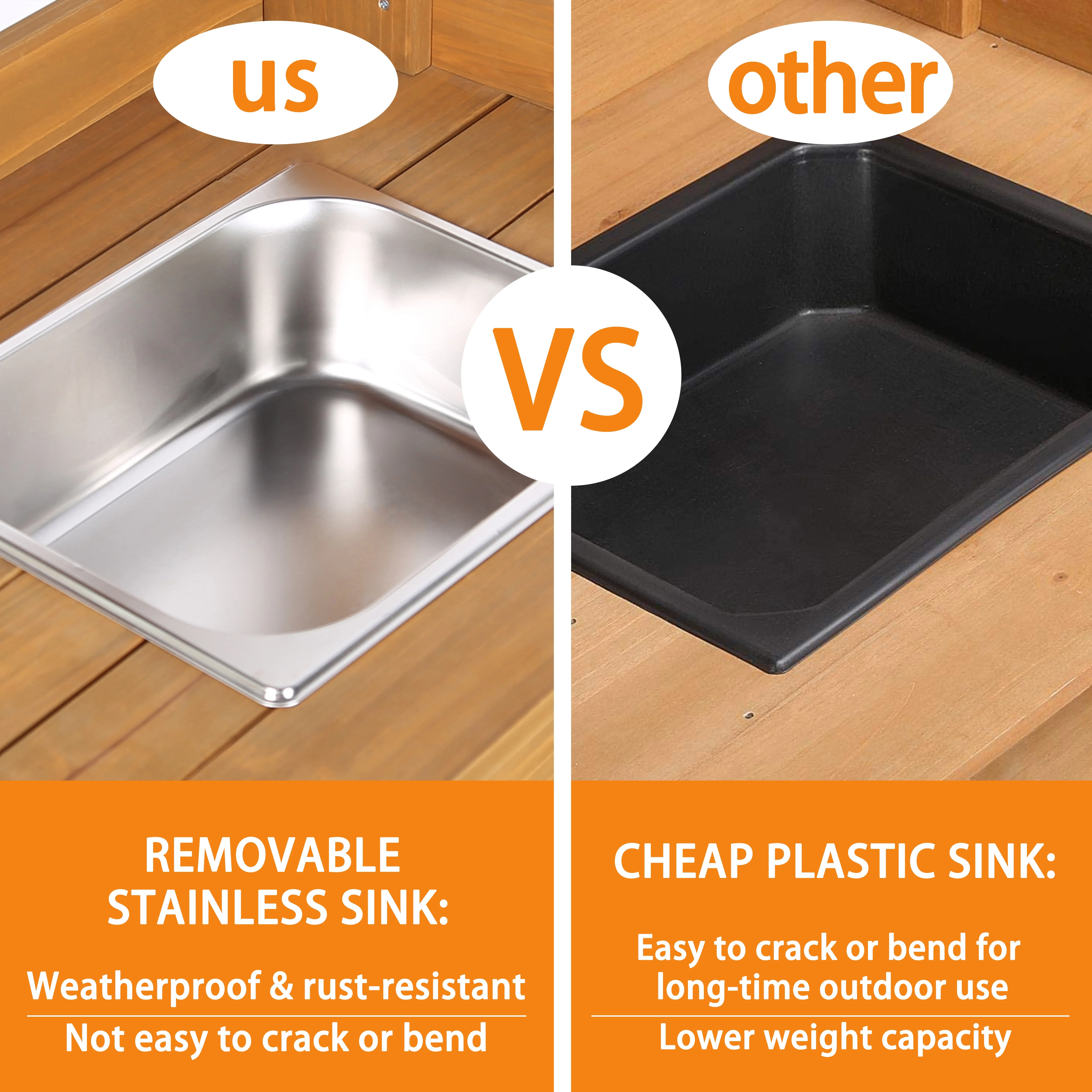 - Storage options include a large tabletop with a removable stainless sink, drawer, and two tiers of shelves.