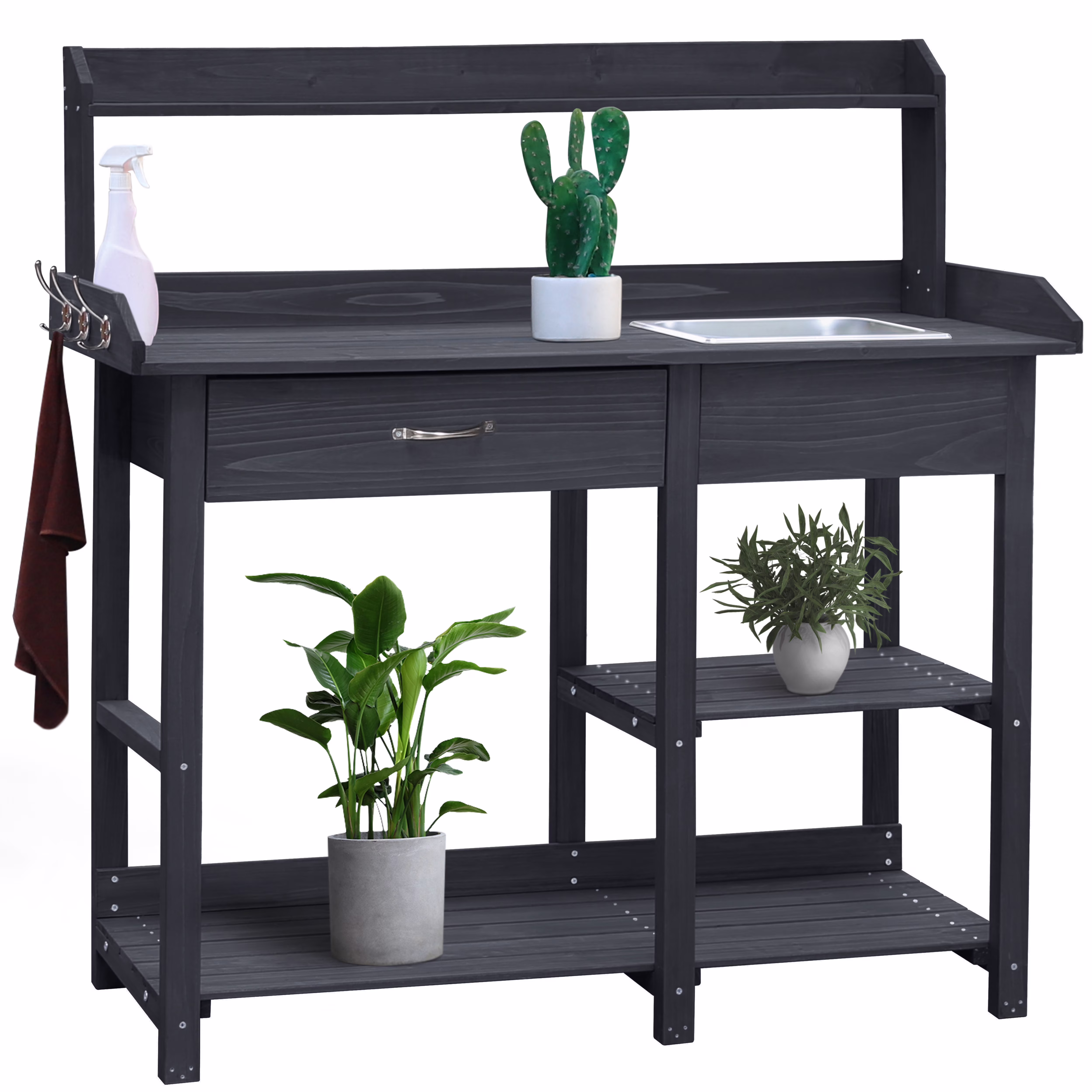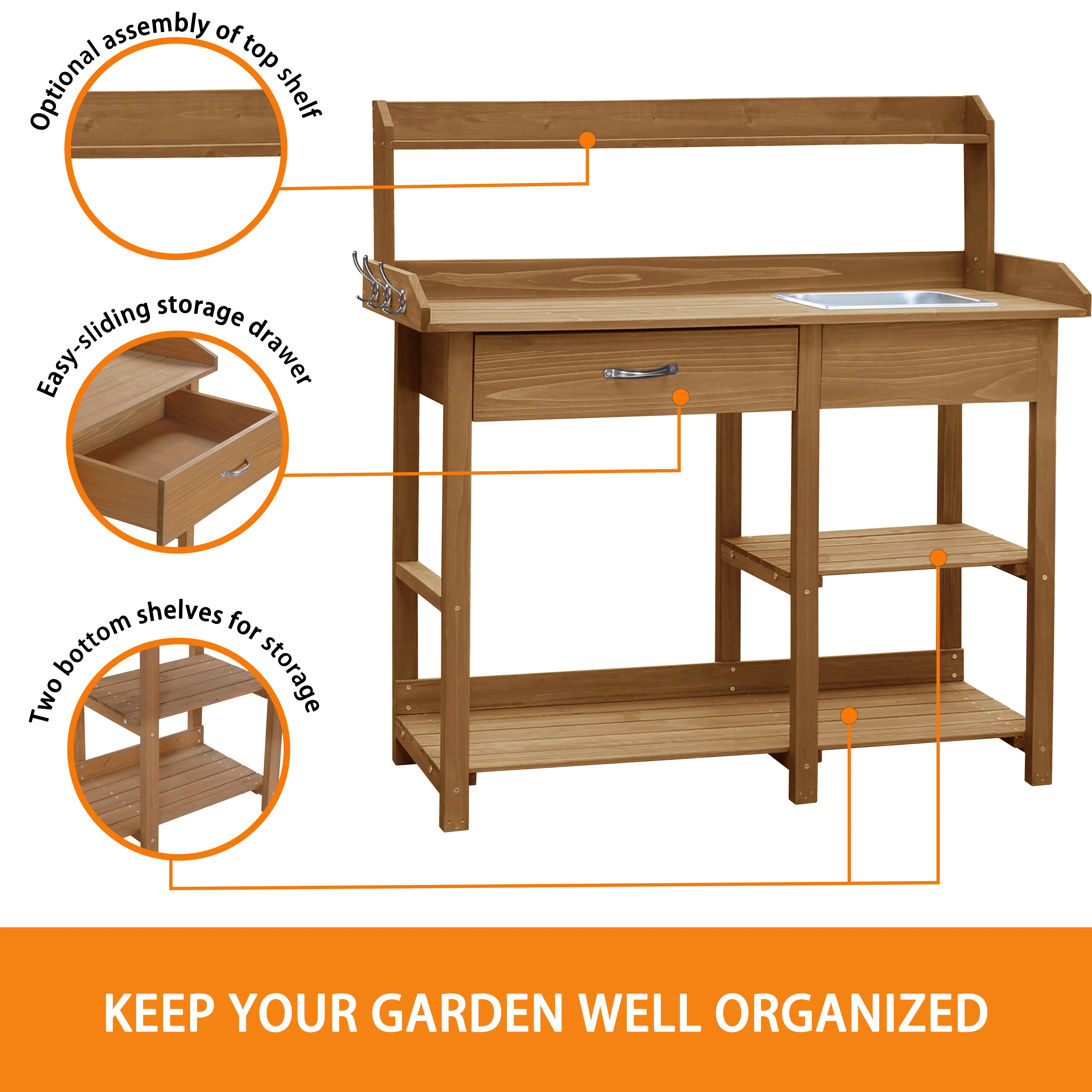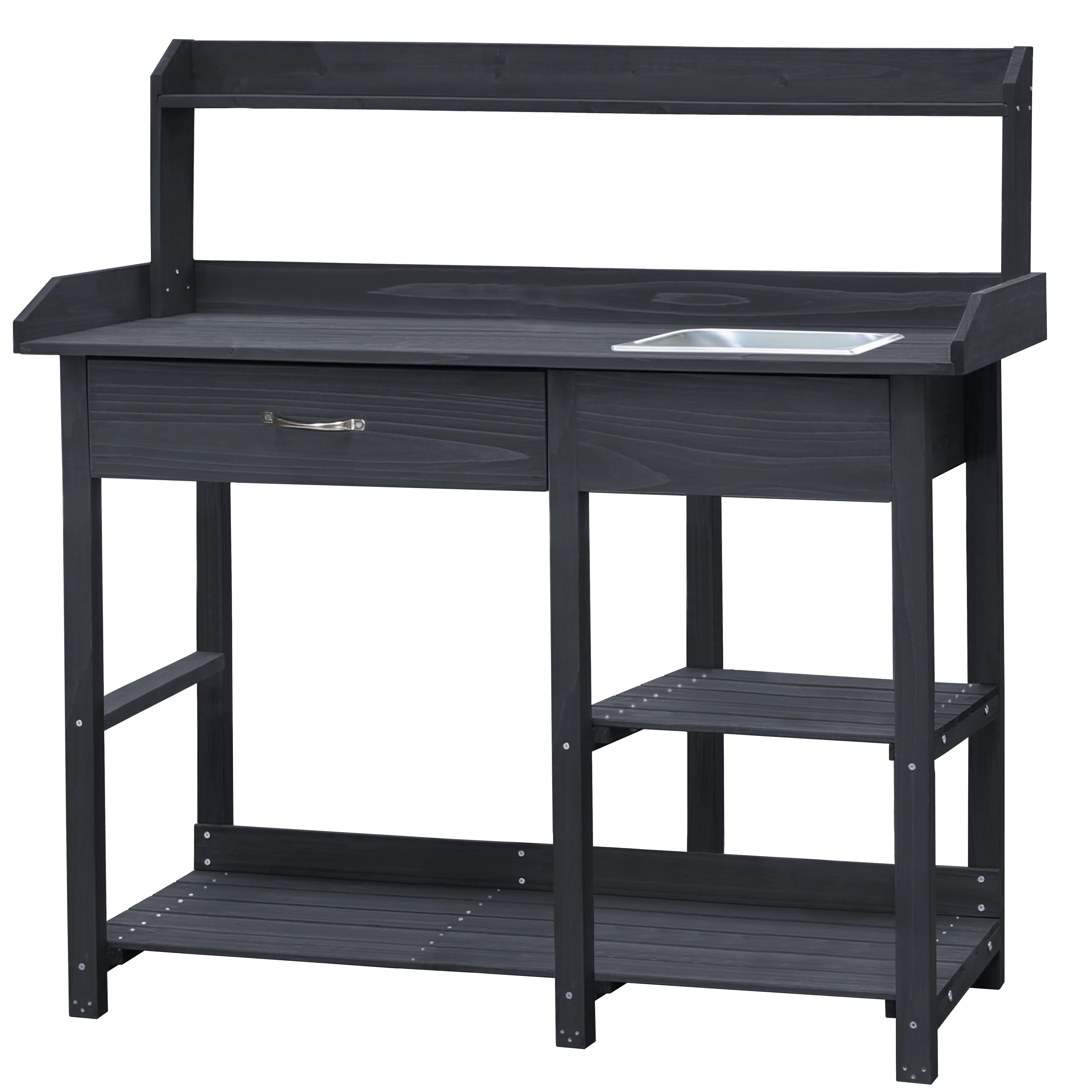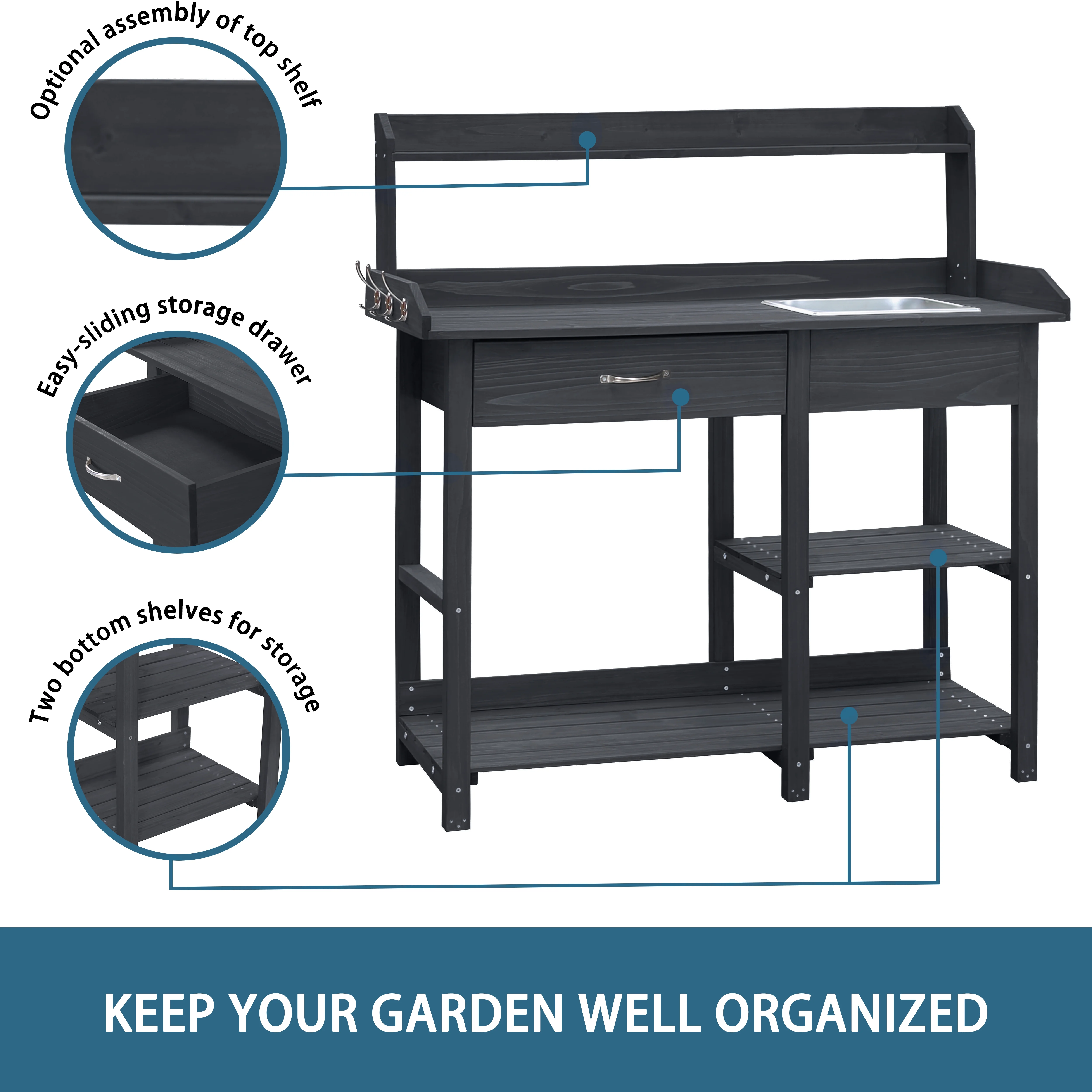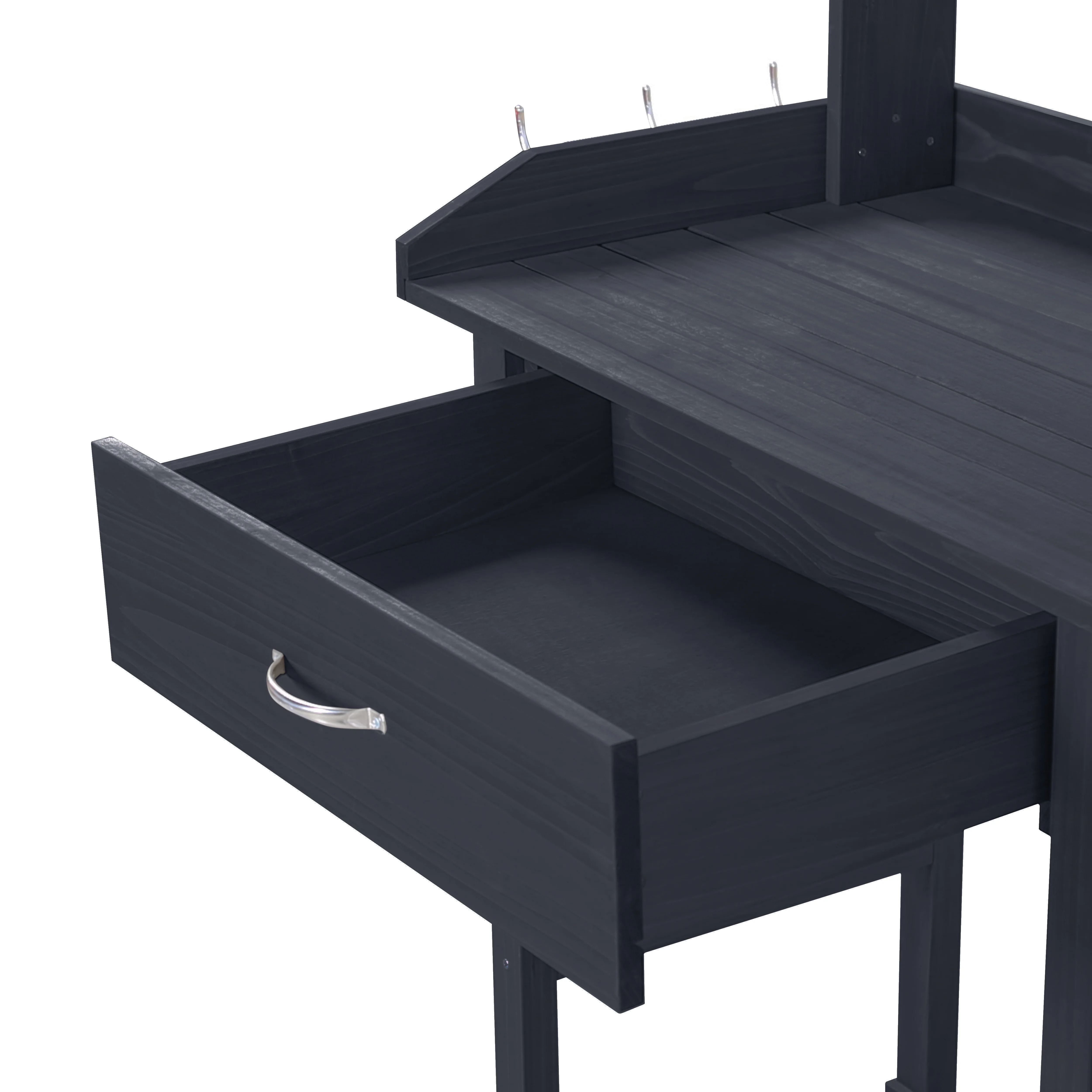 - The overall size of potting bench garden table: 46inW x 15.3inD x 47.9inH.