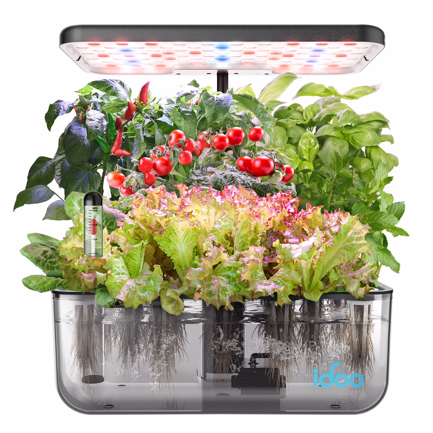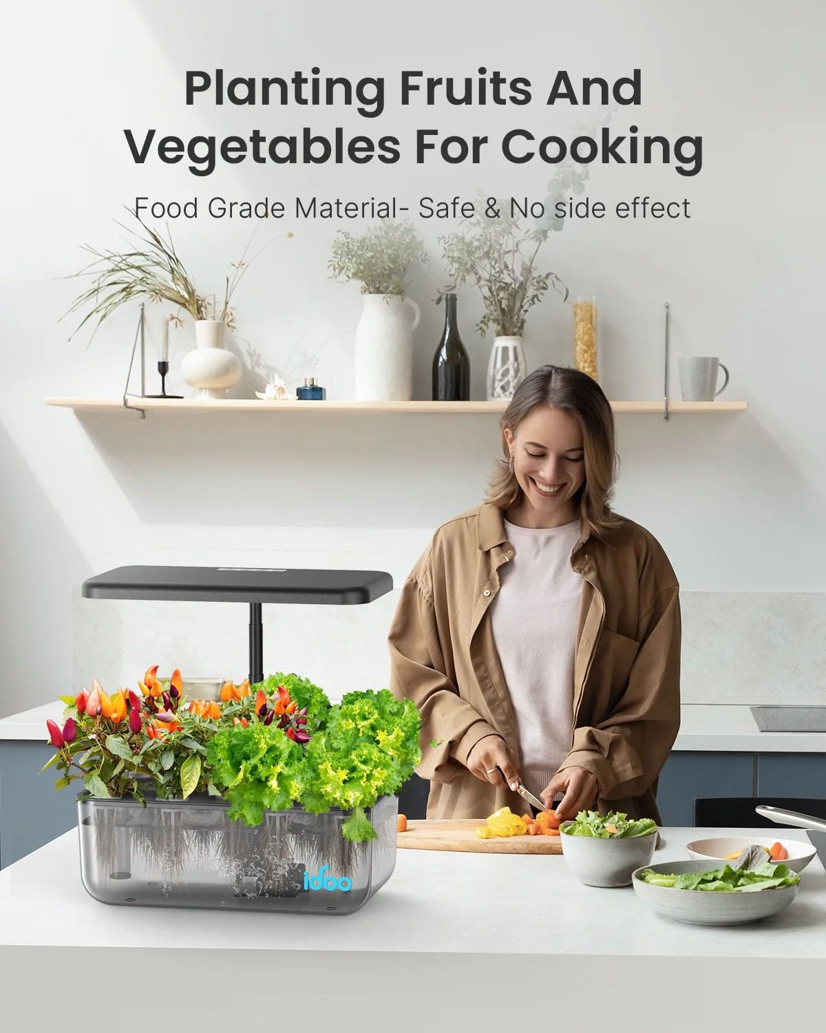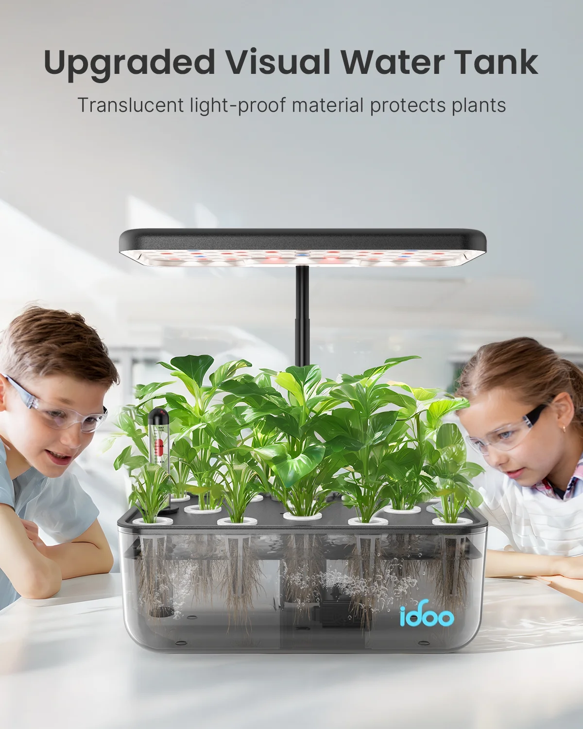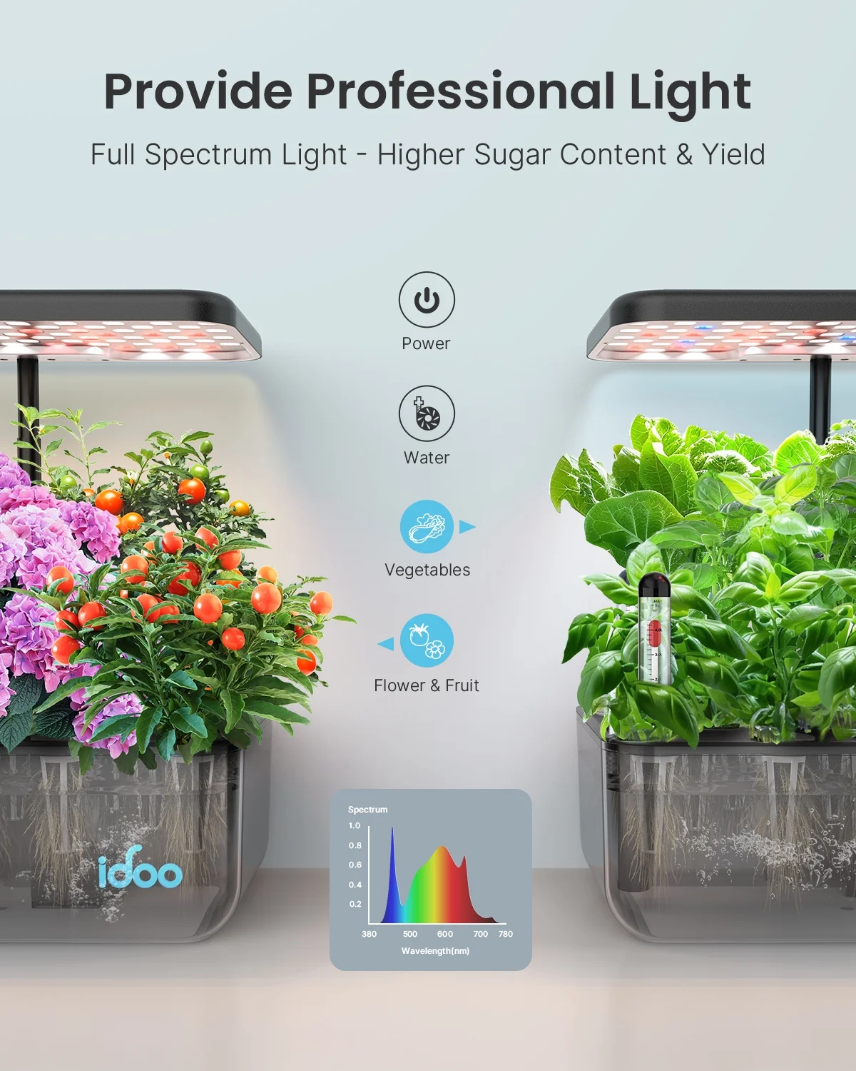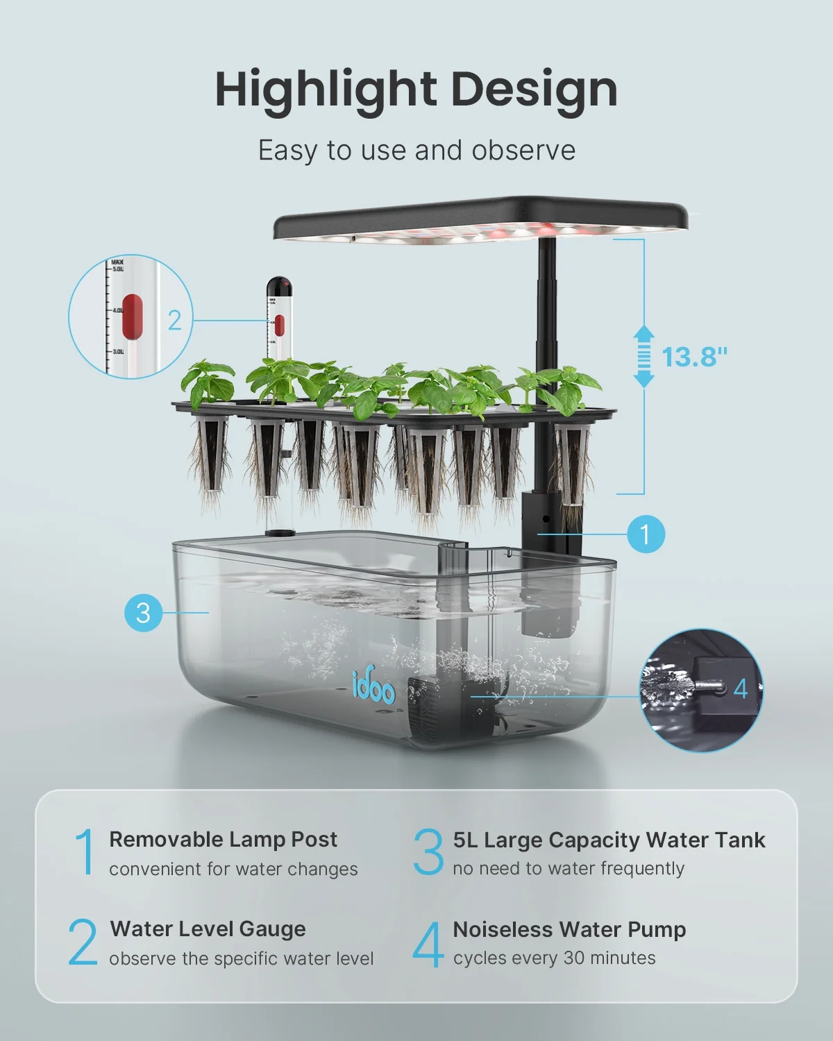 iDOO aims to promote a connection between people and nature by making growing vegetables, flowers, and fruit indoors, while learning through practice, a fun and engaging experience. Hydroponic growing systems don't use soil to grow plants. Instead, they use a nutrient-rich solution and don't need direct sunlight. Its compact design also makes it best for use in small spaces.