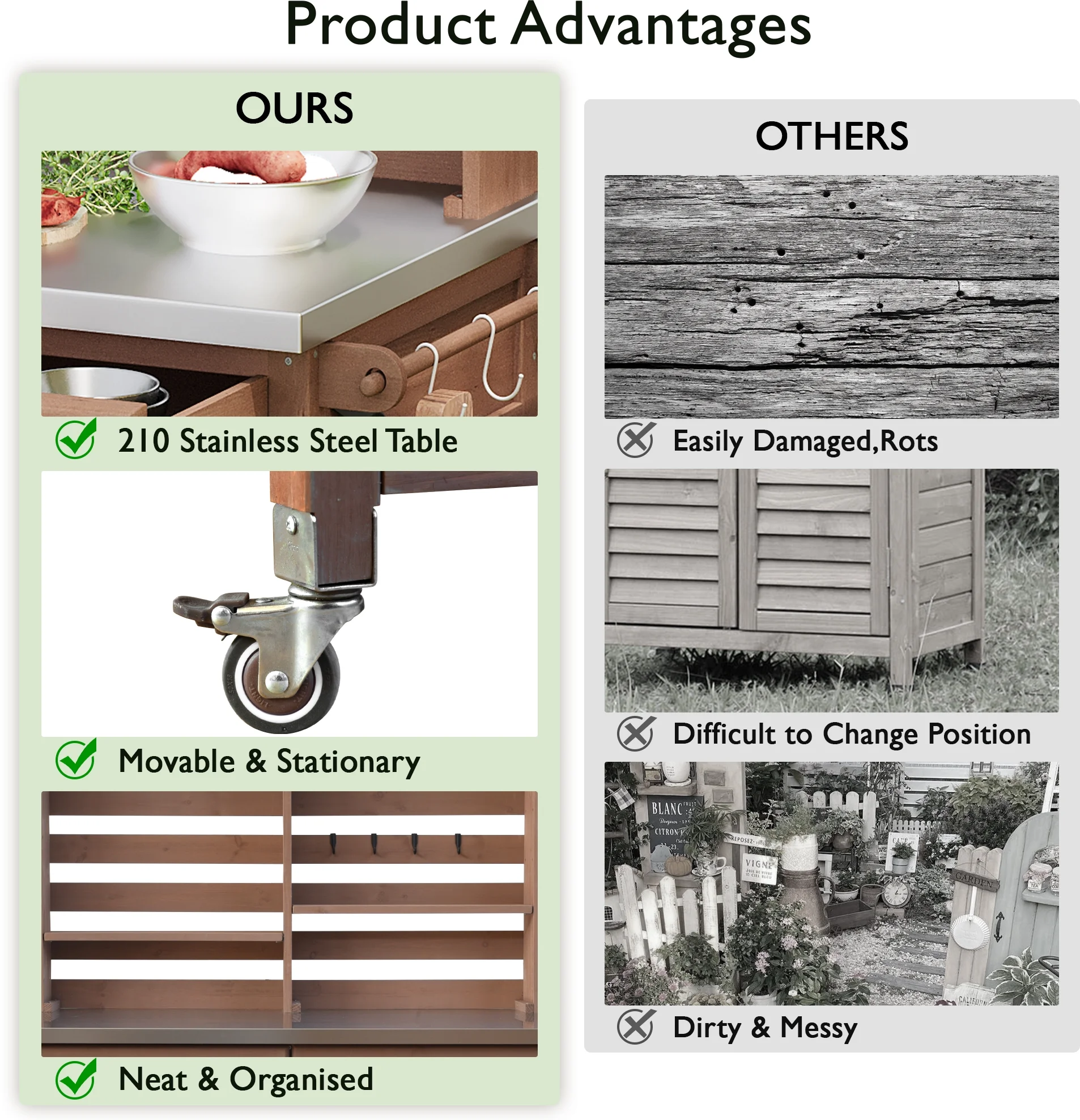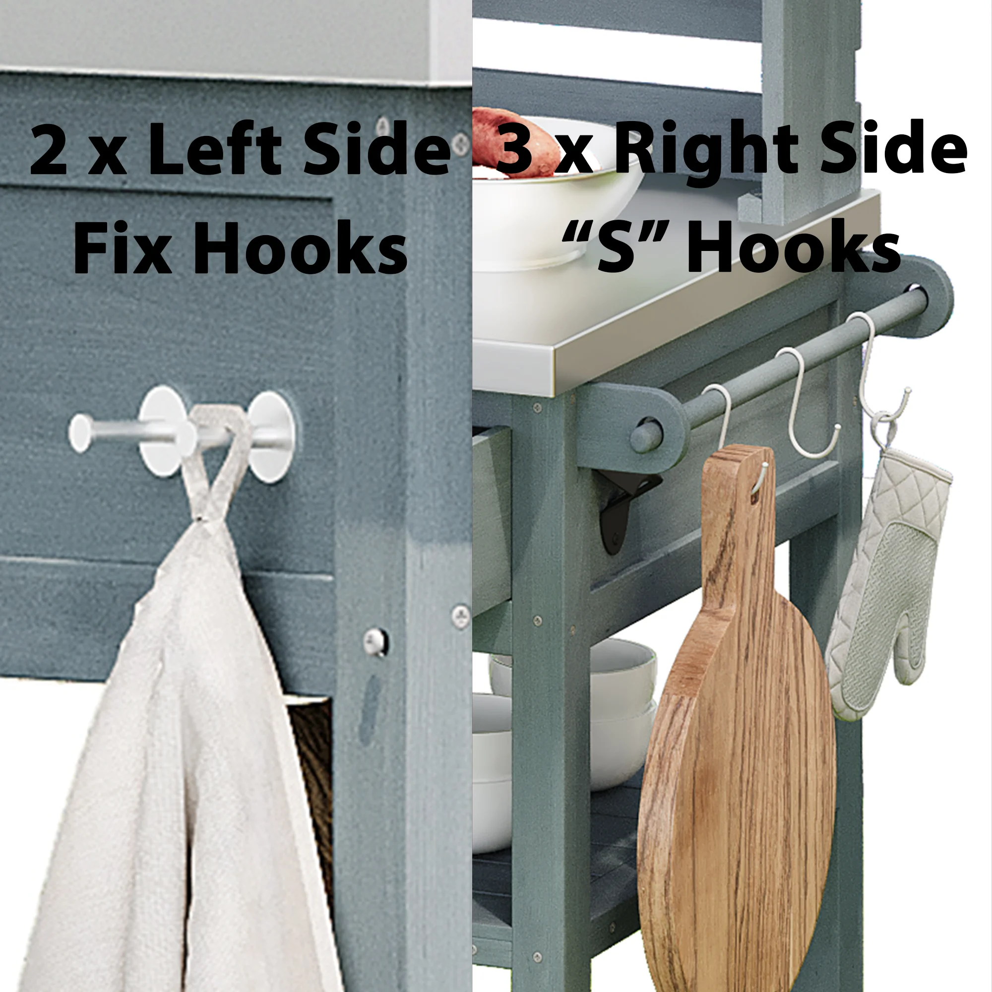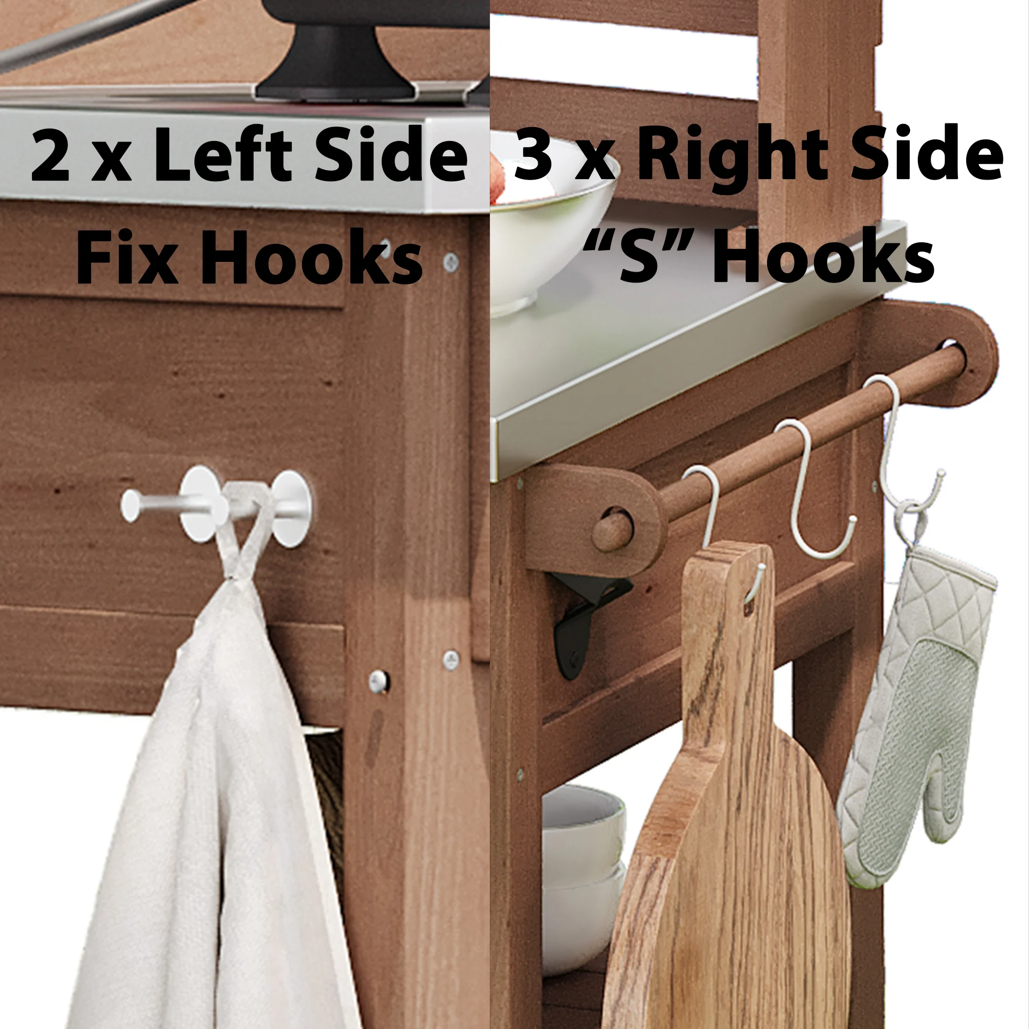 ��Thoughtful Details��This outdoor horticulture bench is equipped with two fixed side hooks and 3 removable ��S�� hooks on the towel rack. Additionally, this outdoor storage hutch features four removable hooks for hanging tools, fire pokers, or bags. The propane tank mounting position is constructed from sturdy steel, allowing you to easily incorporate this potting bench into your outdoor kitchen setup.