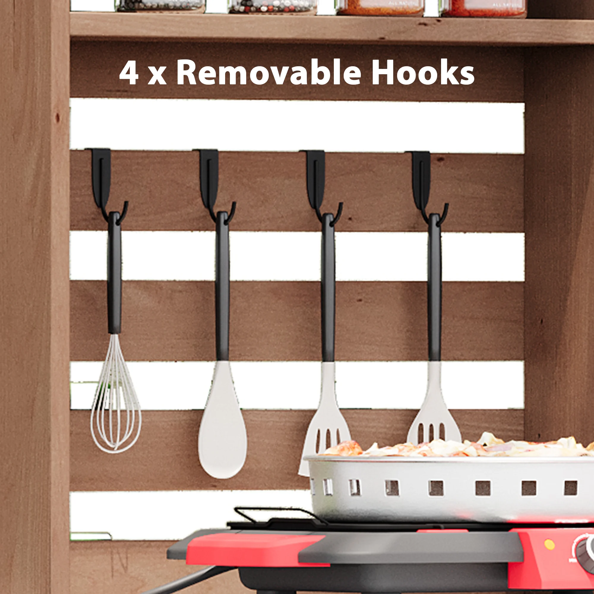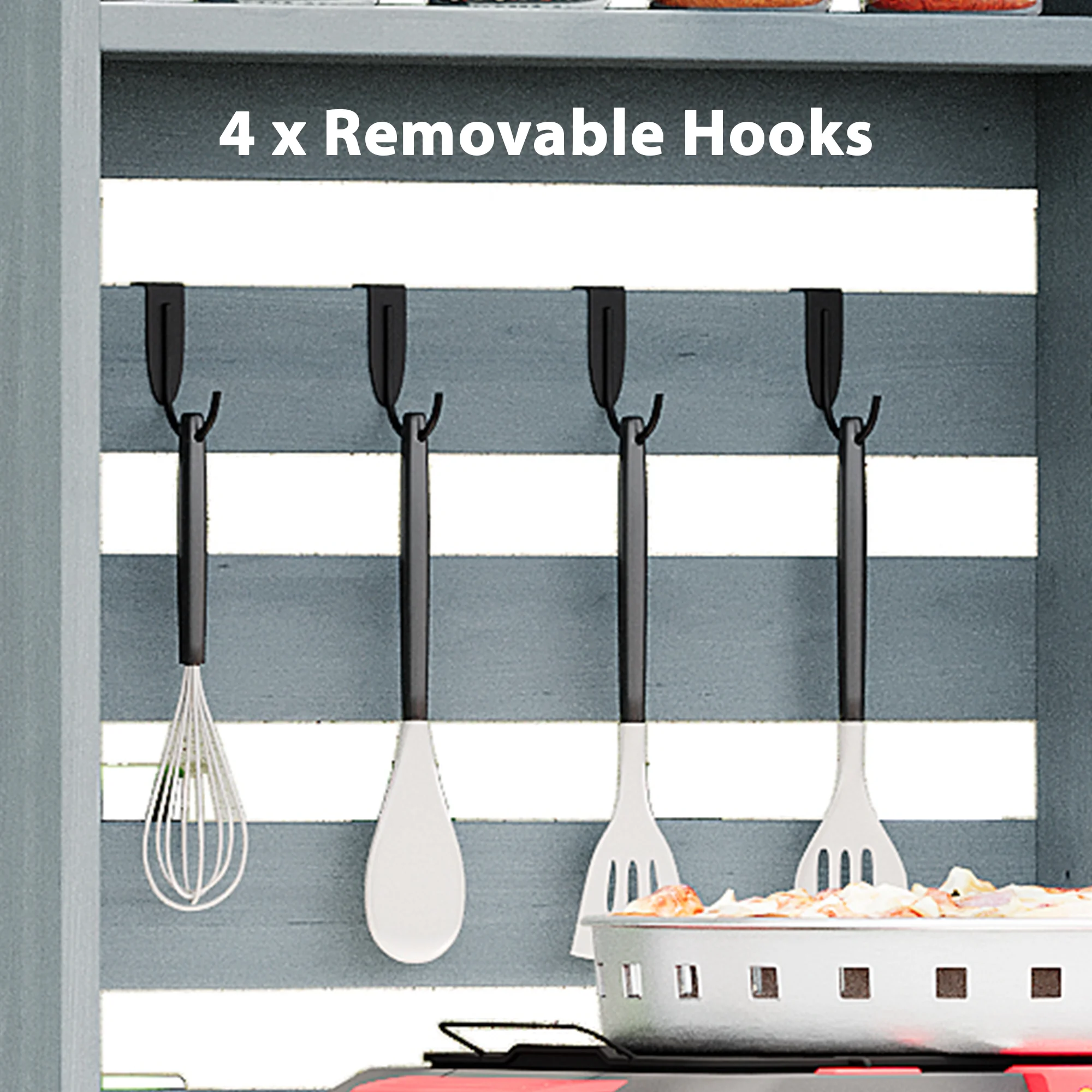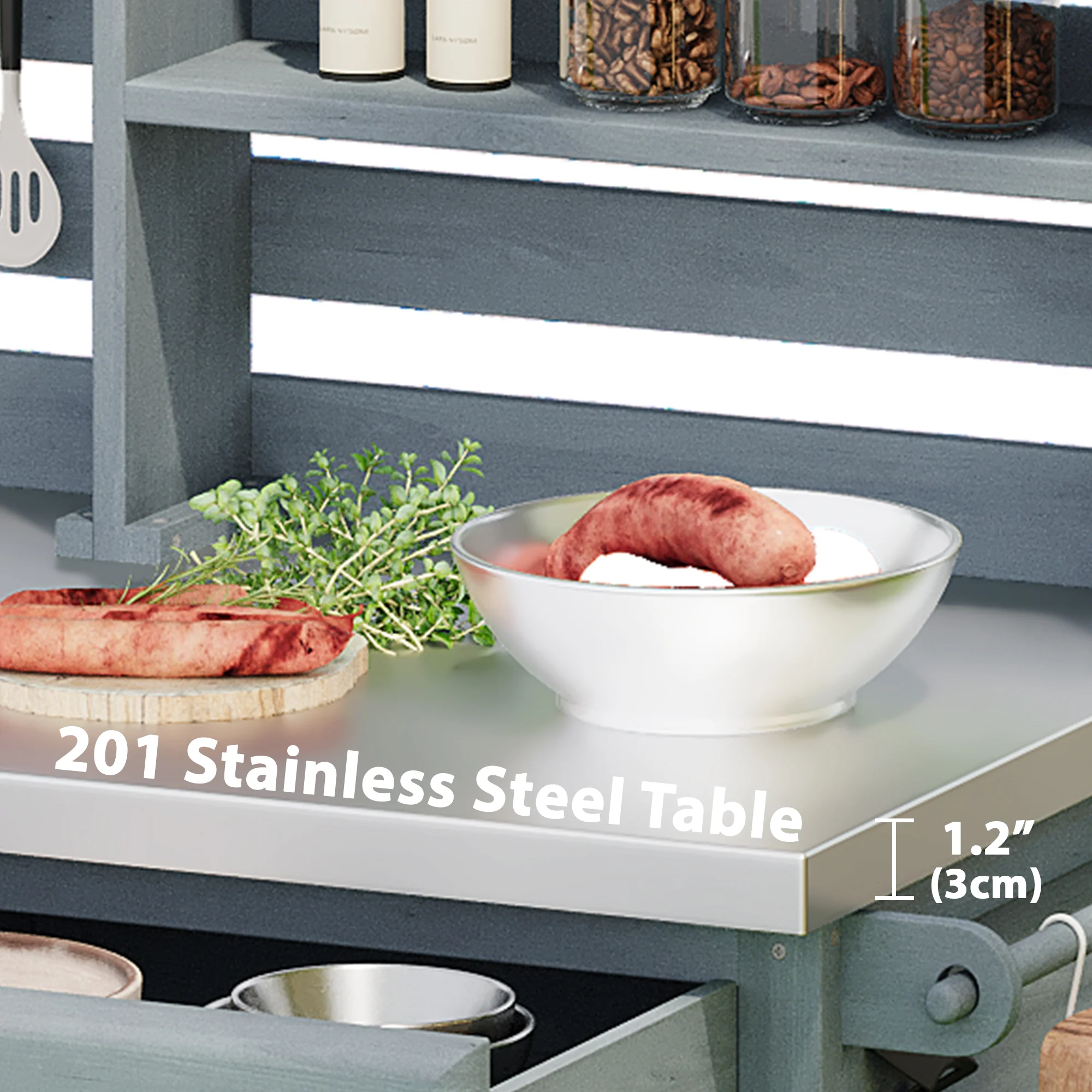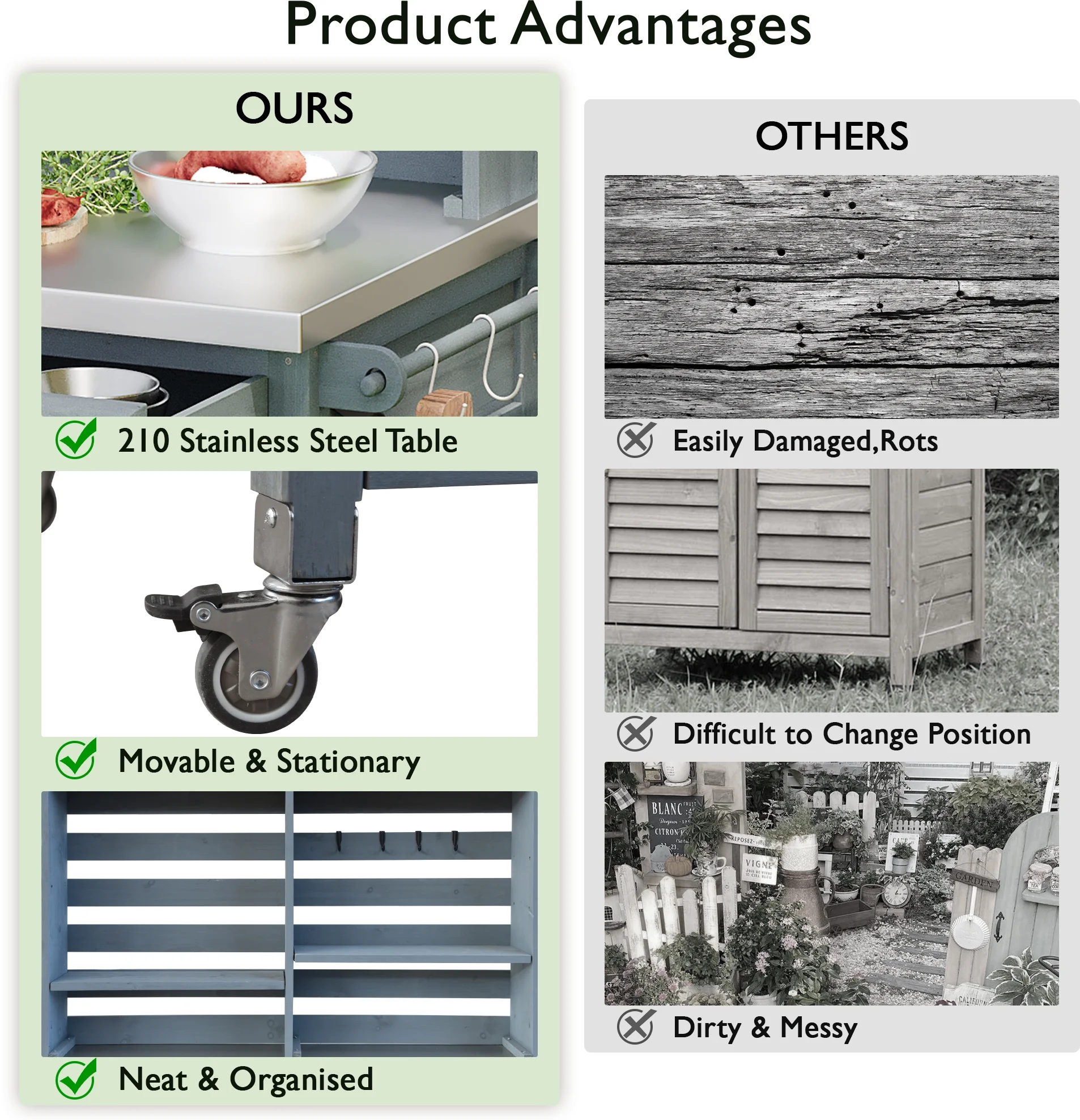 ��Thoughtful Details��This outdoor horticulture bench is equipped with two fixed side hooks and 3 removable ��S�� hooks on the towel rack. Additionally, this outdoor storage hutch features four removable hooks for hanging tools, fire pokers, or bags. The propane tank mounting position is constructed from sturdy steel, allowing you to easily incorporate this potting bench into your outdoor kitchen setup.