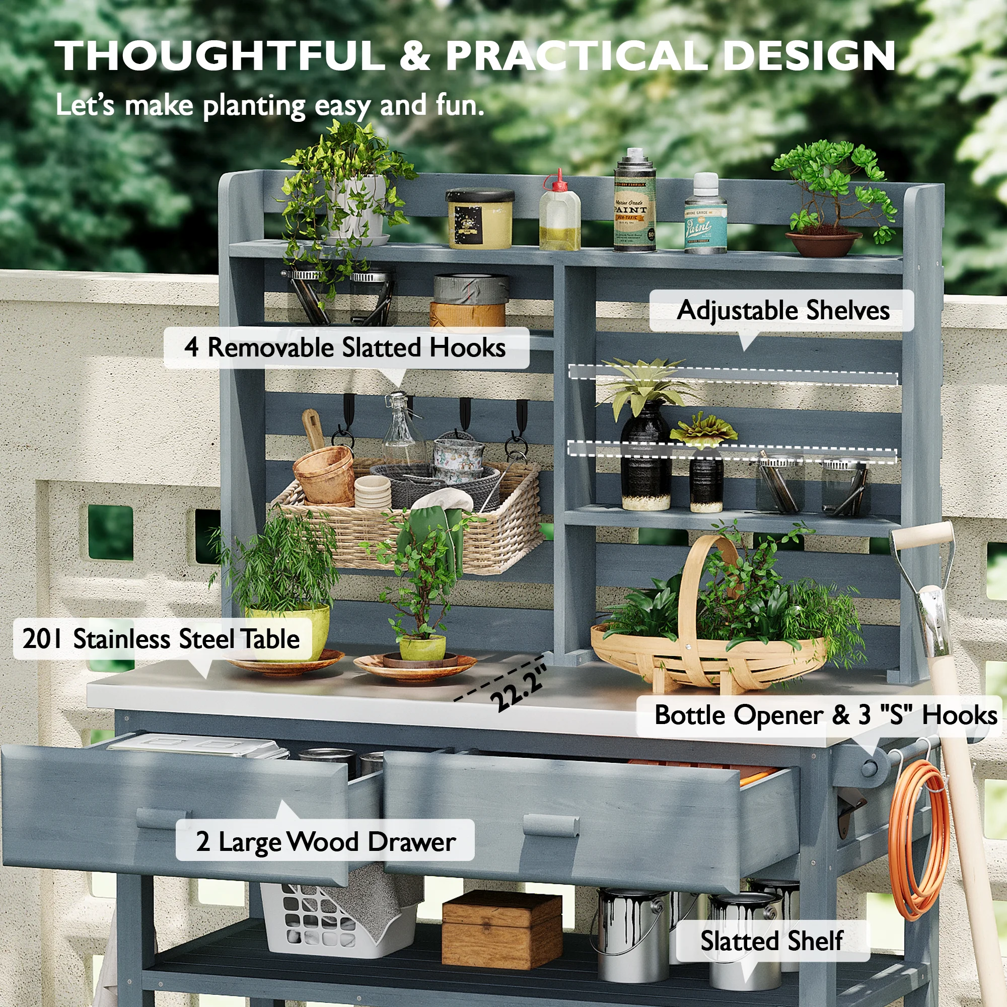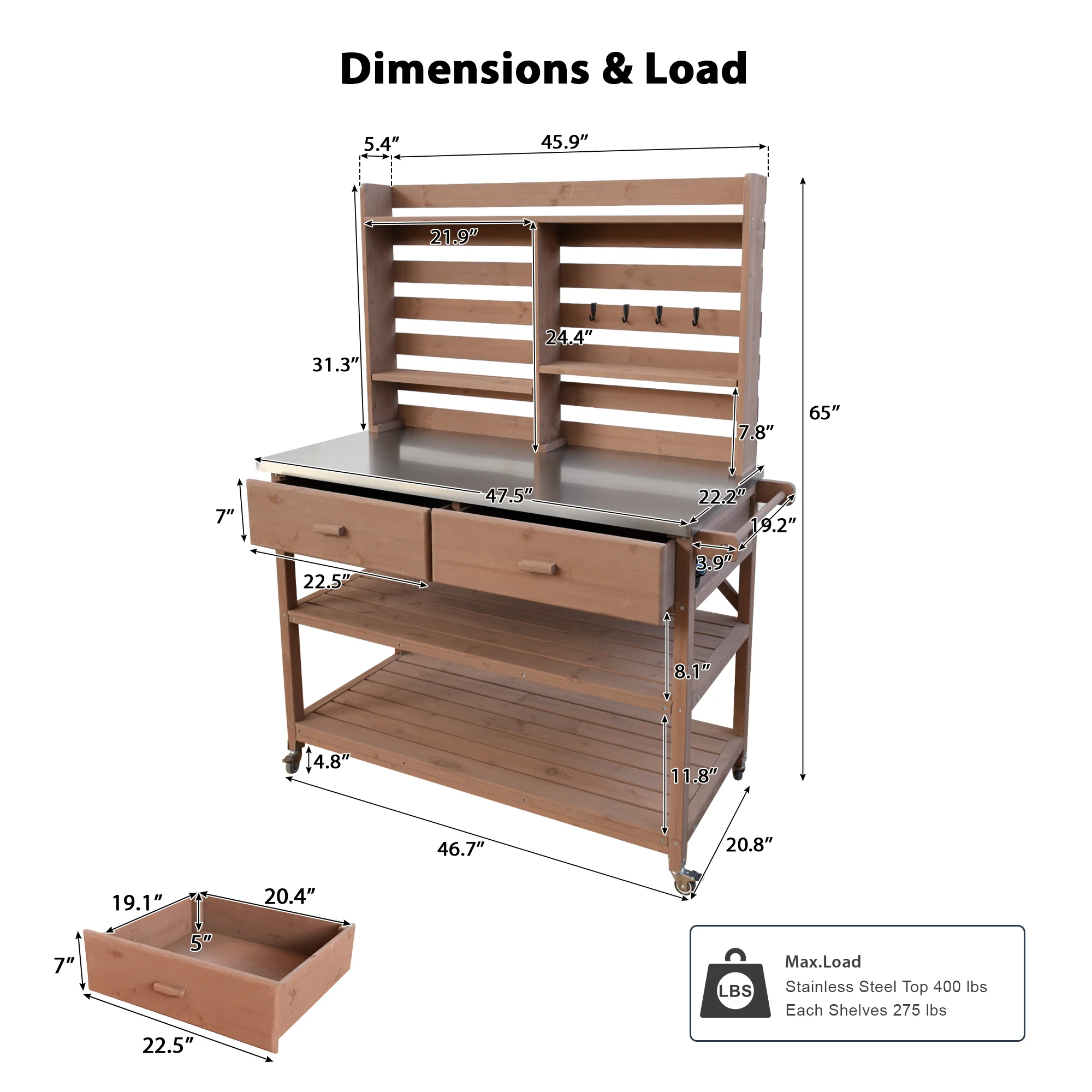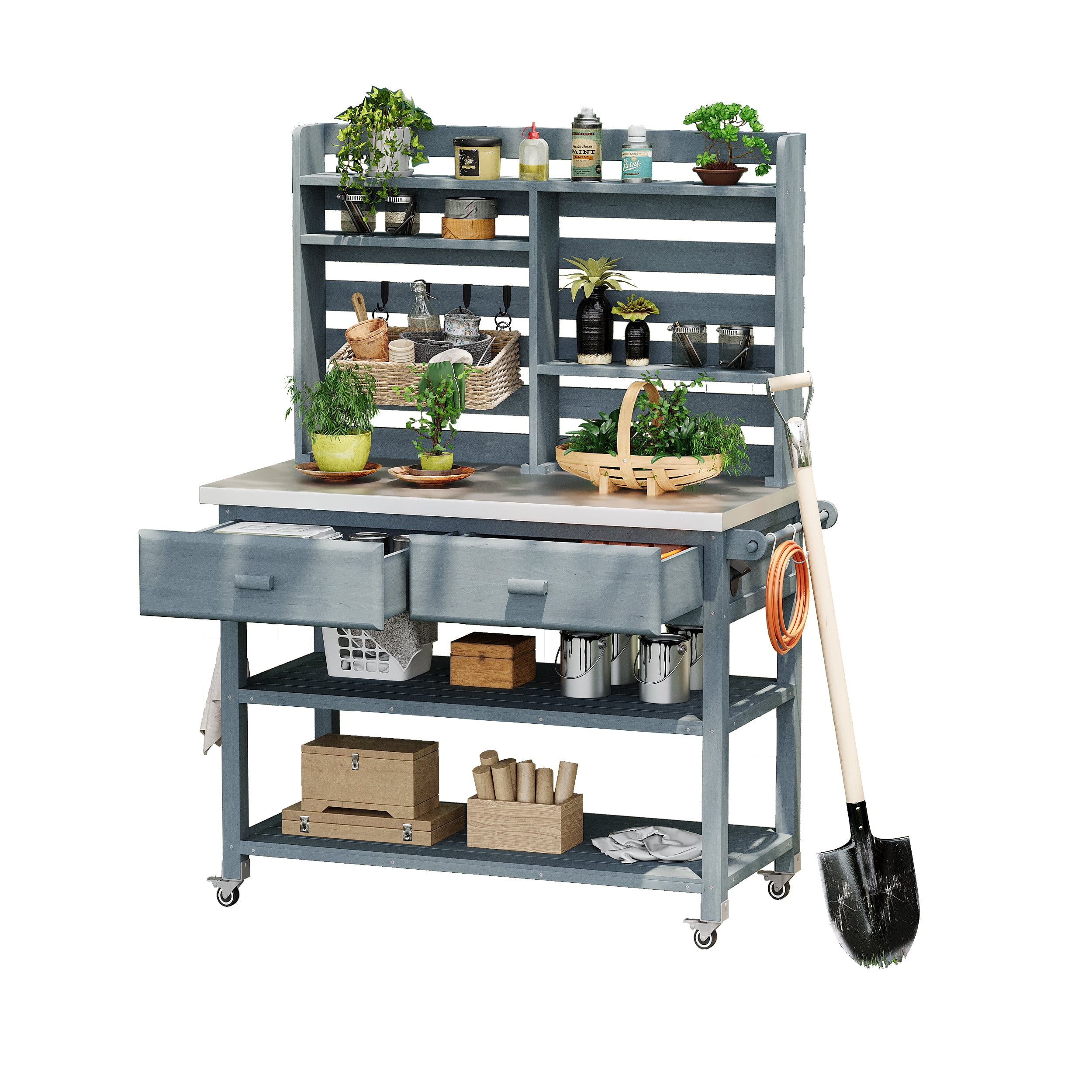 EUROCO 500 lb 64.9"h Solid Fir Wood Potting Bench with Stainless Top & 4 Wheels, Large Modular Garden Work Table with 4 Hooks, Bottle Opener, 4 Shelves and 2 Drawers, Outdoor Potting Table for Porch