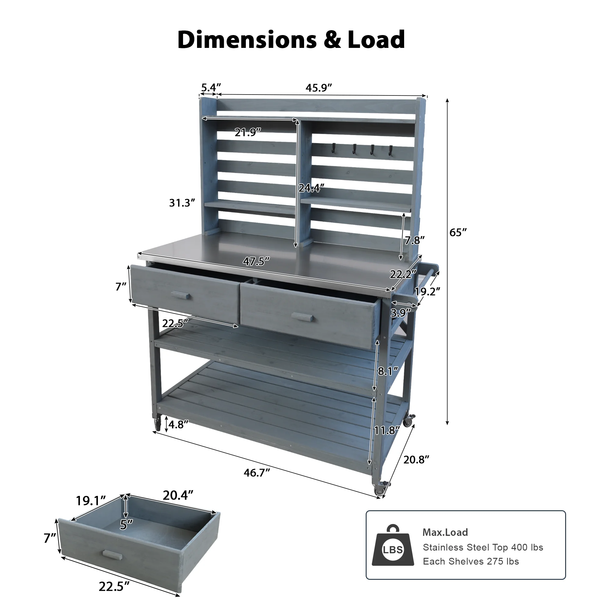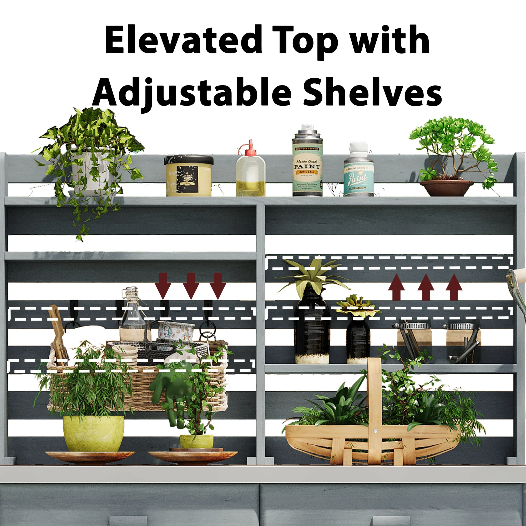 ��Ample Storage Space��This potting bench as one of the largest on the market, measuring an 64.9'' in height and featuring a large table of 47.5'' x 22.2''. Designed for functionality, it includes two large drawers with handles, providing storage for cutlery, tools, and essentials. The two large slatted shelves below offer options for large number of plants and fertilizers. The elevated top rack is perfect for displaying your favorite plants or flowers while providing storage for gardening tools.