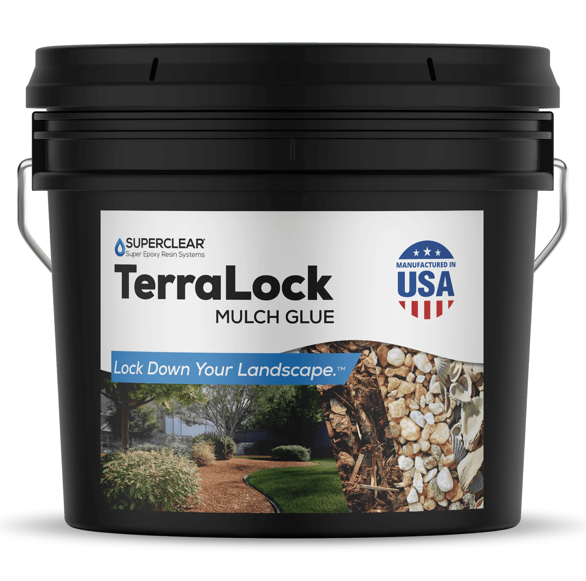 Superclear Terralock Mulch Glue for Landscaping, 5 Gallon Rock Glue. Easy Spray, Easy Hold. Perfect for Mulch, Pea Gravel Large & Small, Rock, Straw and Stone, Pega Para Piedras de Jardin