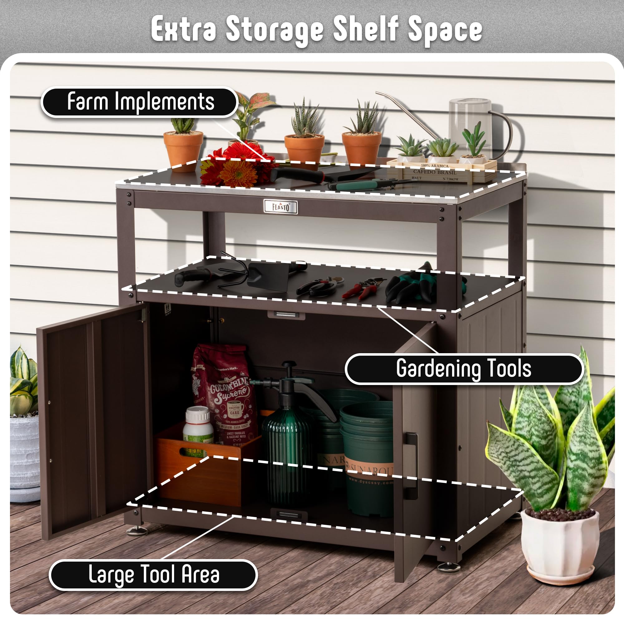 - Ample Storage: The 32" x 18" tabletop provides ample space for planting or daily tasks. This workbench with cabinets features adjustable interior shelves, providing approximately 50 gallons of versatile storage space for easily organizing and storing a variety of tools.