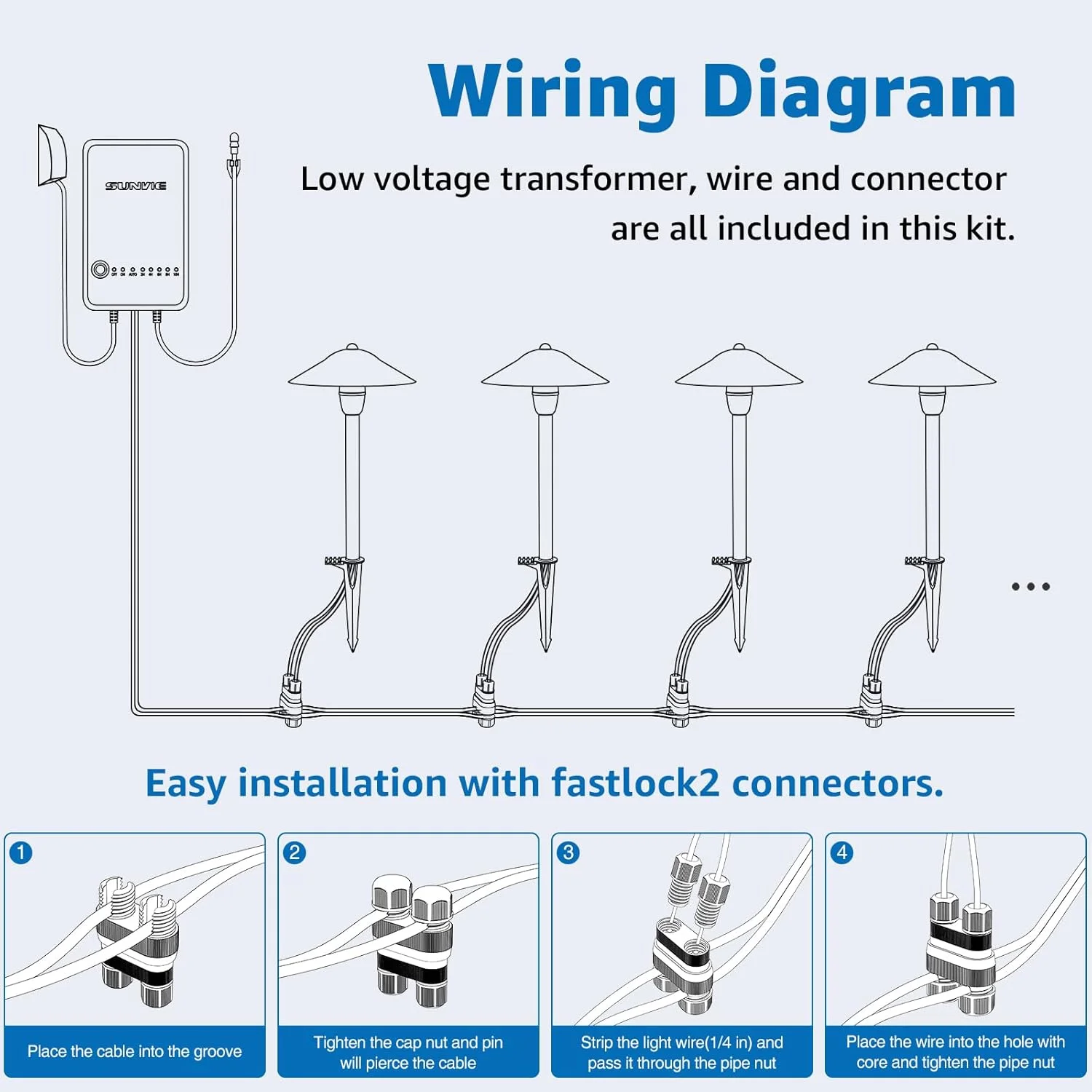 - ��Flexible Lighting Layout��Unlike other kits with fixed length male and female plug cords, with our kit you can place each light anywhere along the 100 feet of low voltage wire. And no need to worry about wiring, the included SUNVIE patented fastlock2 connectors make it a breeze.
