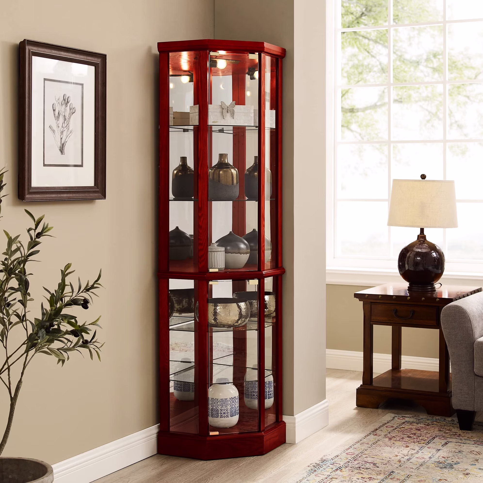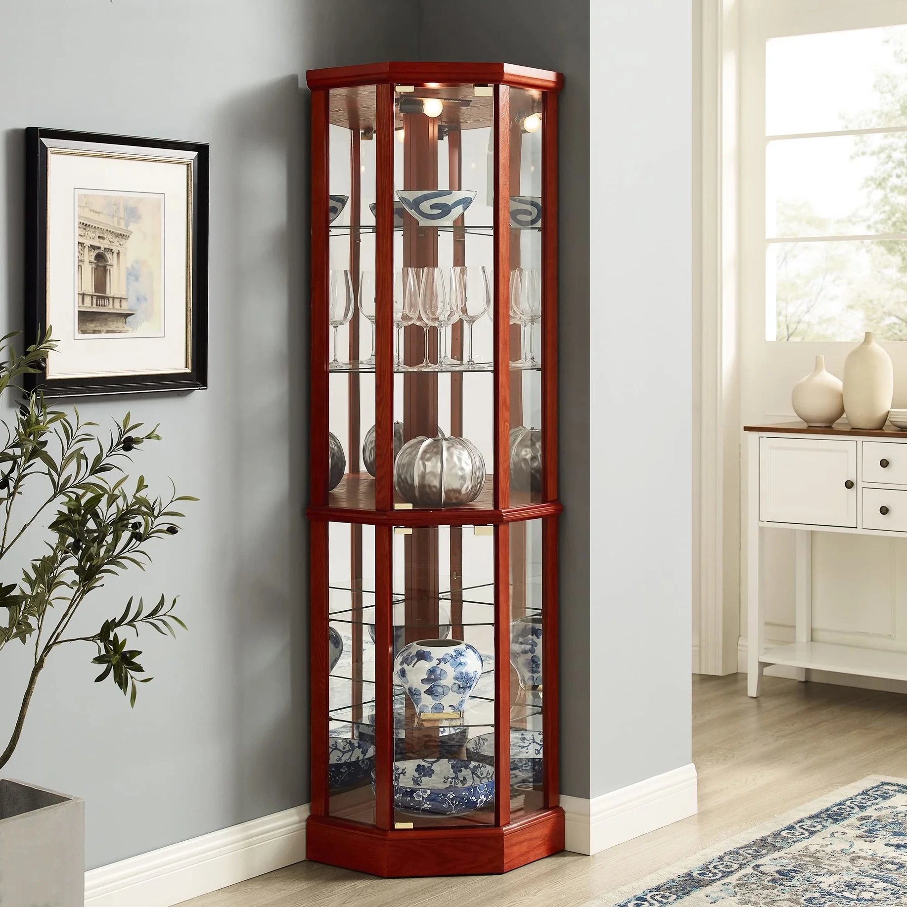- transitional style curio cabinet is not only stylish but also functional. it comes with 4 adjustable tempered glass shelves and 2 fixedplace wood shelves, allowing you to customize storage according to your needs. mirrored back panel and interior create a beautiful display for your antiques, china dishes, and family photos. it is easy to assemble with all necessary hardware included. : transitional style cabinet, customizable storage, mirrored back and , easy assembly 6 shelf lighted corner curio cabinet is a functional and fashionable piece of furniture. it adds a touch of elegance to any room. : functional fashion cabinet, elegant touch, room enhancement.