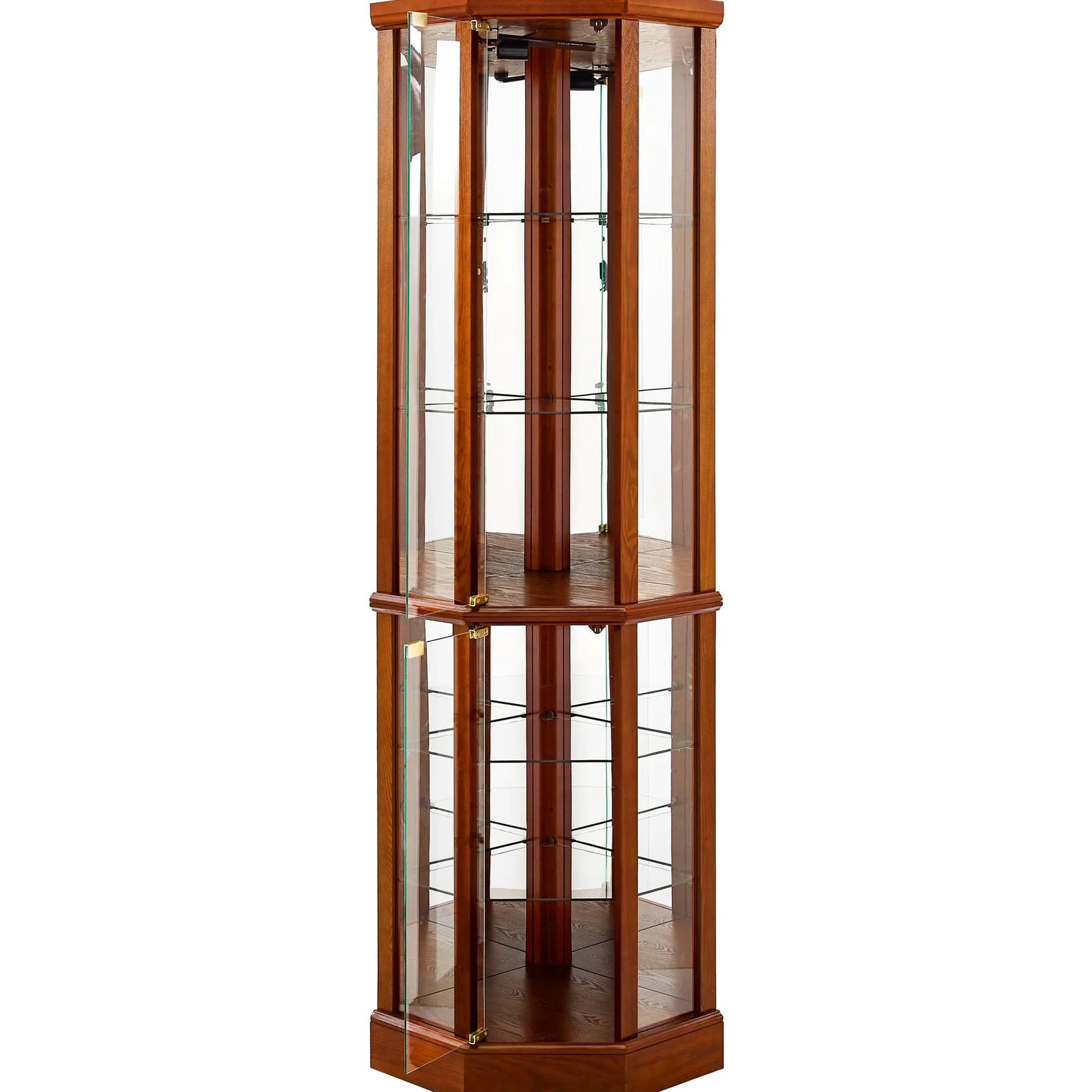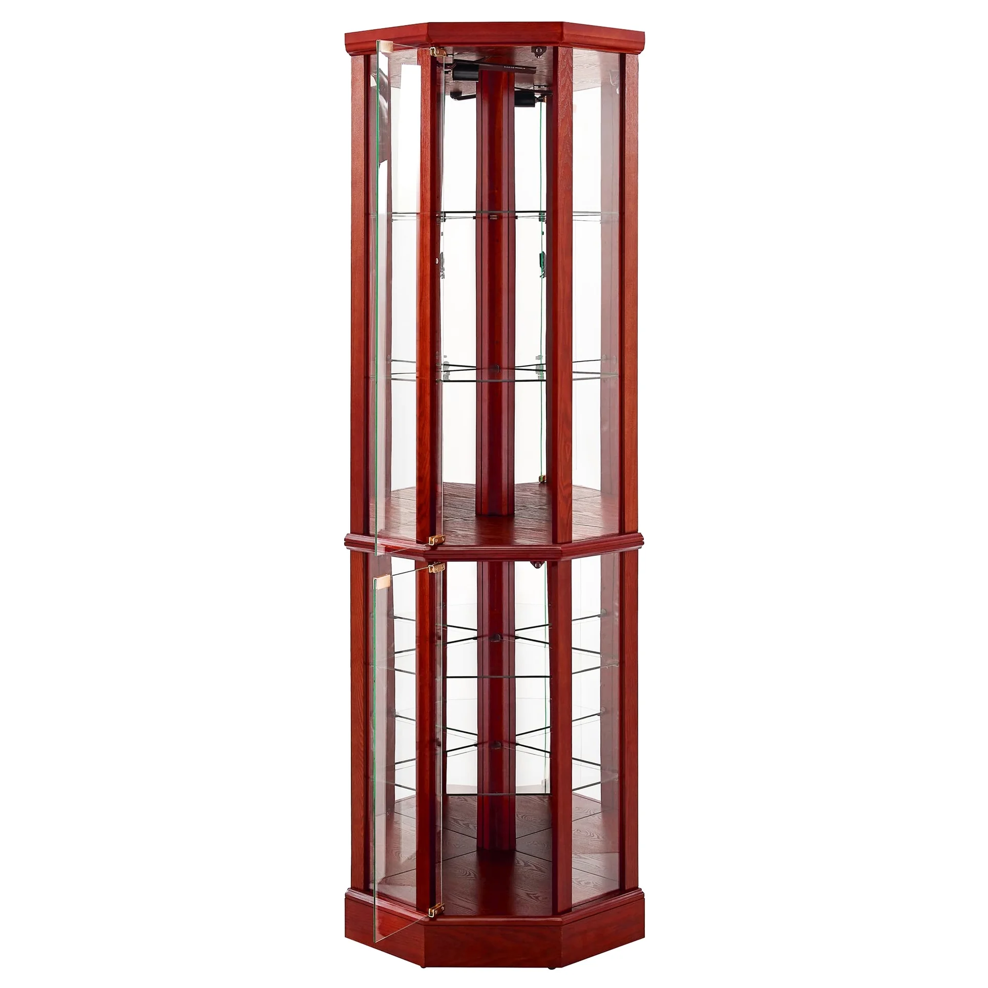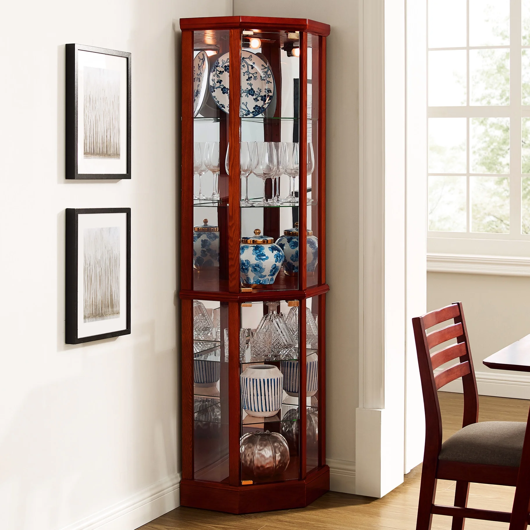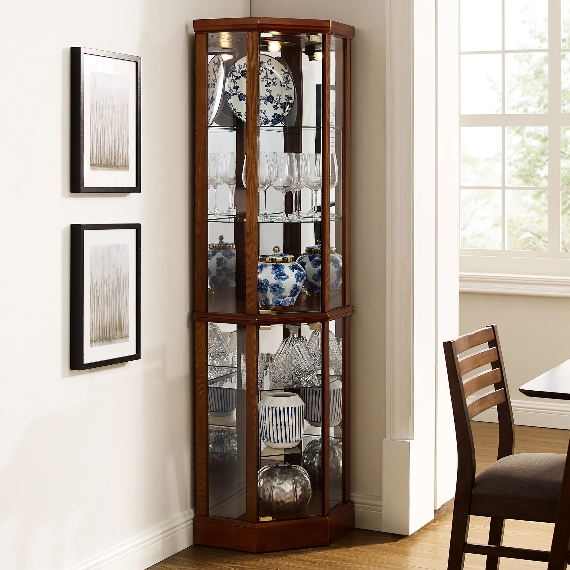 this 6 shelf lighted corner curio cabinet is a work of art in itself. walnut finish gives it a rich and sophisticated appearance. mirrored back panel creates a dramatic effect, enhancing beauty of your displayed items. 4 adjustable tempered glass shelves offer endless possibilities for customization, allowing you to create a unique display that reflects your personality. transitional style of cabinet makes it a versatile piece that can fit into any decor scheme. its space design is perfect for smaller spaces, while still providing ample storage. two hinged doors make it easy to access and organize your treasures. tipping wall anchor provides added security, and magnetic hardware on doors ensures a tight seal. when interior is turned on, in combination with mirrored back panel, your antiques, china dishes, and family photos are transformed into a breathtaking display that will be envy of your guests. built to last, this curio cabinet is a testament to quality and style.