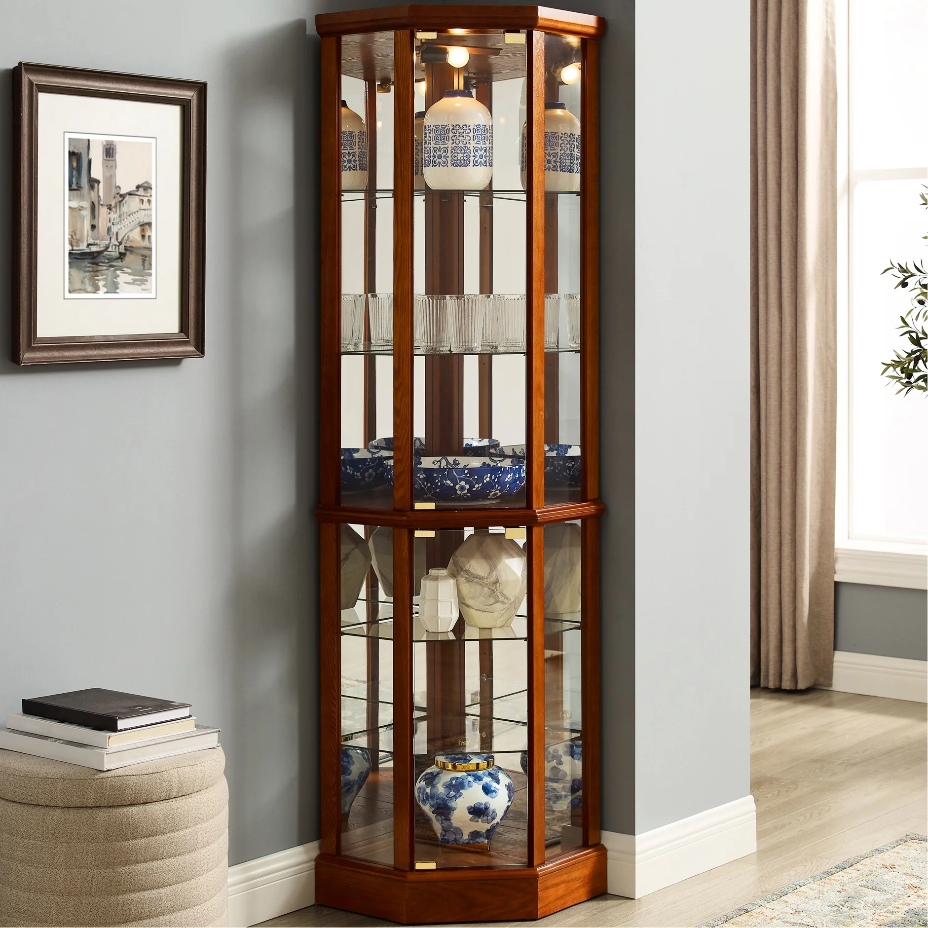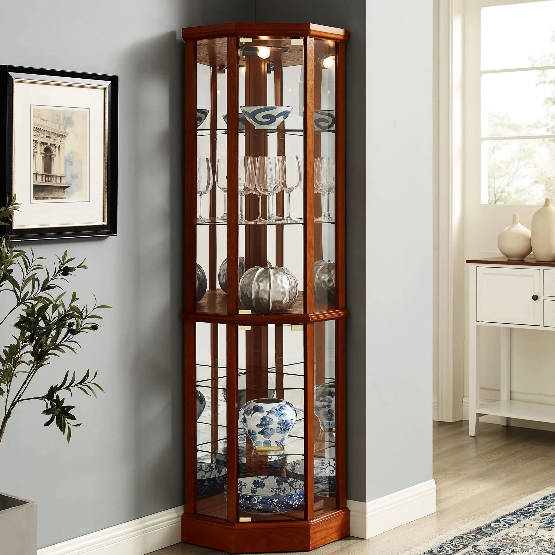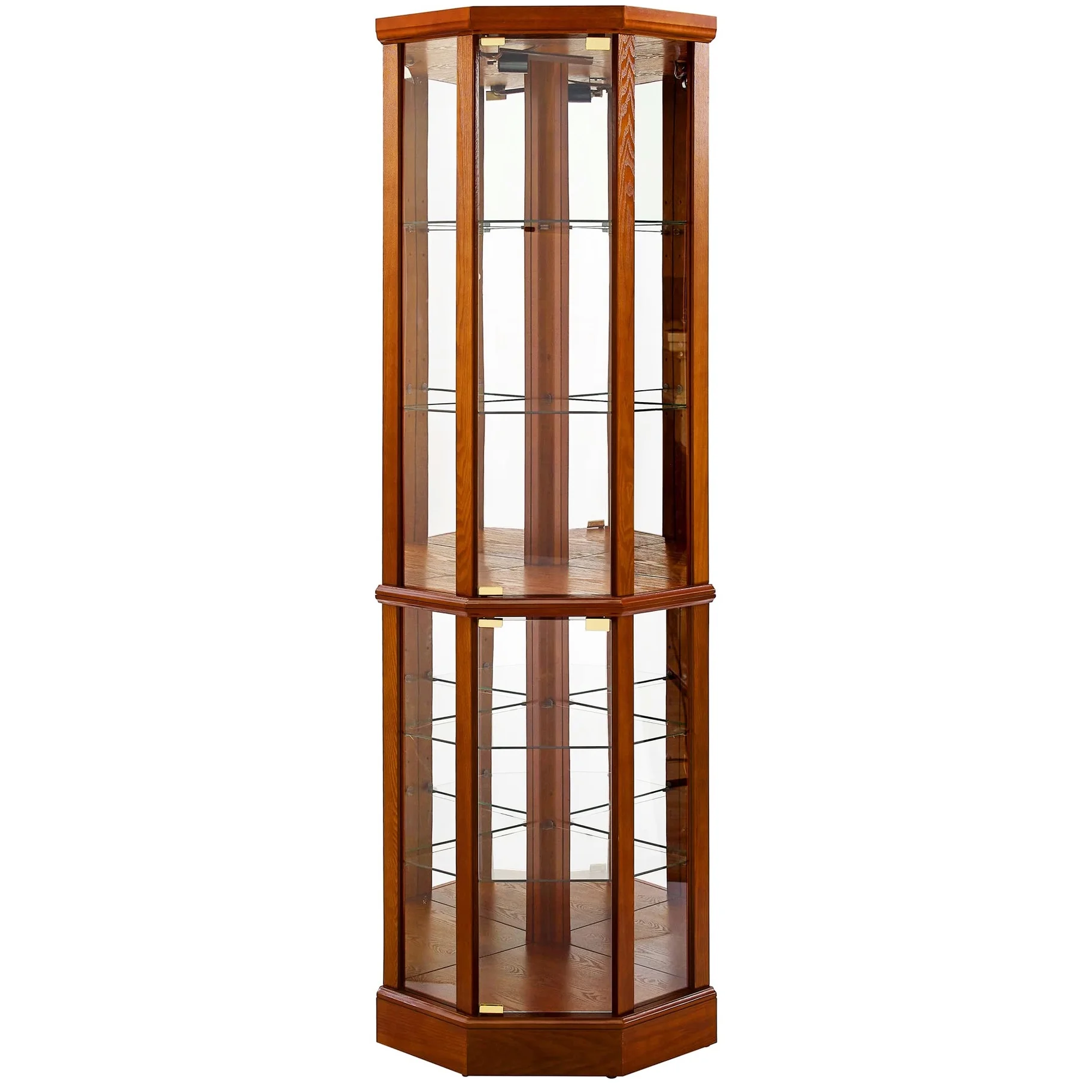 this 6 shelf lighted corner curio cabinet is a work of art in itself. walnut finish gives it a rich and sophisticated appearance. mirrored back panel creates a dramatic effect, enhancing beauty of your displayed items. 4 adjustable tempered glass shelves offer endless possibilities for customization, allowing you to create a unique display that reflects your personality. transitional style of cabinet makes it a versatile piece that can fit into any decor scheme. its space design is perfect for smaller spaces, while still providing ample storage. two hinged doors make it easy to access and organize your treasures. tipping wall anchor provides added security, and magnetic hardware on doors ensures a tight seal. when interior is turned on, in combination with mirrored back panel, your antiques, china dishes, and family photos are transformed into a breathtaking display that will be envy of your guests. built to last, this curio cabinet is a testament to quality and style.