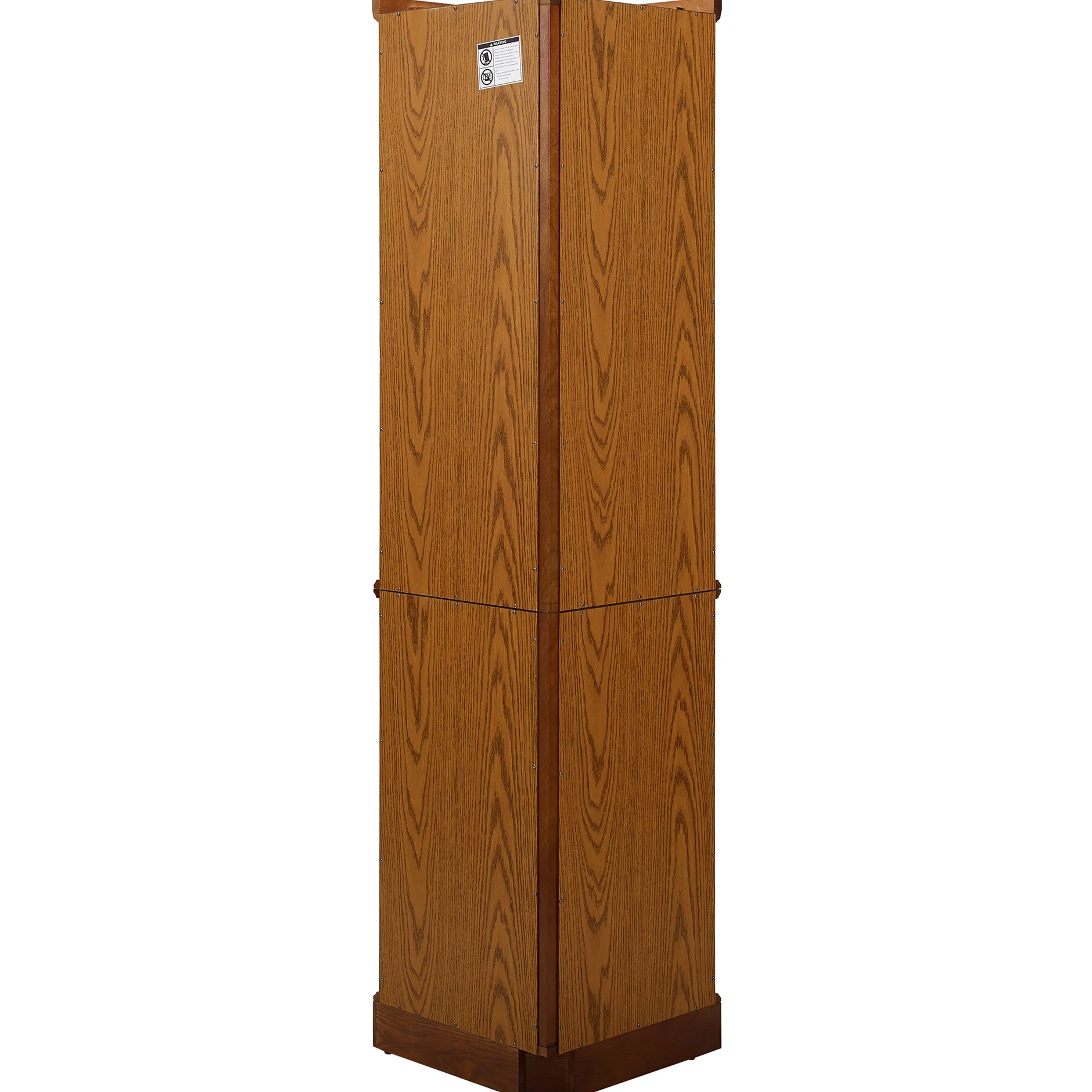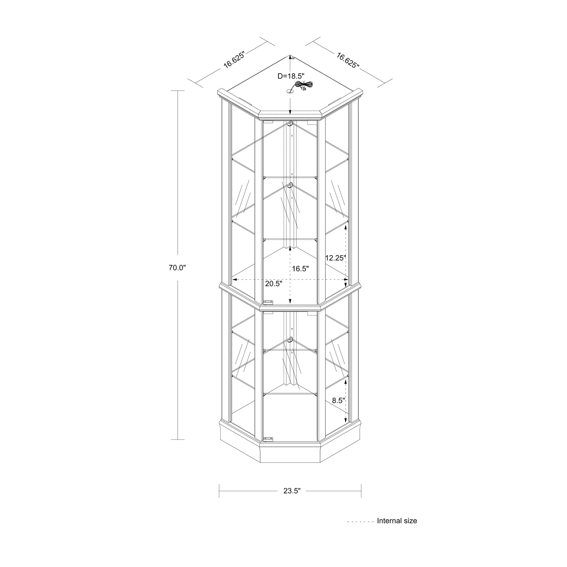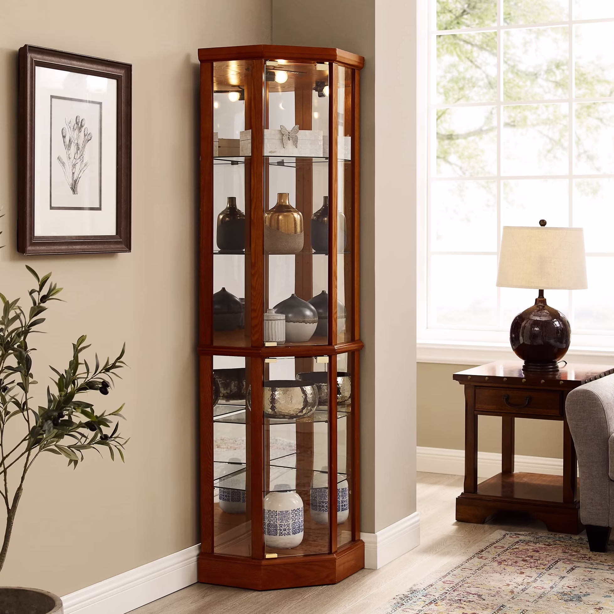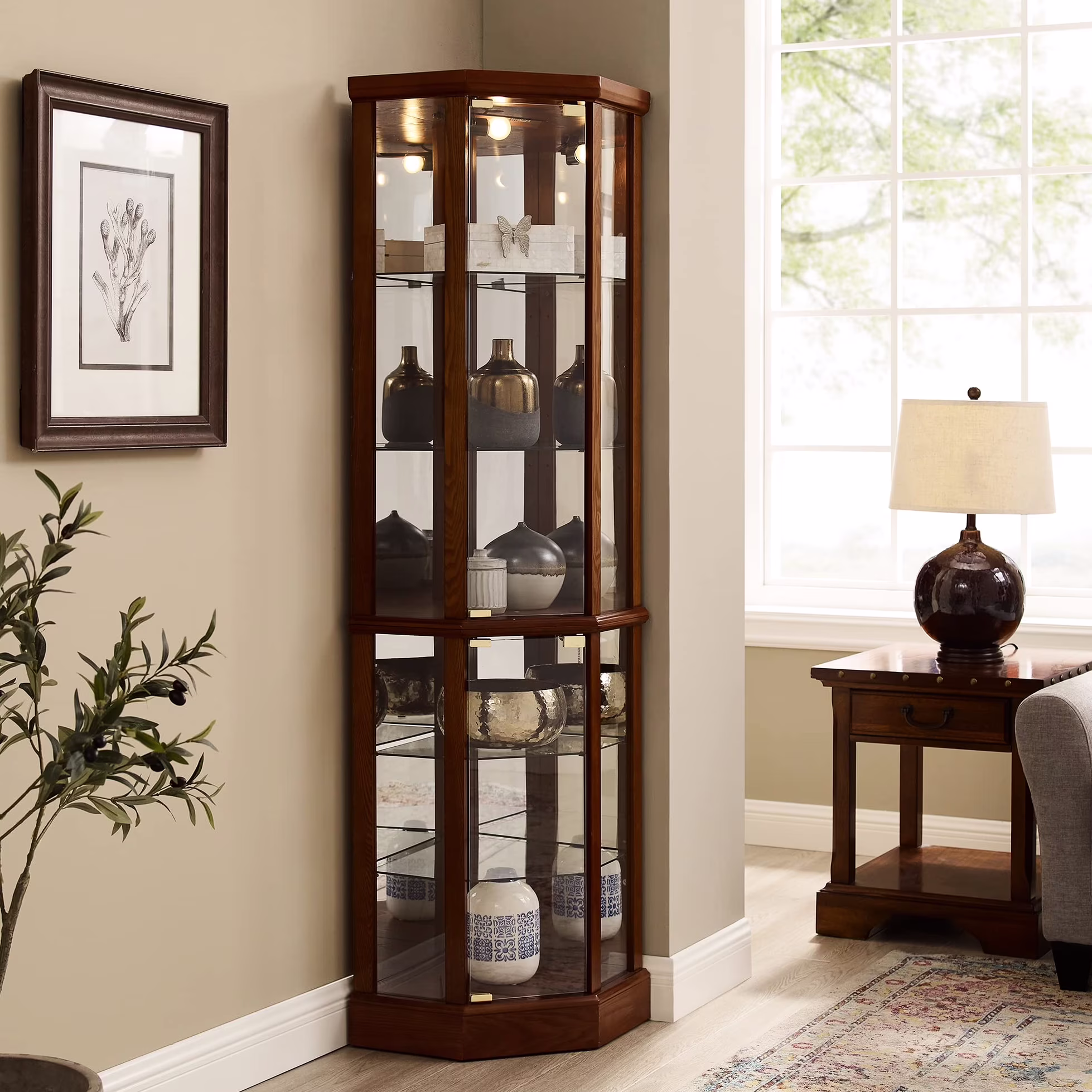 this 6 shelf lighted corner curio cabinet is a work of art in itself. walnut finish gives it a rich and sophisticated appearance. mirrored back panel creates a dramatic effect, enhancing beauty of your displayed items. 4 adjustable tempered glass shelves offer endless possibilities for customization, allowing you to create a unique display that reflects your personality. transitional style of cabinet makes it a versatile piece that can fit into any decor scheme. its space design is perfect for smaller spaces, while still providing ample storage. two hinged doors make it easy to access and organize your treasures. tipping wall anchor provides added security, and magnetic hardware on doors ensures a tight seal. when interior is turned on, in combination with mirrored back panel, your antiques, china dishes, and family photos are transformed into a breathtaking display that will be envy of your guests. built to last, this curio cabinet is a testament to quality and style.