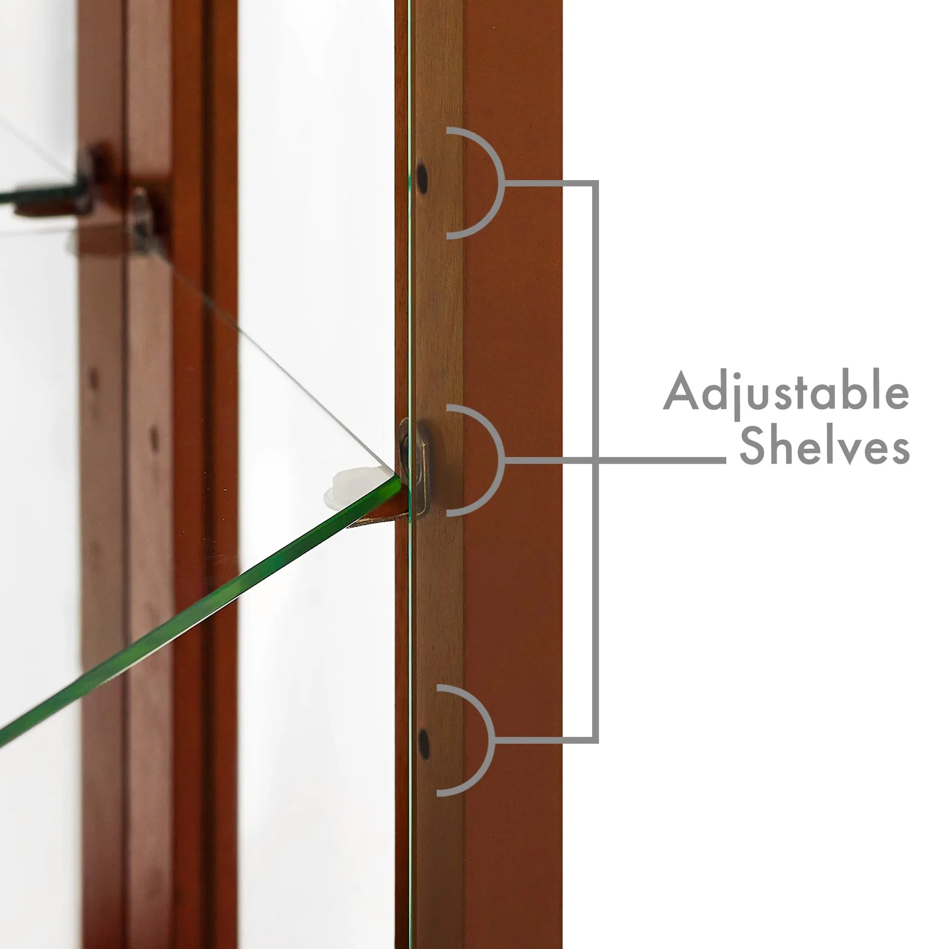 - mirrored back panel of curio cabinet enhances reflection of , making items inside cabinet appear more vibrant and colorful. (: enhanced reflection, vibrant and colorful items, mirrored back effect) this corner curio cabinet's adjustable shelves and mirrored back panel make it a standout piece. it allows you to create a personalized display. : adjustable shelf standout, personalized display cabinet, mirrored back standout cabinet