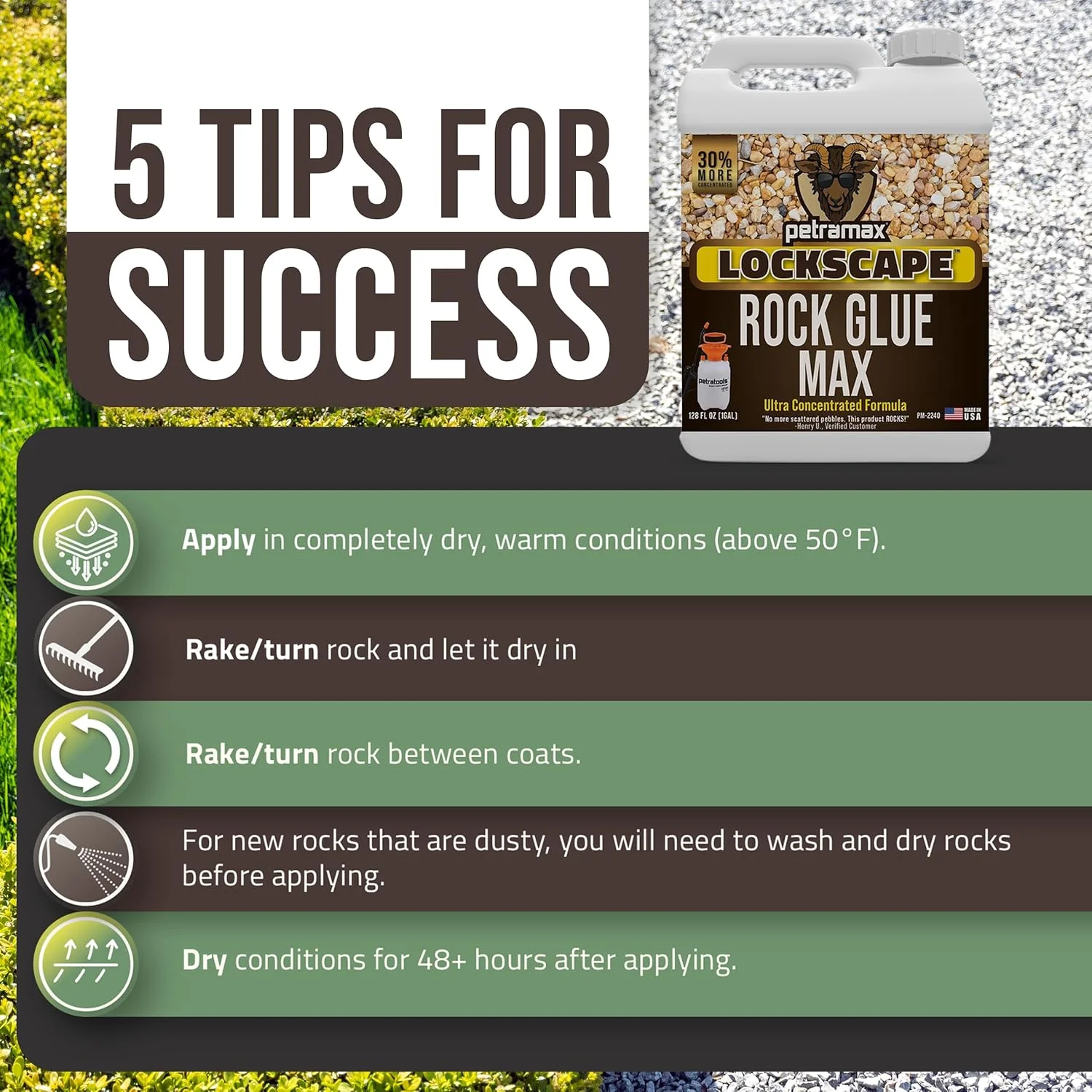 - Strong adhesive for gravel, pebbles, and mulch that holds materials in place
