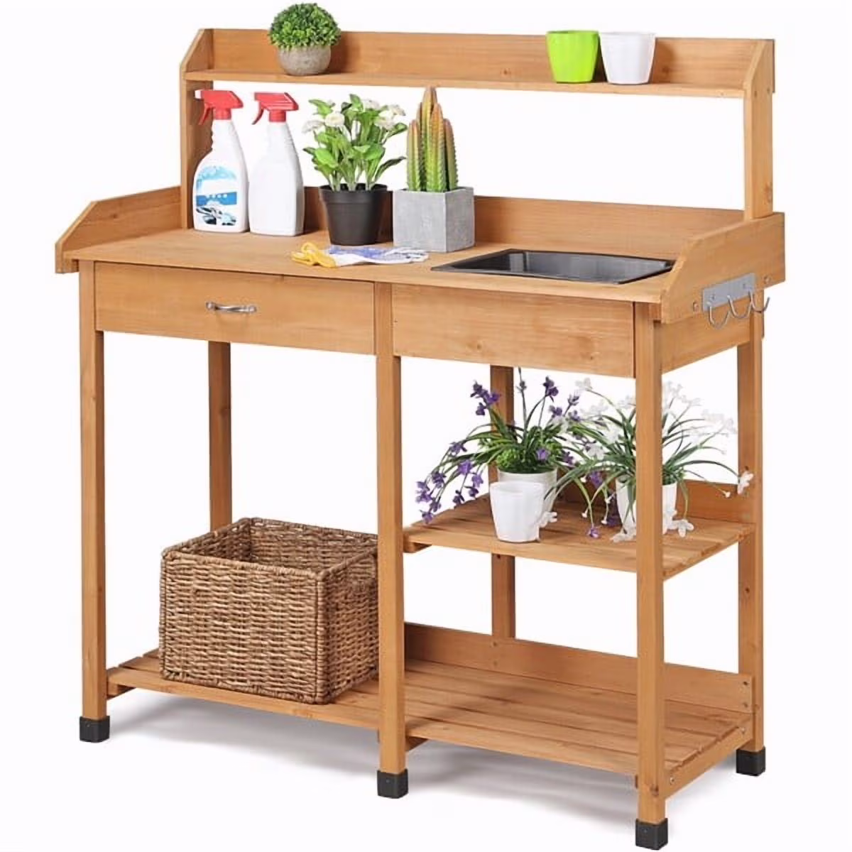 This 100% fir wood gardening console with an unadorned wood look can harmonize with your garden or backyard. The thoughtful functions make it a dedicated gardening assistant. The spacious table top with a removable sink provides a special place for transplanting, watering, washing, transplanting, or mixing nutrient soil and facilitates the afterward cleaning. The elevated rack, smooth drawer, open shelf, and 3 side hooks can meet your needs. This storage garden table is a professional gardening and storage solution.