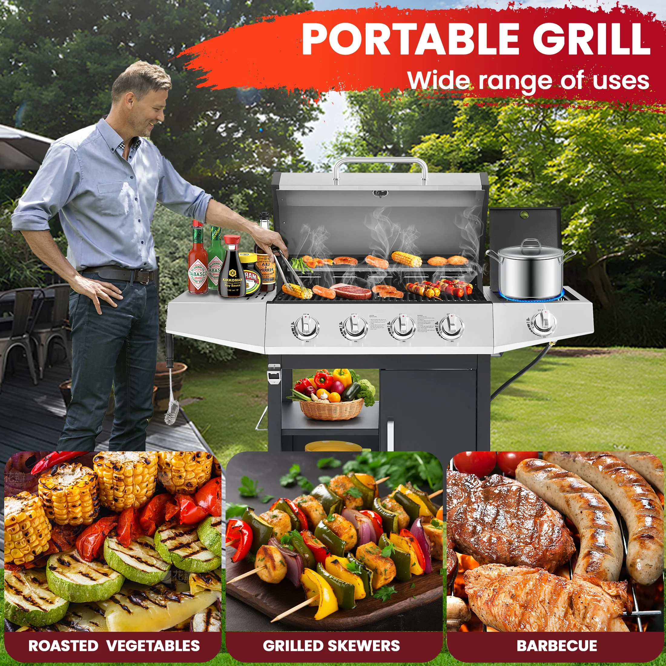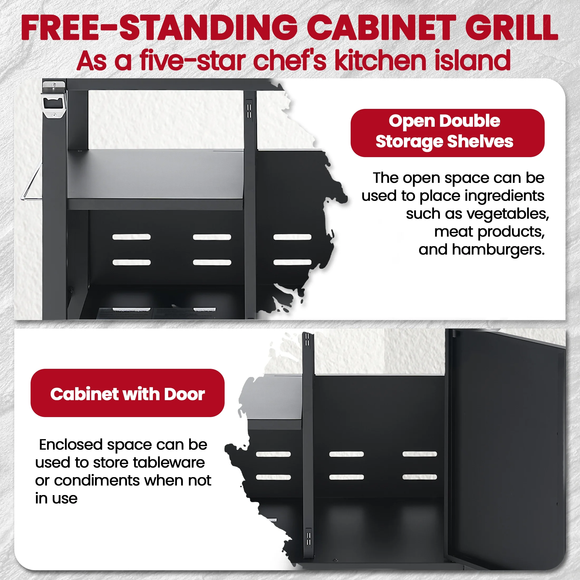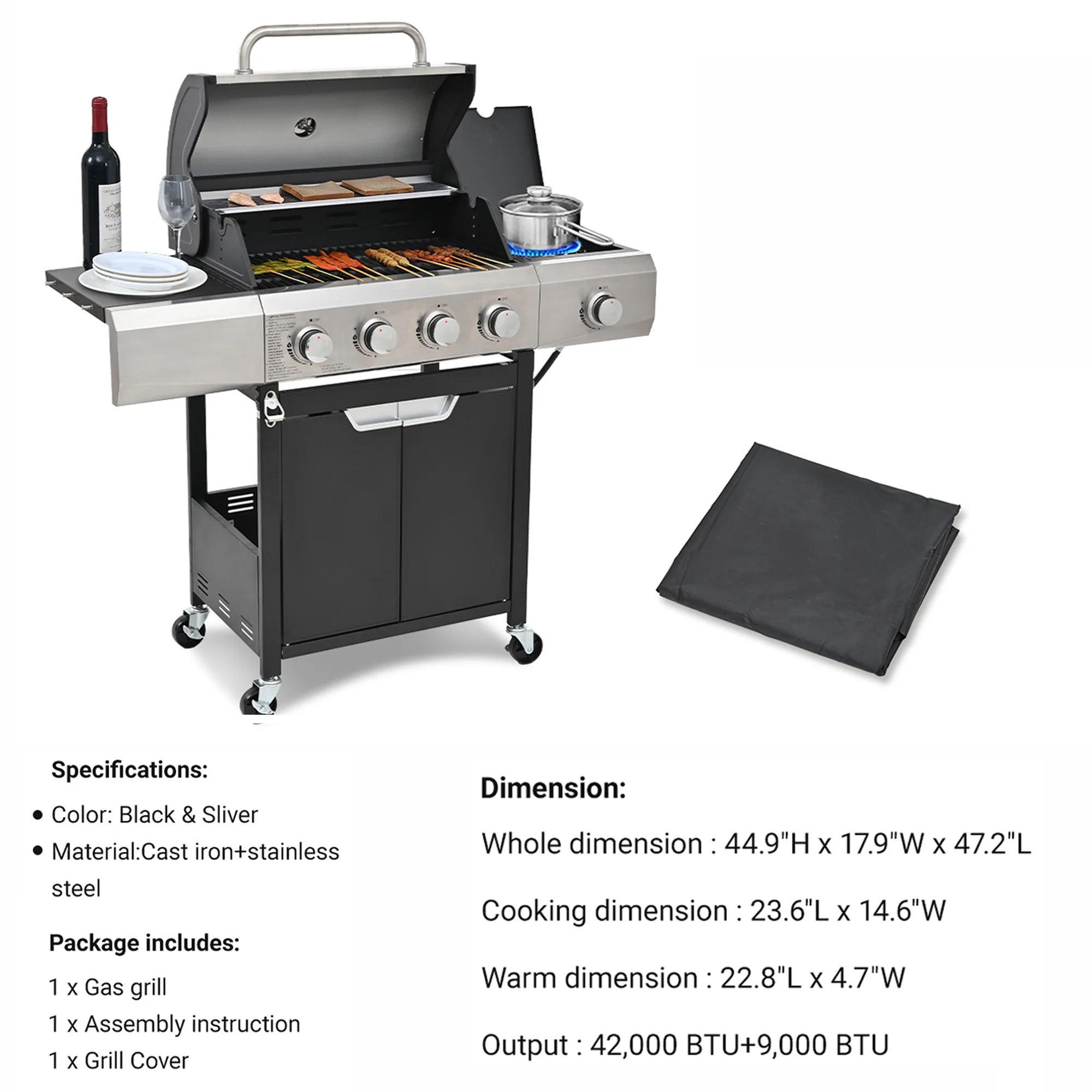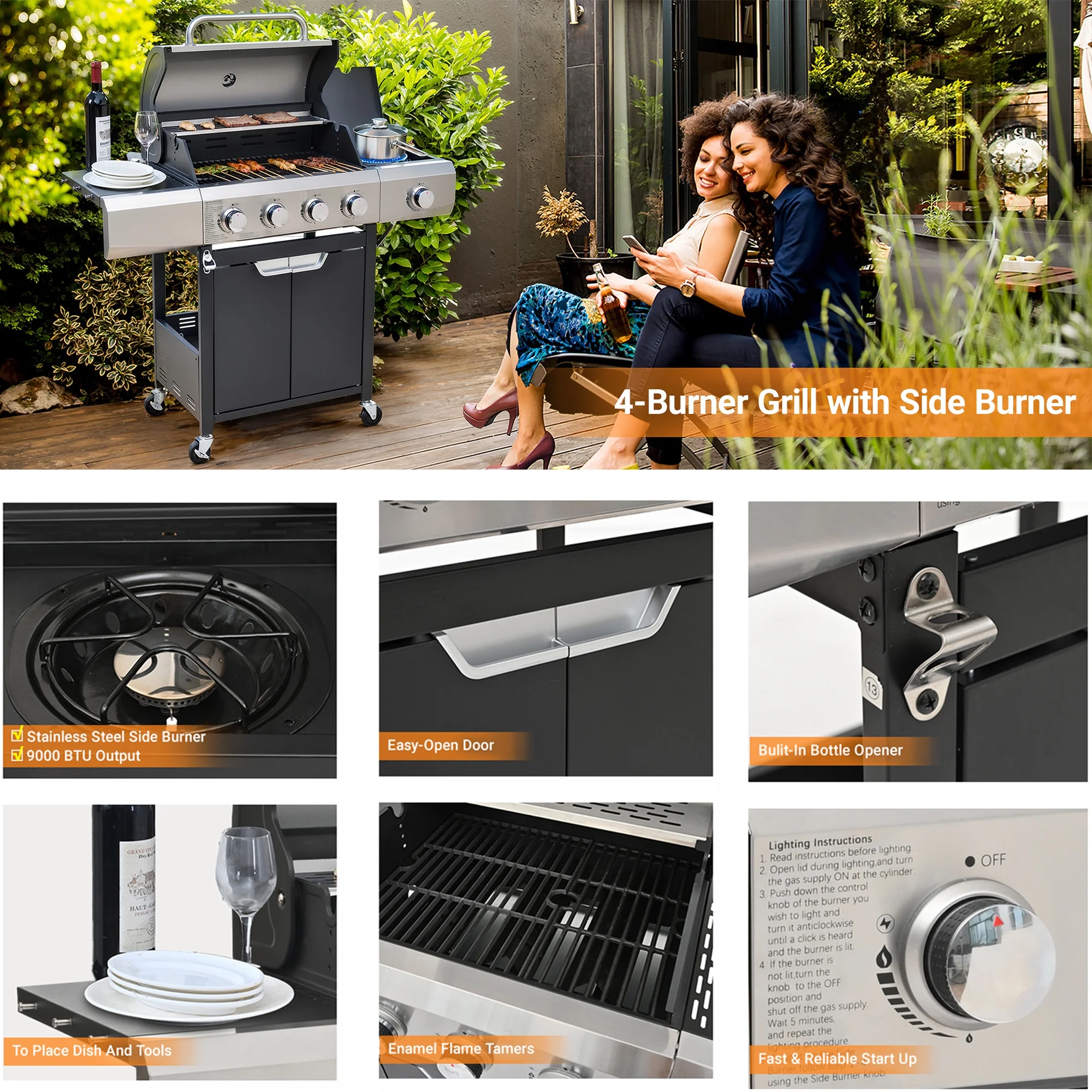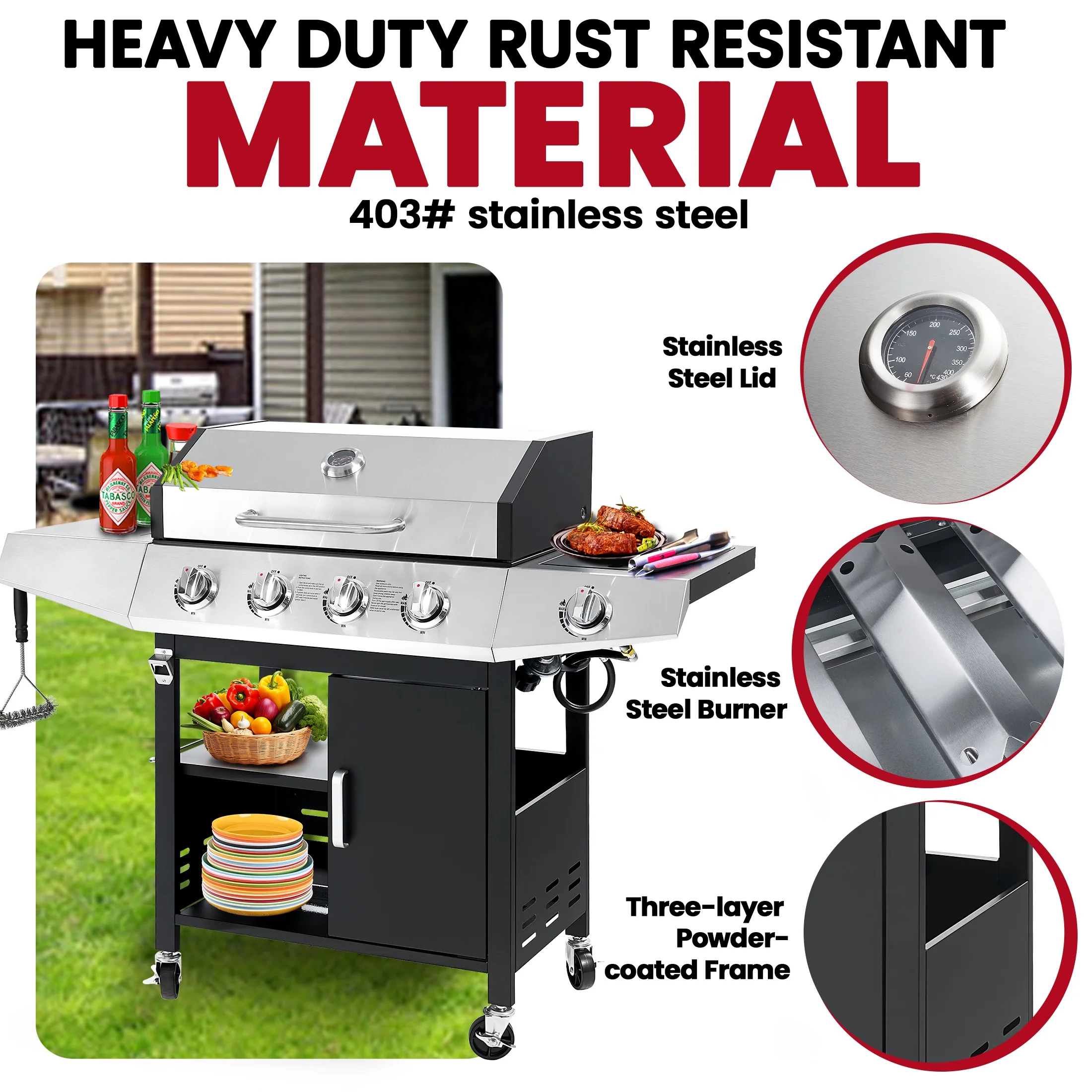- ??[Stainless Steel Construction]: The high-quality stainless steel is massively applied to the durable double-layer lid, cooking grates, flame tamers, burners and cabinet doors, which are built-to-last for long-time use.
