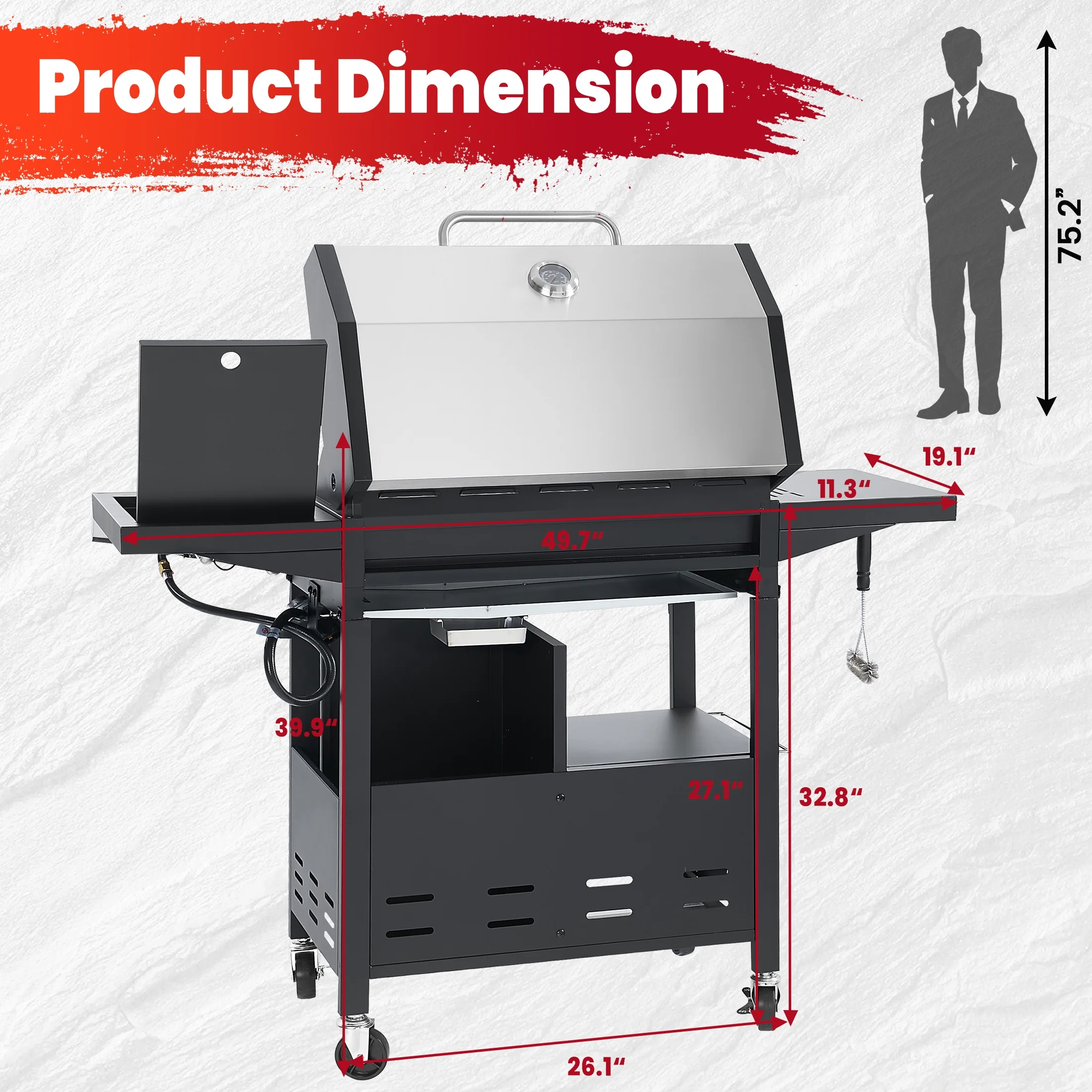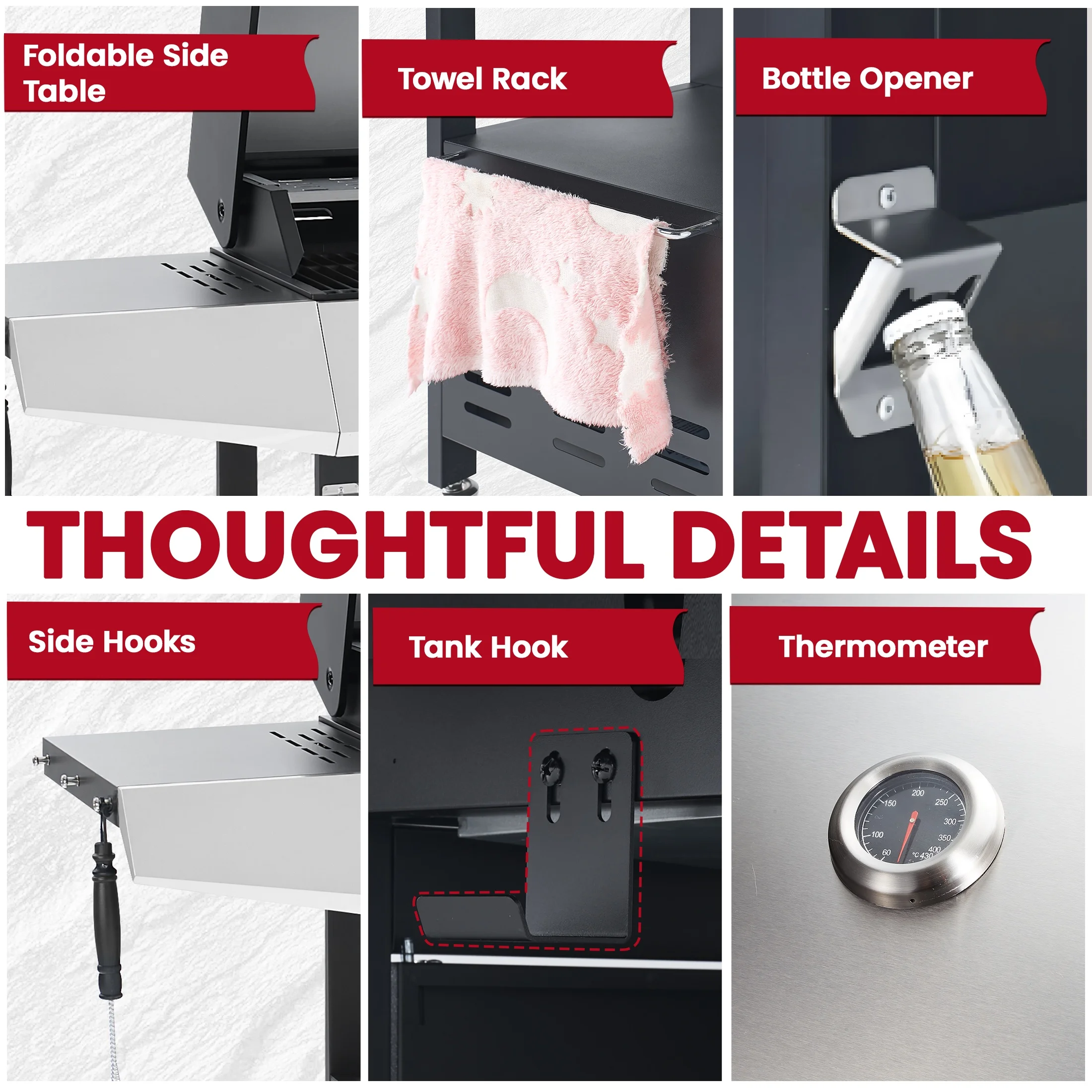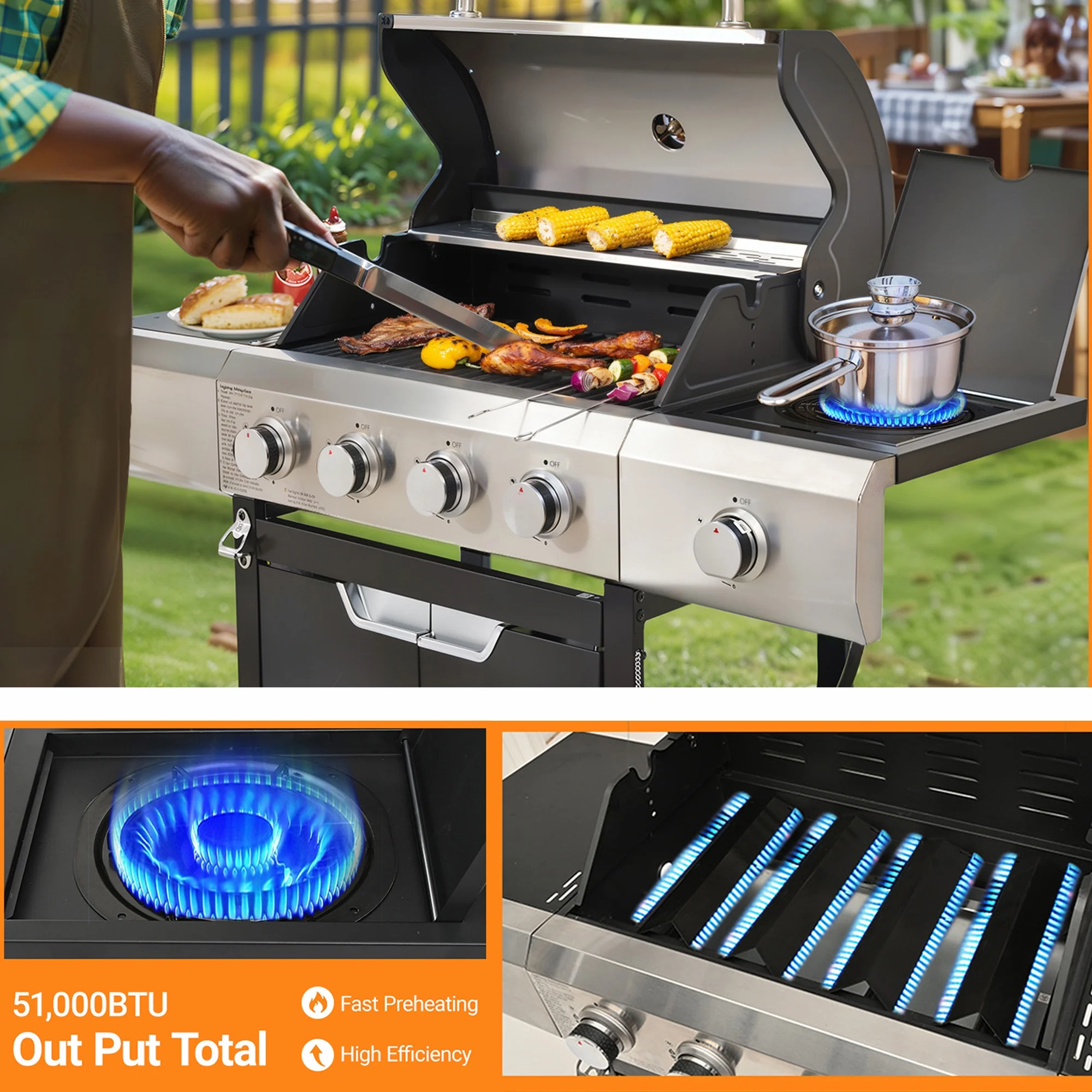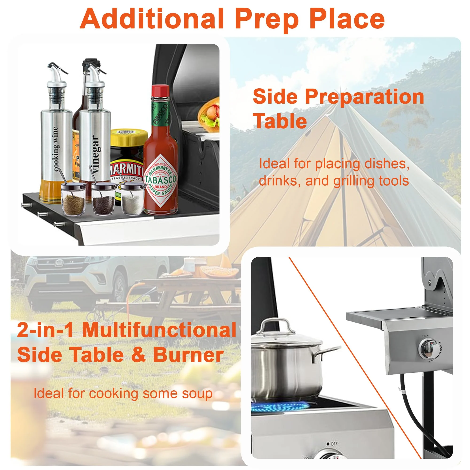 - ??[Additional Prep Space]: Side table on the right side offers more preparation space for seasonings and grilling tools; the lid of side burner functions as a table for added workspace.