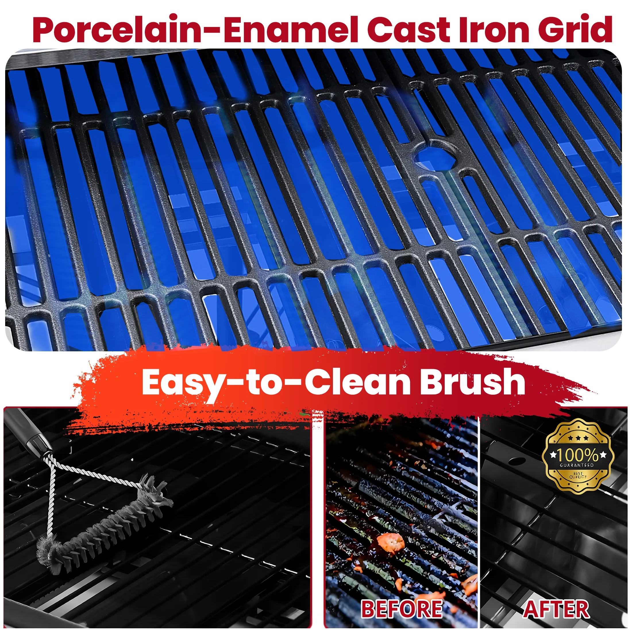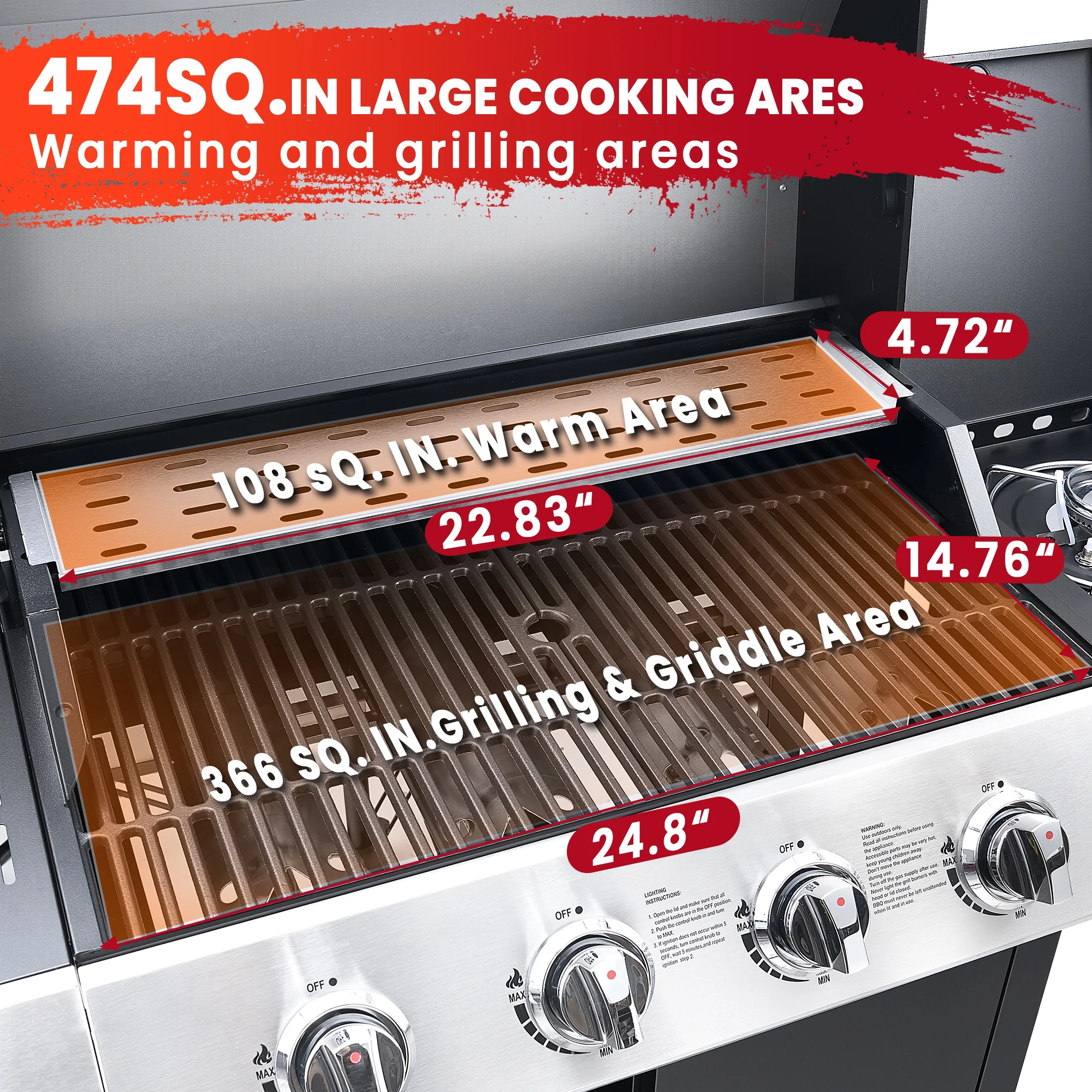 - ??[Abundant Cooking Space]: 287 square inches cooking area at a total comprises 376 sq. in. stainless steel cooking grates and 89 sq. in. chrome-plated steel wire warming rack, which fits for cooking 20 hamburgers at the same time.