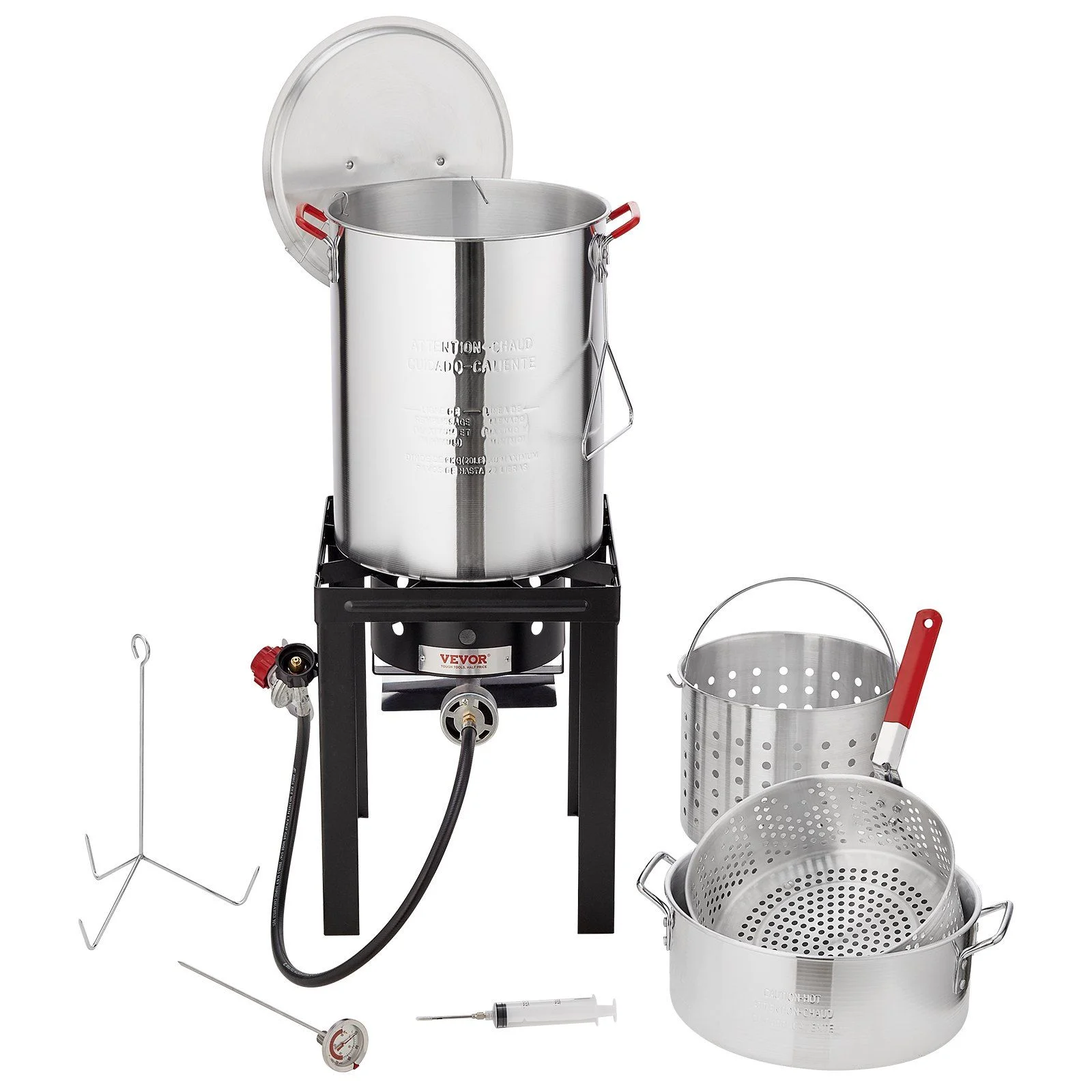 - Abundant Accessories: A set of accessories that solves all problems. Accessories include a 30-quart pot, a 10-quart pot, lid, perforated frying basket/steamer, thermometer, perforated turkey rack, hanging hook, marinade injector, burner stand, LP hose, and regulator. The accessories are complete, most of the parts have CSA certification, the thickened stand provides a secure base and prevents tipping, and the steamer stock pot materials are sturdy and safe.