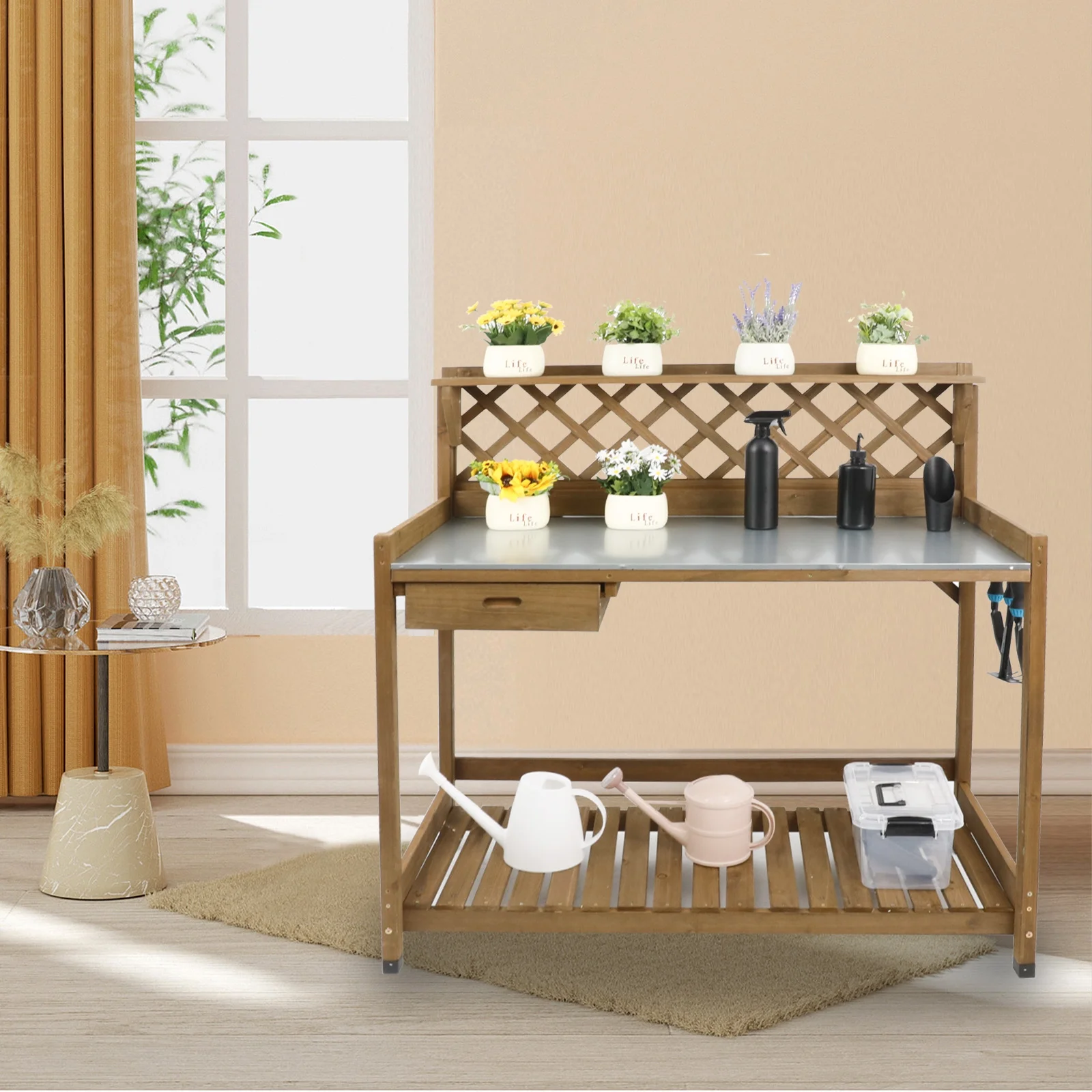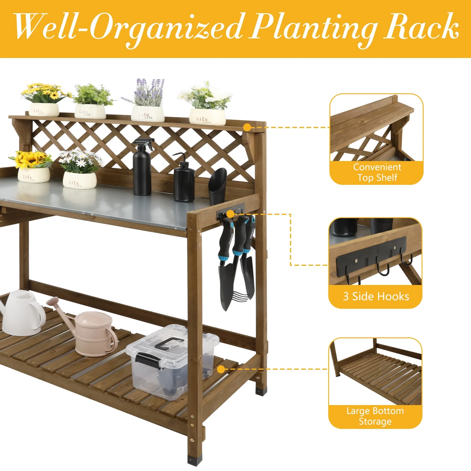 - ��THOUGHTFUL DESIGN��Enhance Your Gardening With This Versatile Potting Table Featuring A Top Shelf For Plants And Tools. Raised Edges Prevent Items From Falling, While Three Side Hooks Keep Tools Within Easy Reach. The Waterproof Rubber Feet Protect Surfaces And Prevent Damage From Ground Moisture.