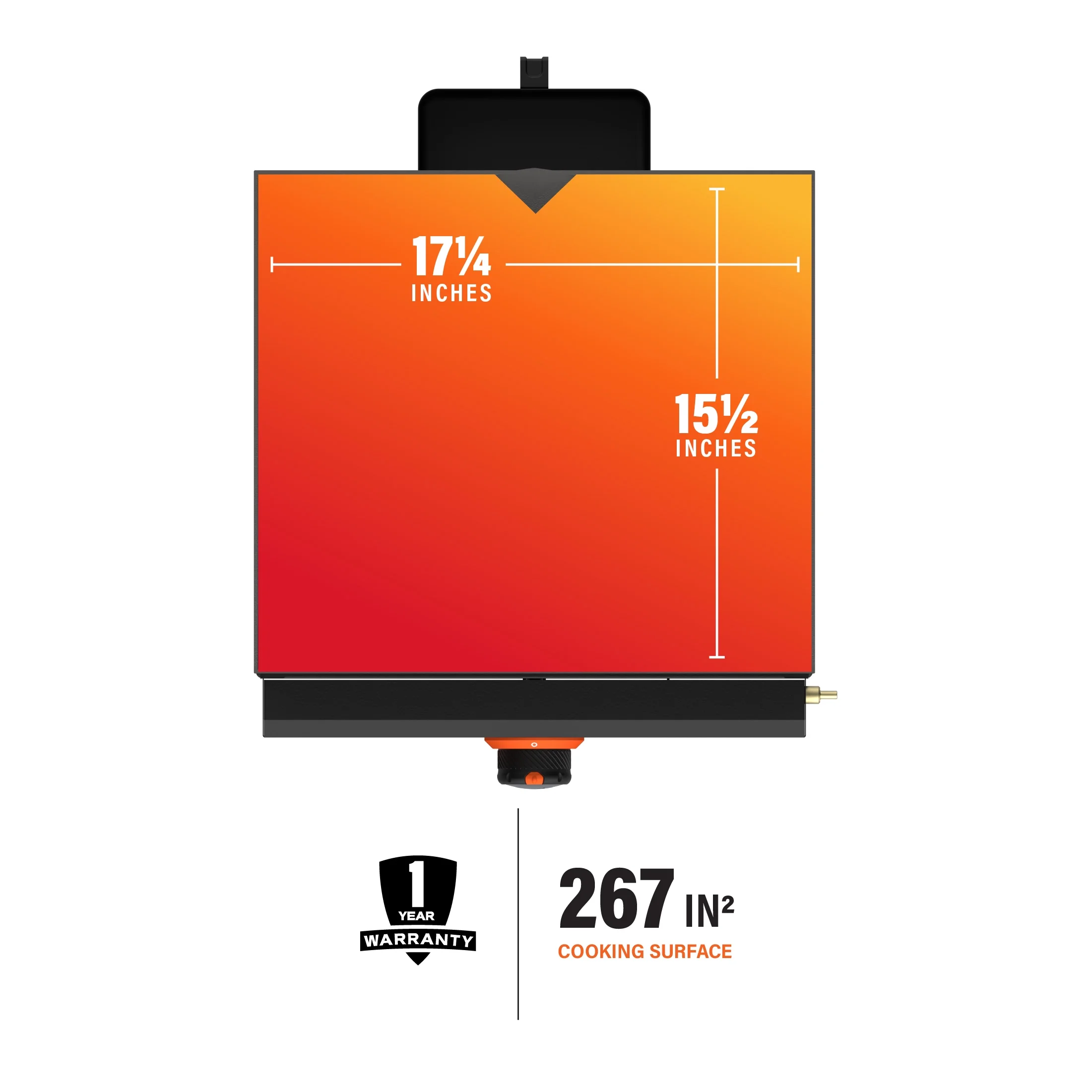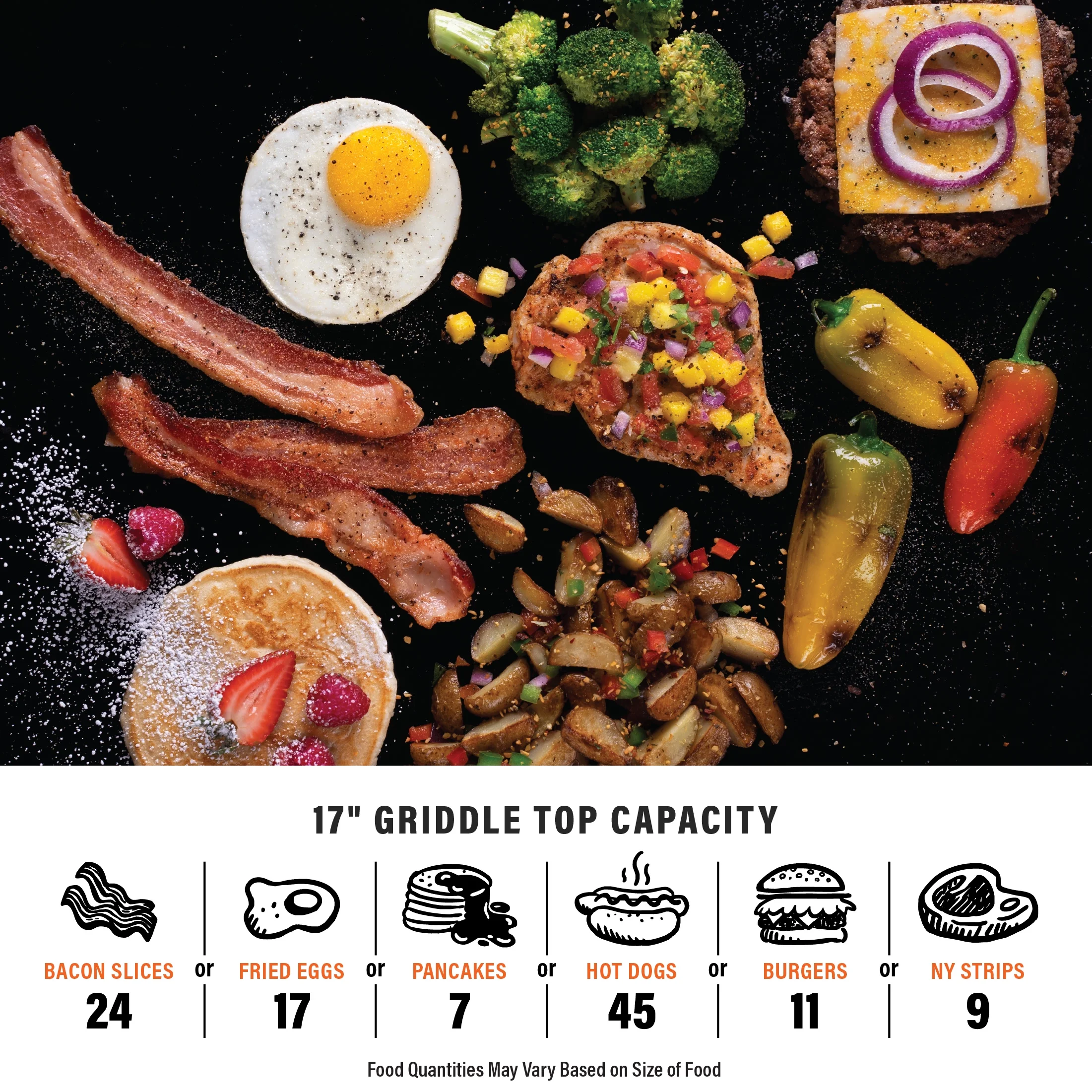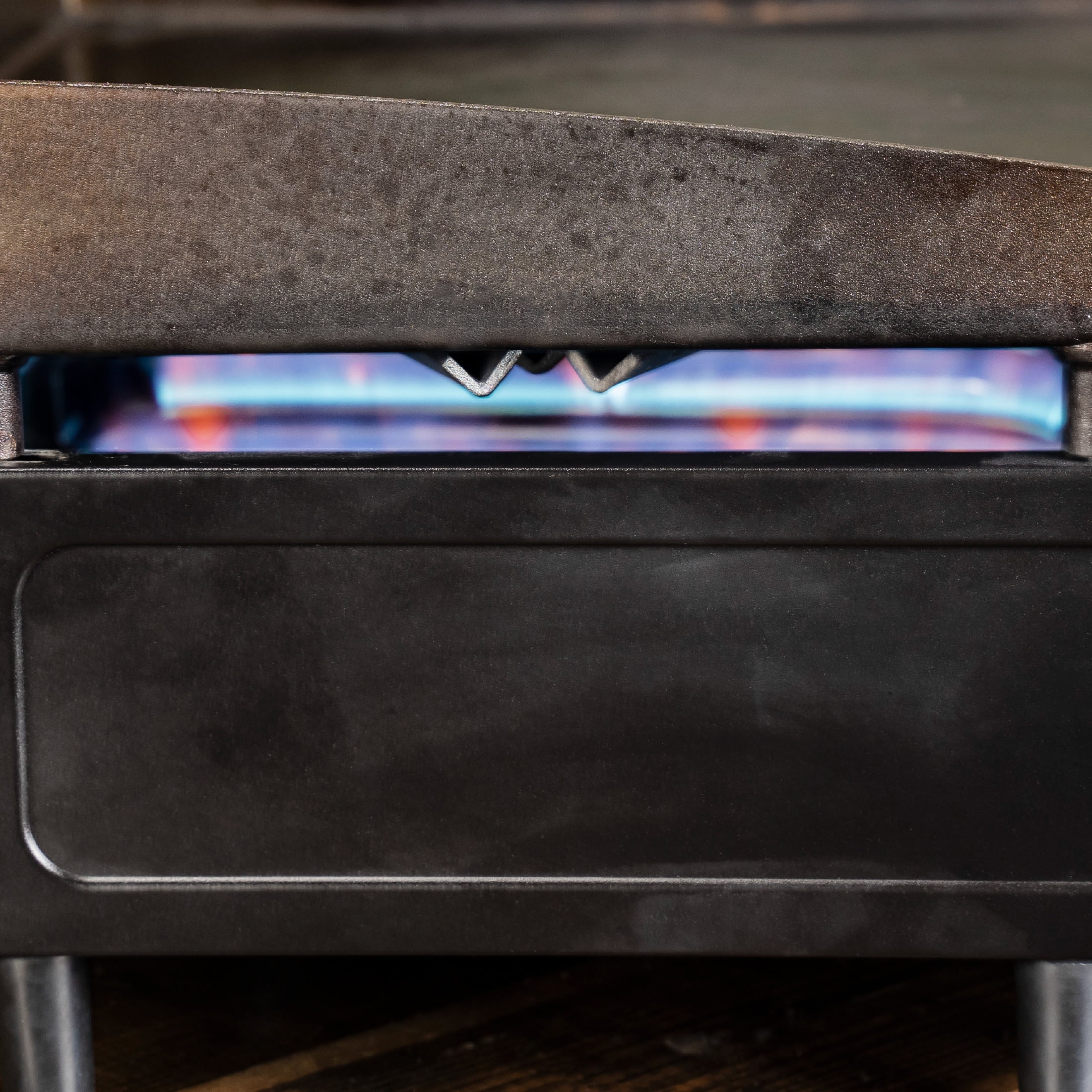 - Heavy duty rolled steel griddle plate with 267 sq. in. cooking area