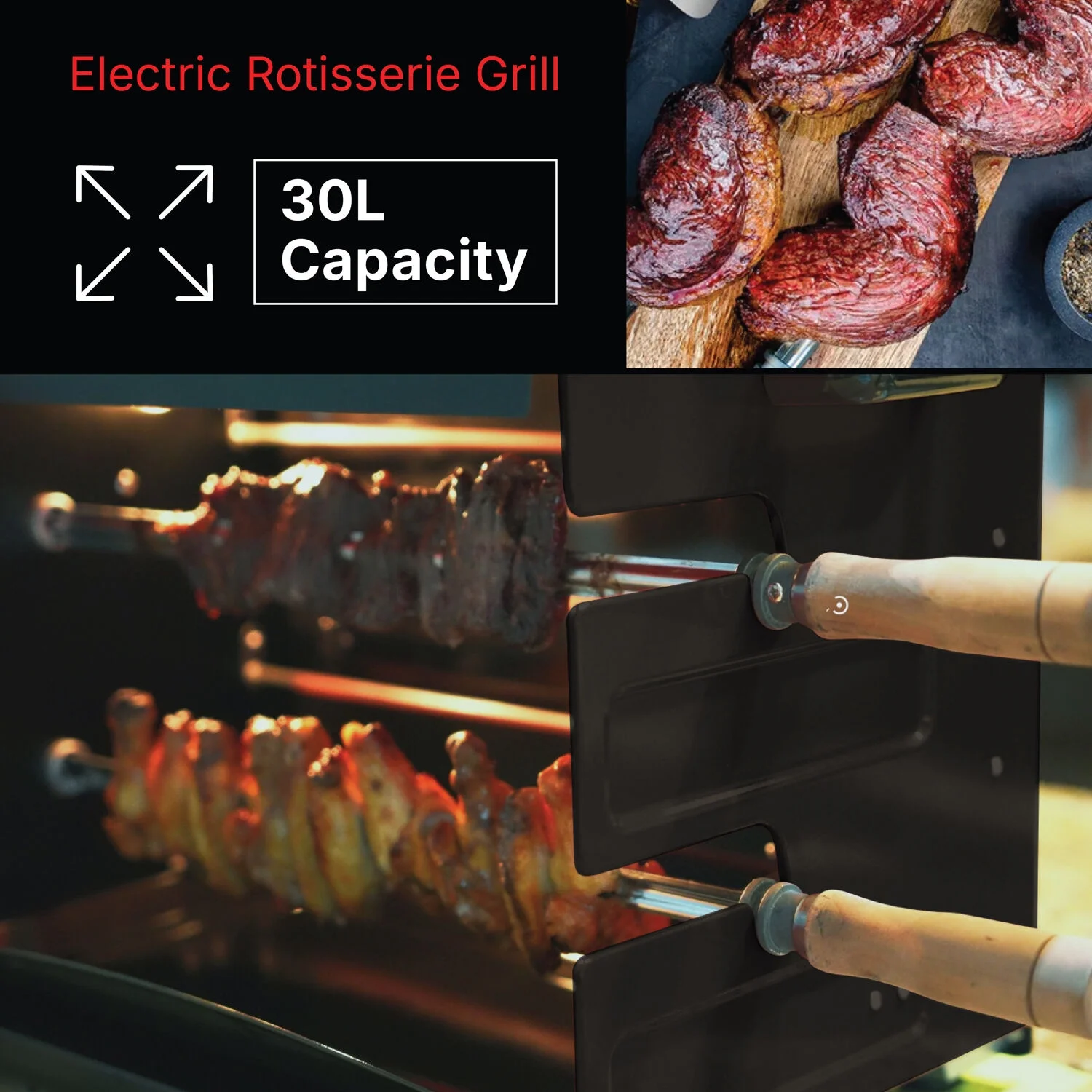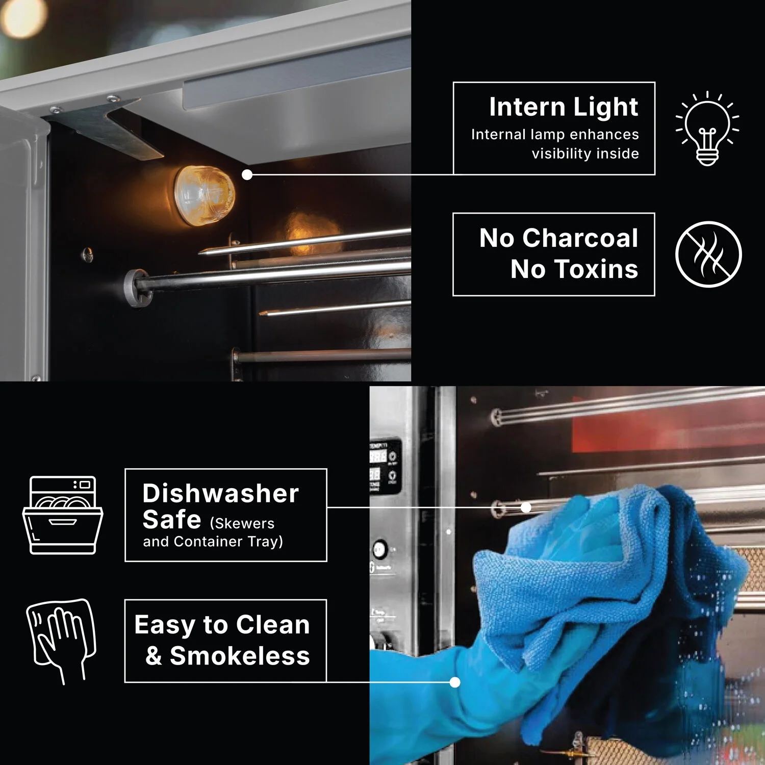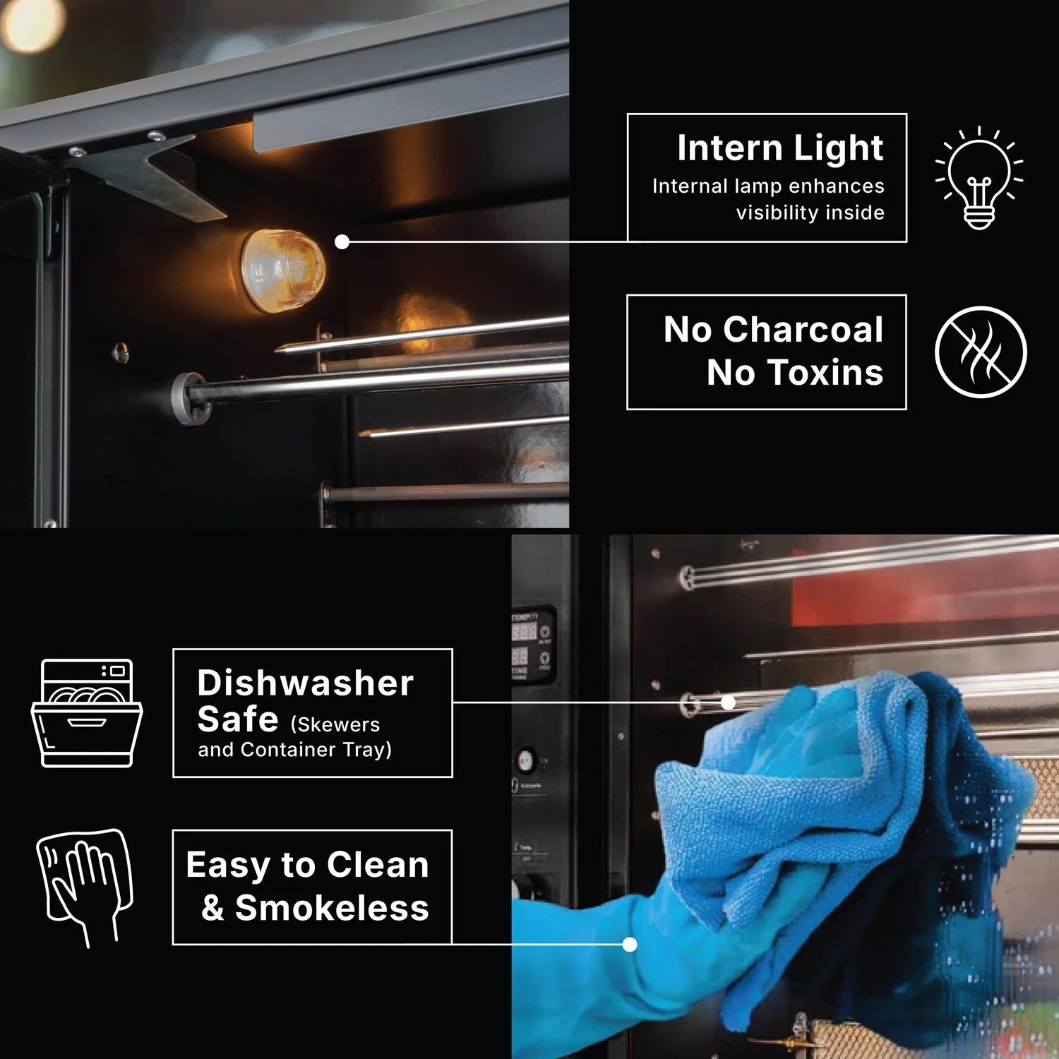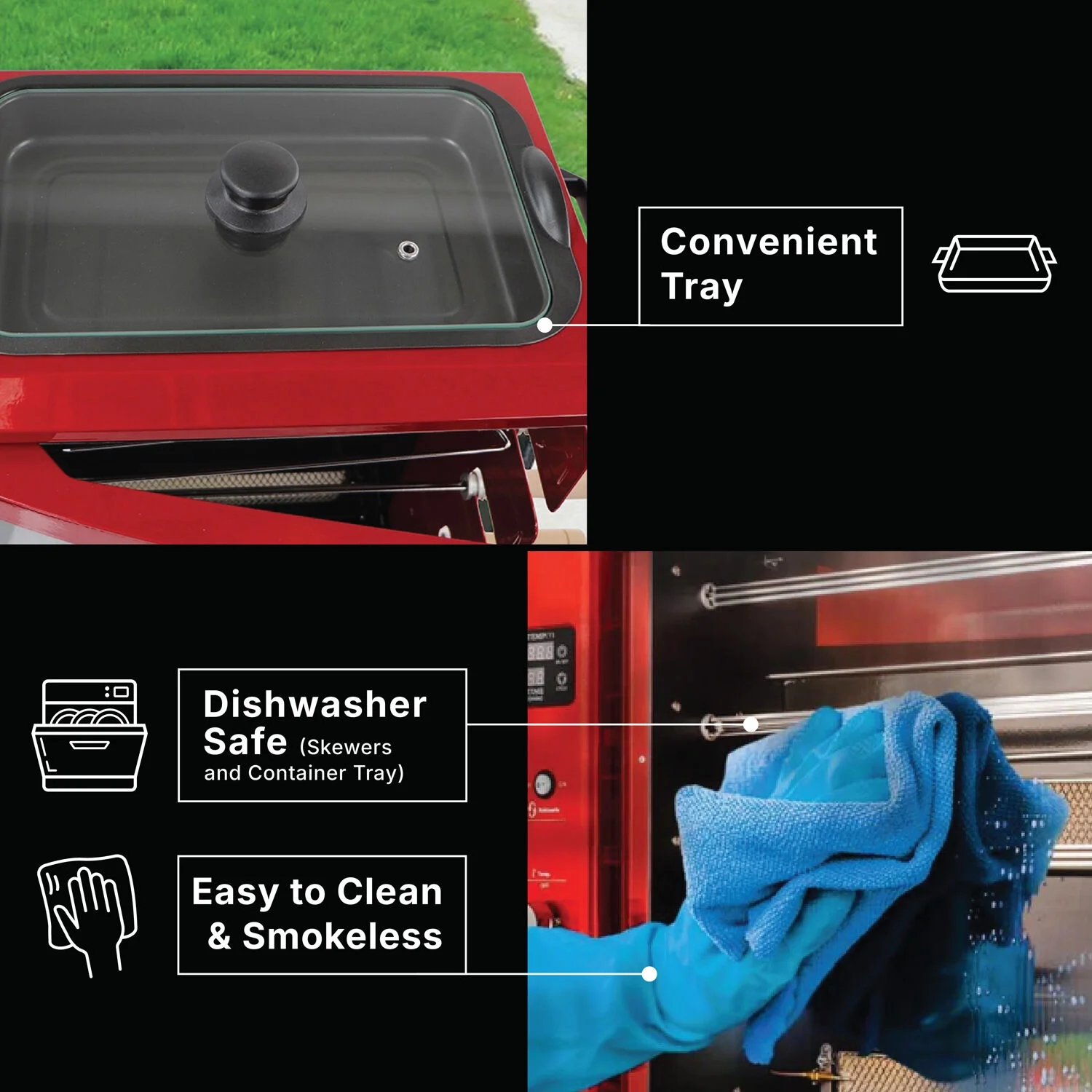 - Easy-to-clean & smoke-free: This rotisserie grill is quick and easy to clean because it has a modern design and a tray for collecting grease. It also has cutting-edge technology that lets you get real BBQ flavor without smoke.