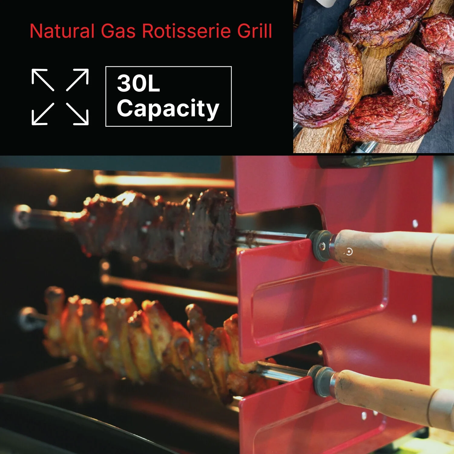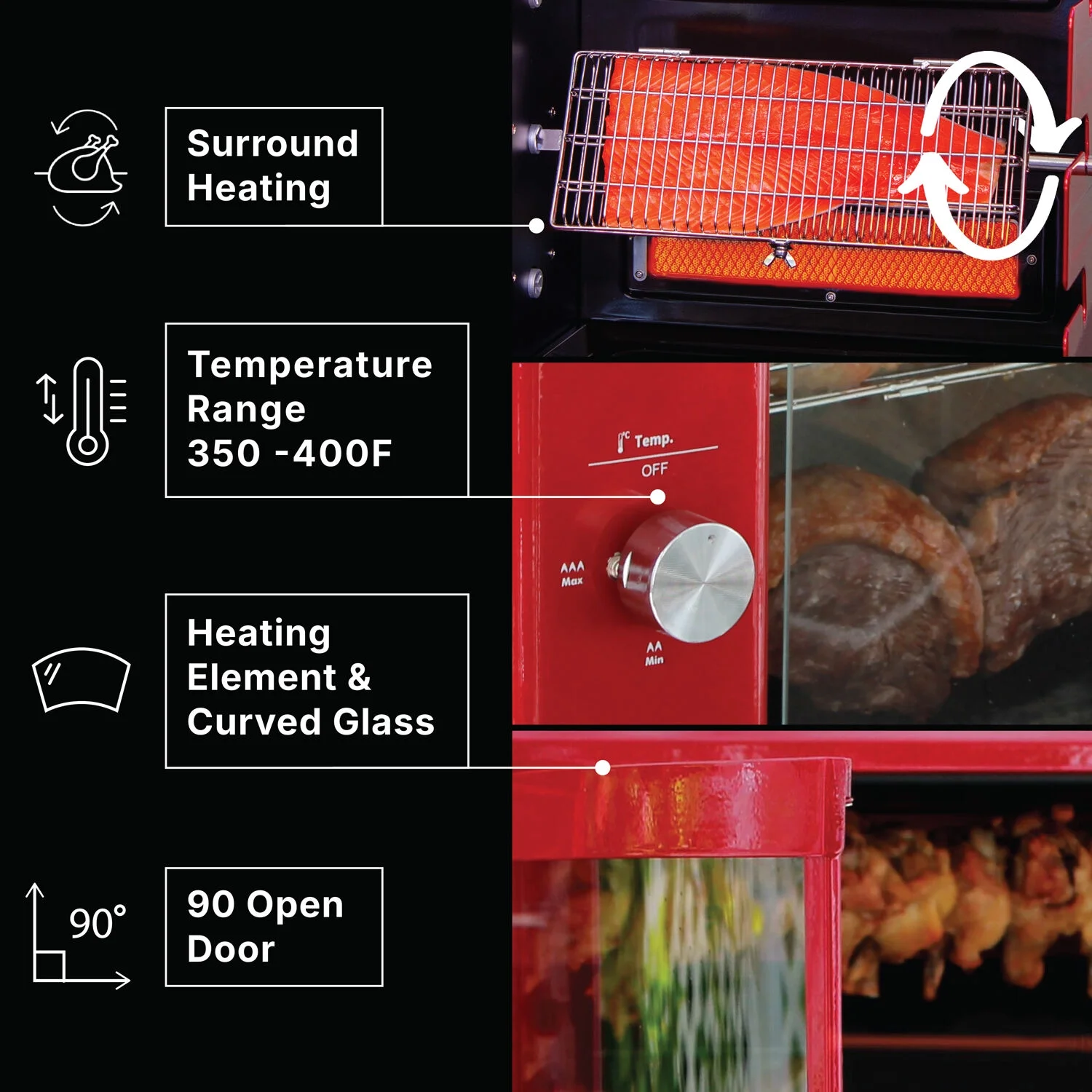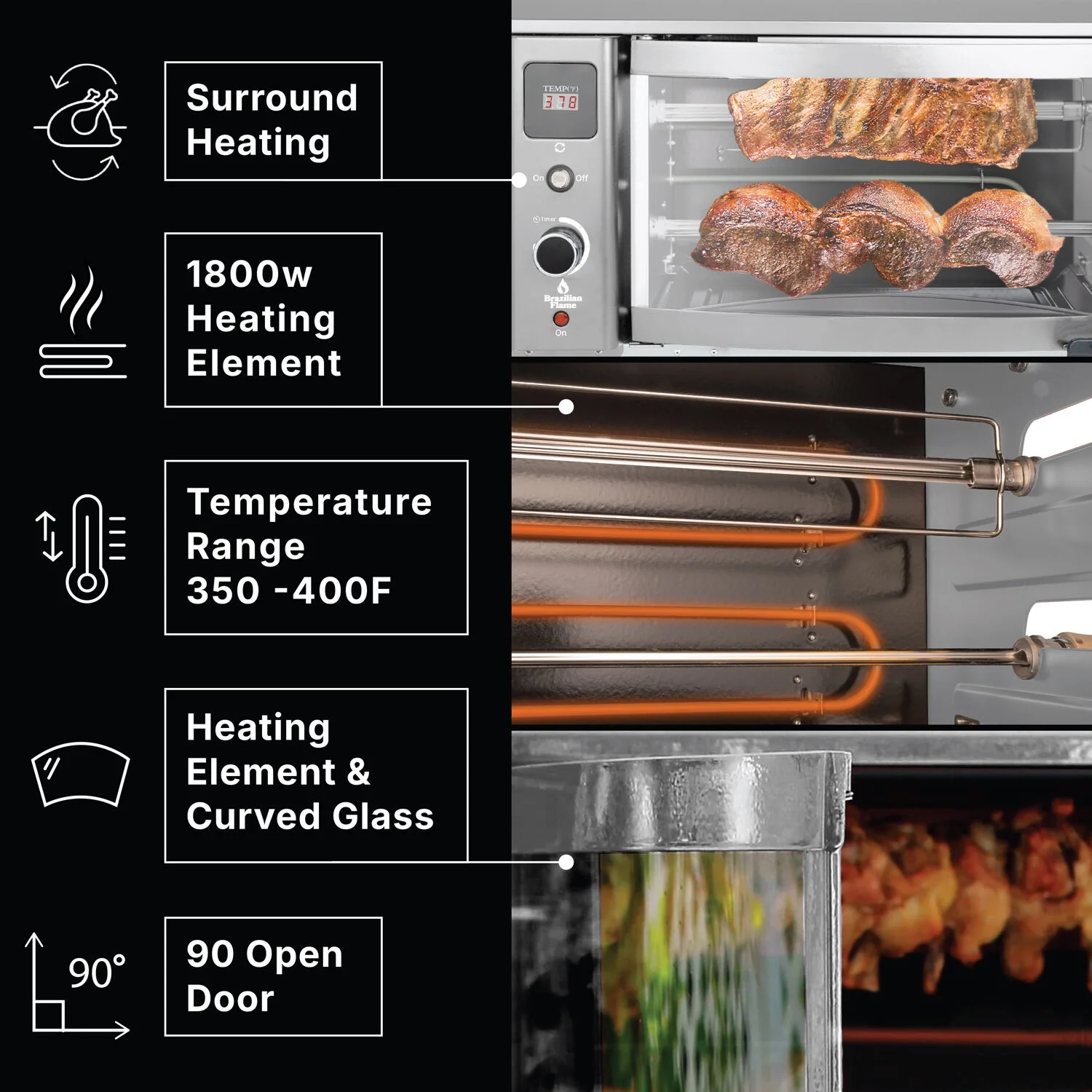 - Multi-skewer rotisserie barbeque: This multi-skewer rotating system makes sure that your chicken, fish, steak, and vegetables are cooked evenly and taste much better than they would in an oven, skillet, or regular grill.