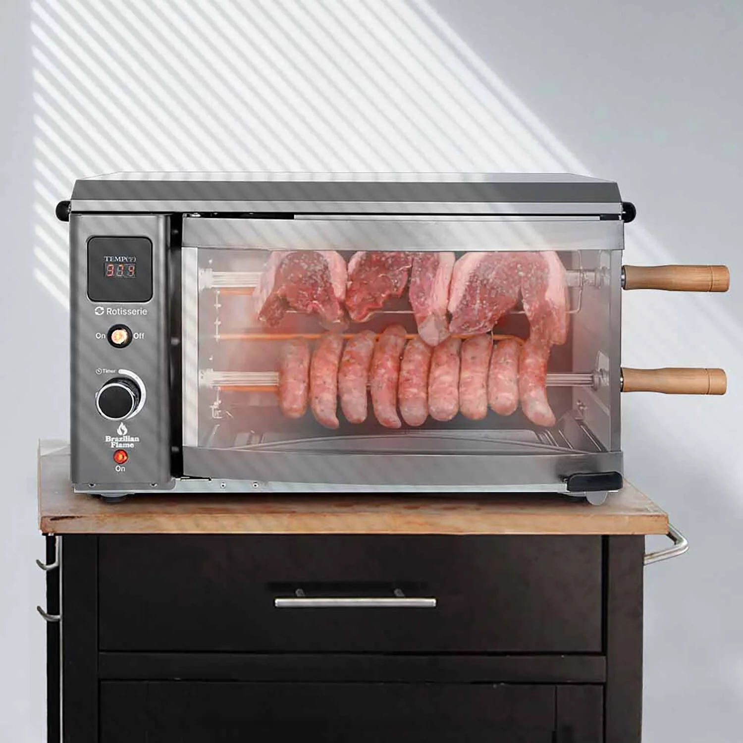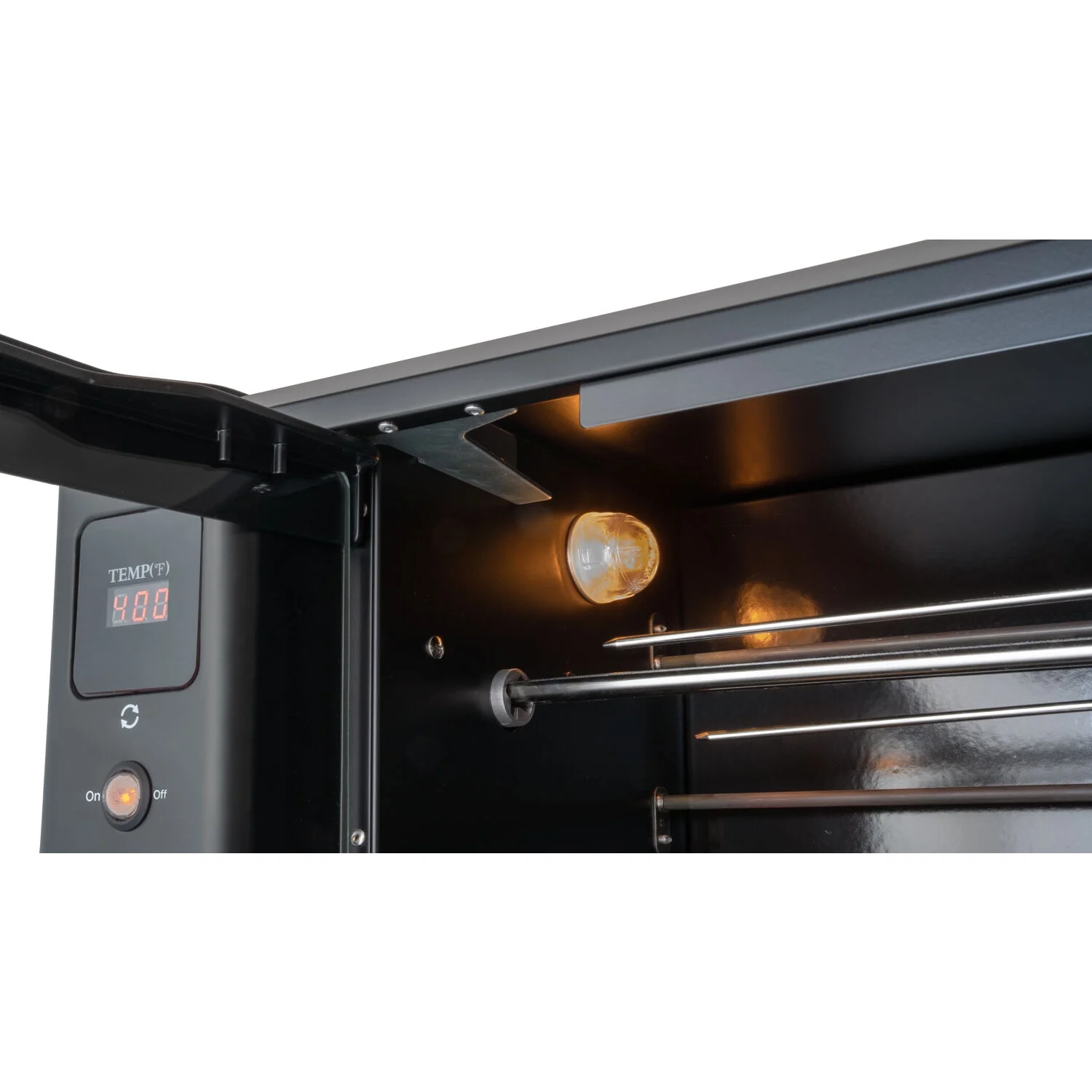- Simply plug the rotisserie into a dedicated outlet with enough amps to power it, then set the temperature using easy knobs to turn it on. Yes, it's that simple!