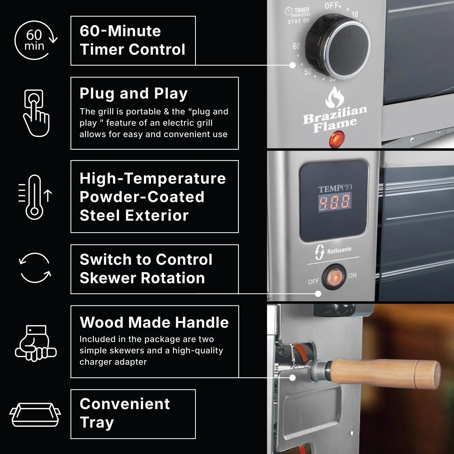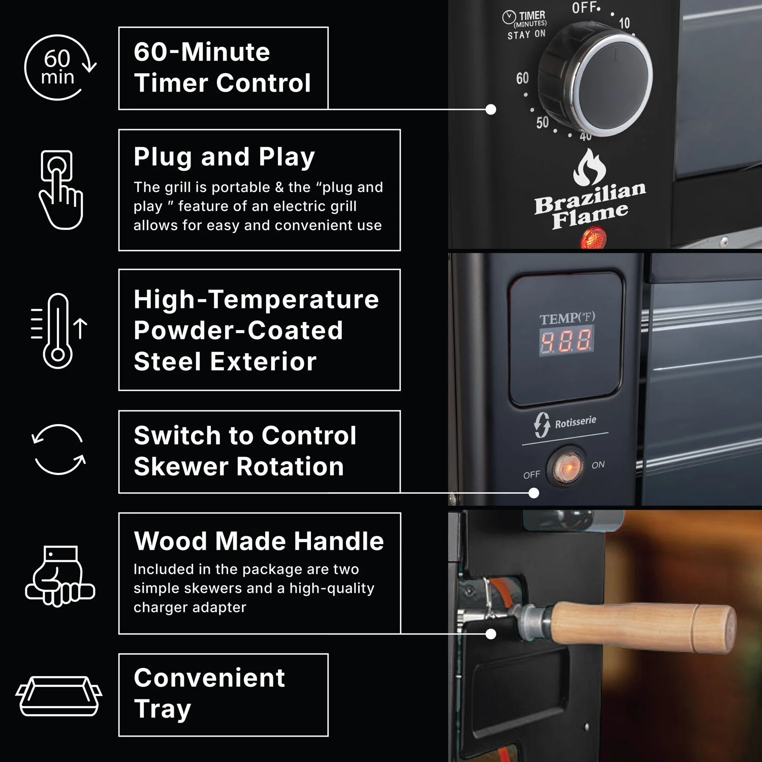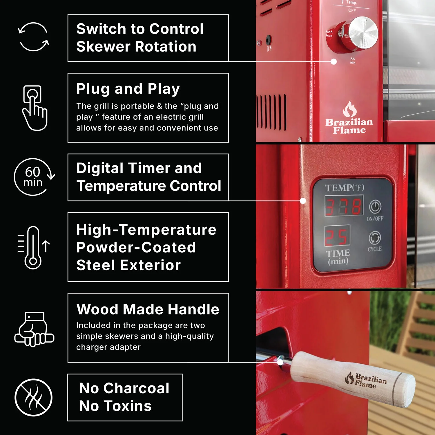 - Enjoy authentic Brazilian barbeque at home: The Brazilian Flame is your personal steakhouse, allowing you to cook and enjoy authentic Brazilian barbecue at home for the first time, just like the "churrasco" you'd find in Brazil or any Brazilian steakhouse.