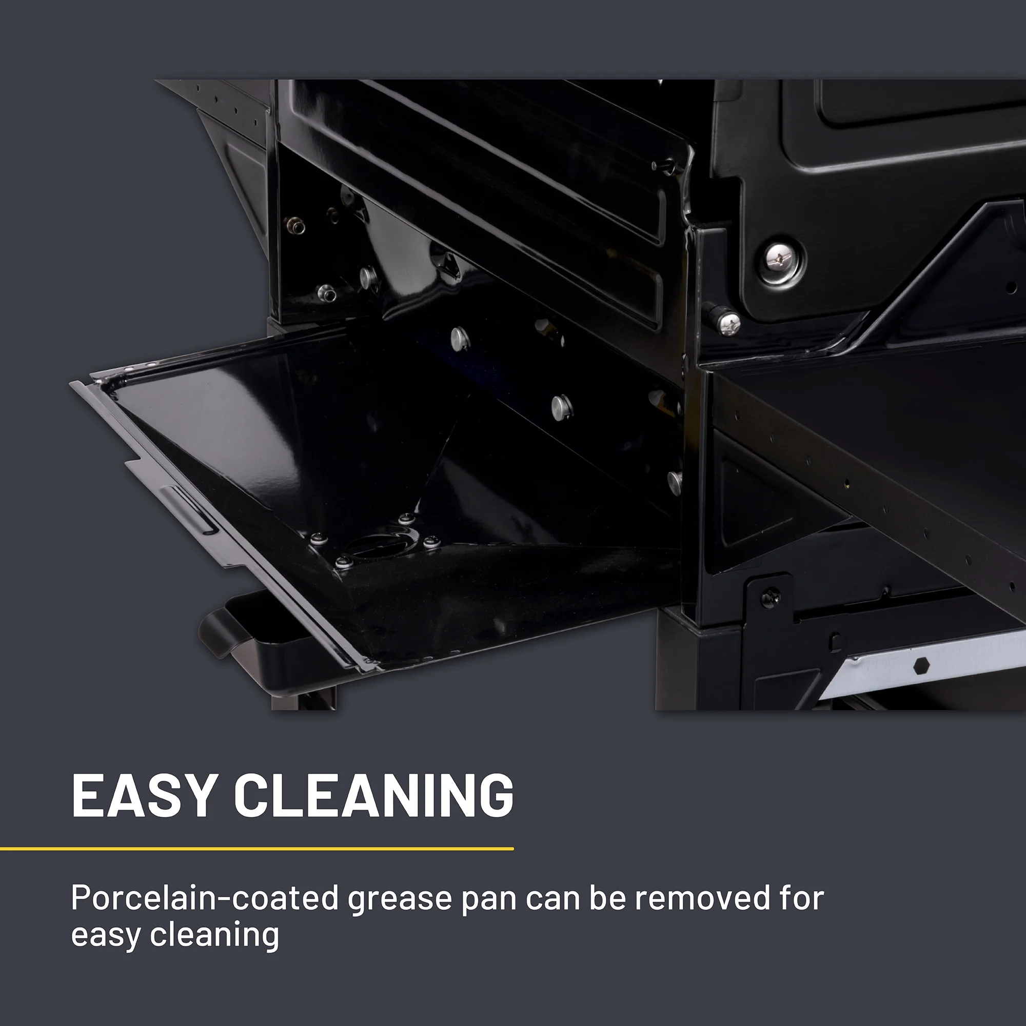 - CLEANING: Durable porcelain-coated grease pan can be removed for easy cleaning