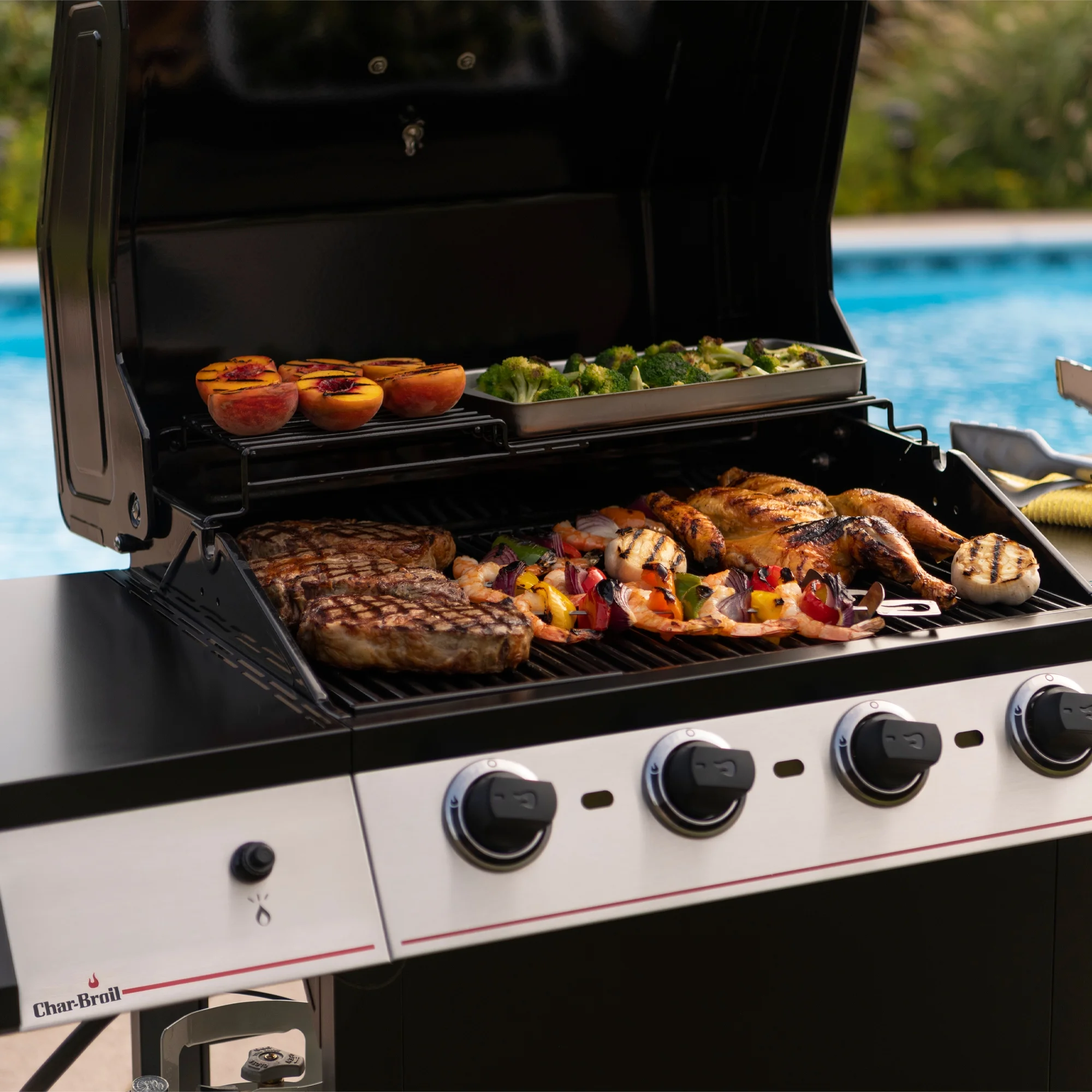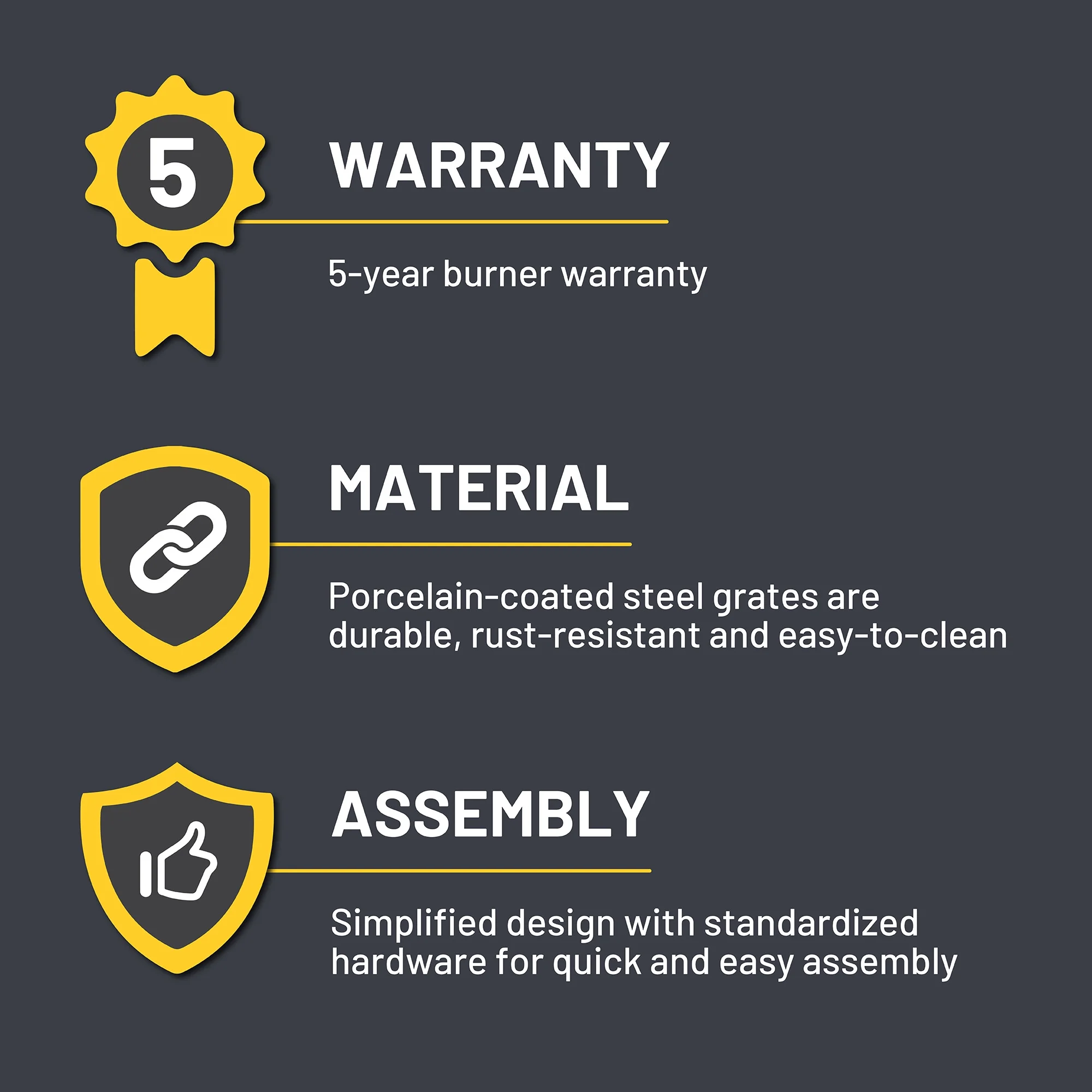 - GRATES: Porcelain-coated steel grates are durable, rust-resistant and easy-to-clean